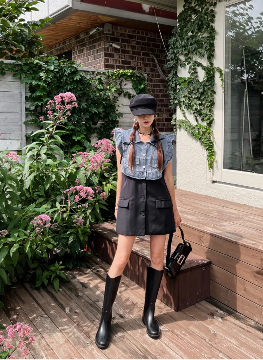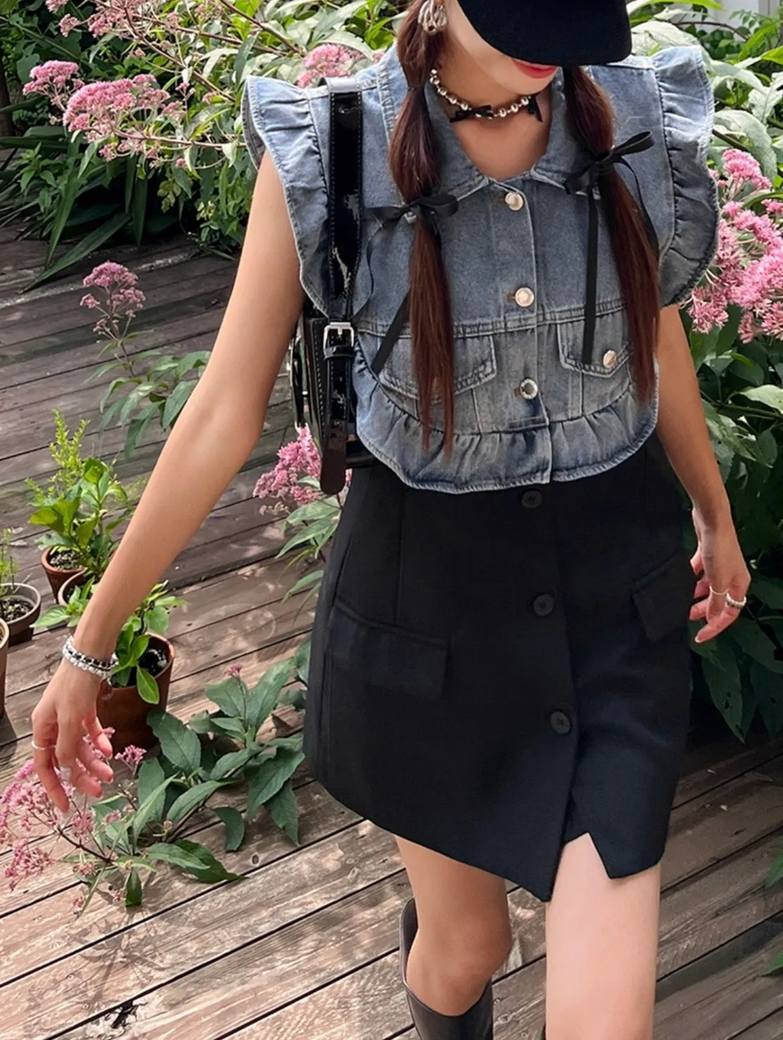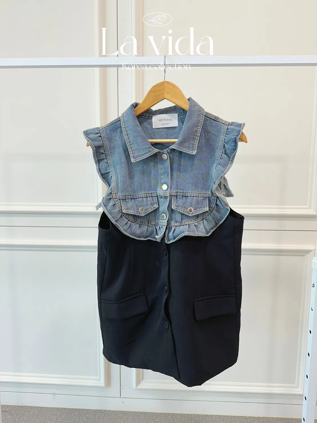 CS695推薦款薄款荷葉滾邊牛仔拚接背心式外套 線上價$950 官網價$980