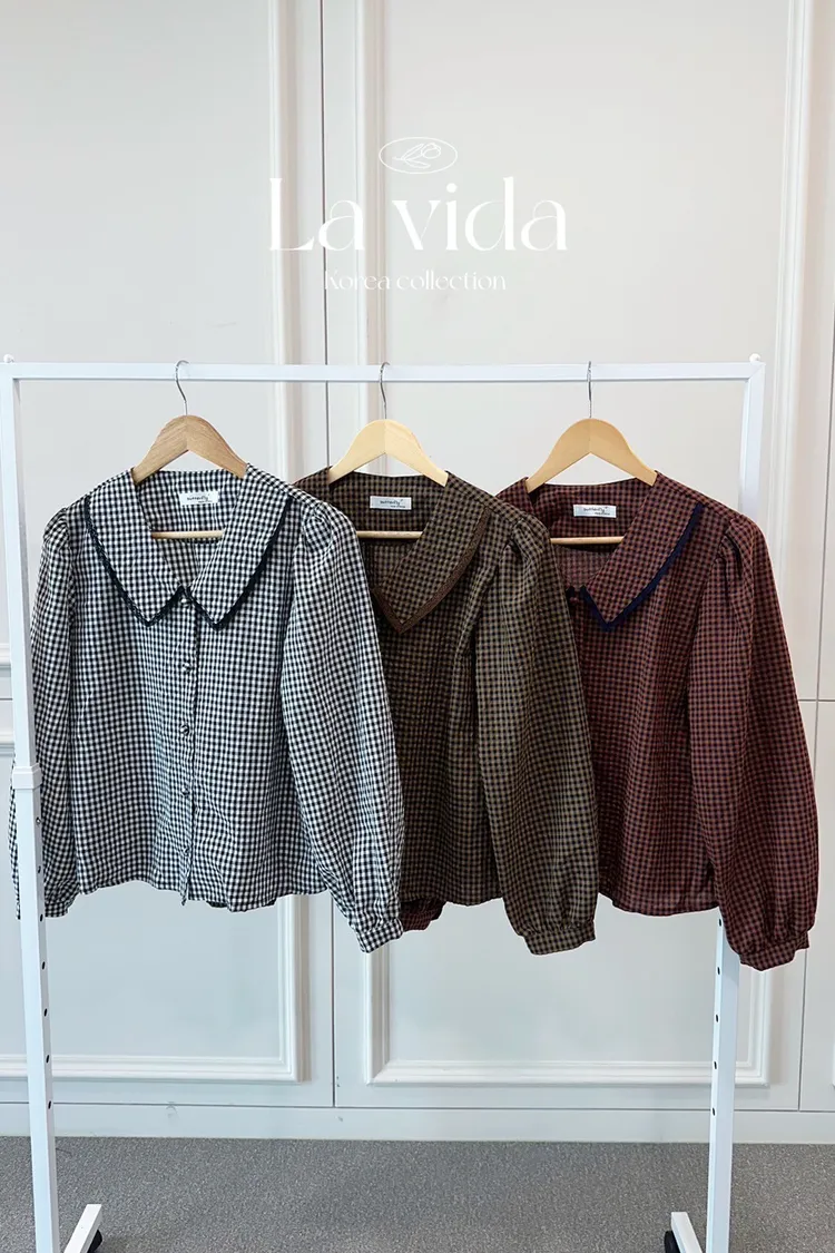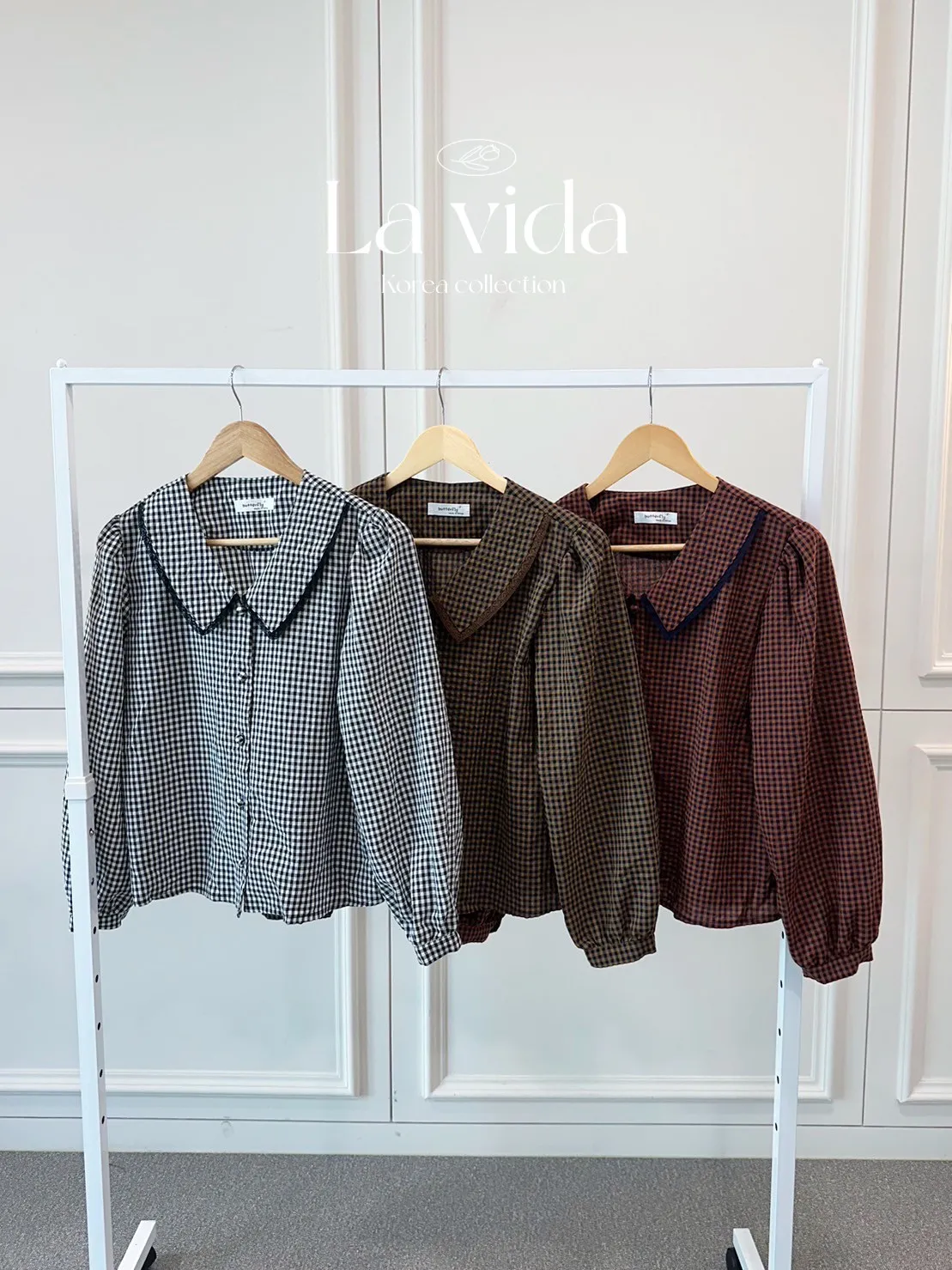 CS713薄款布蕾絲滾邊細格紋翻領上衣 (butterfly) 綠 咖 黑 線上價$710 官網價$740