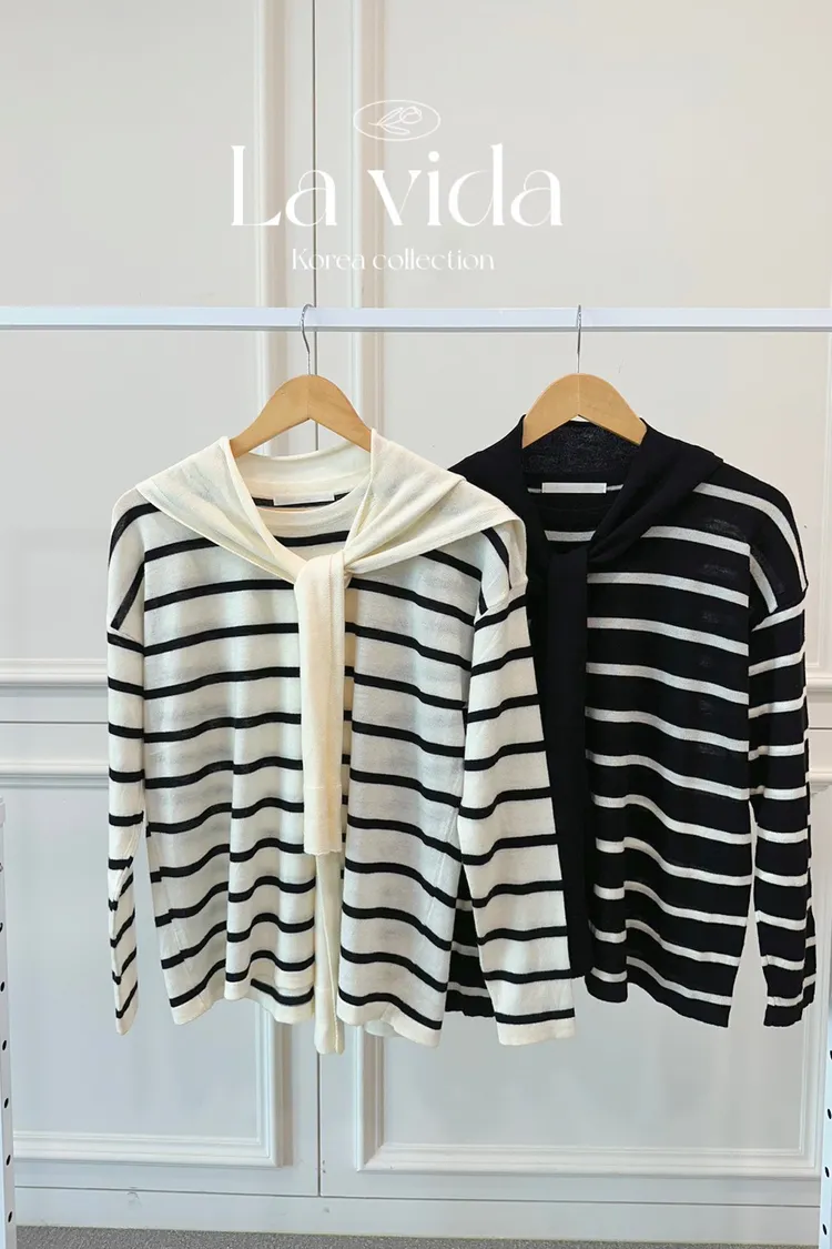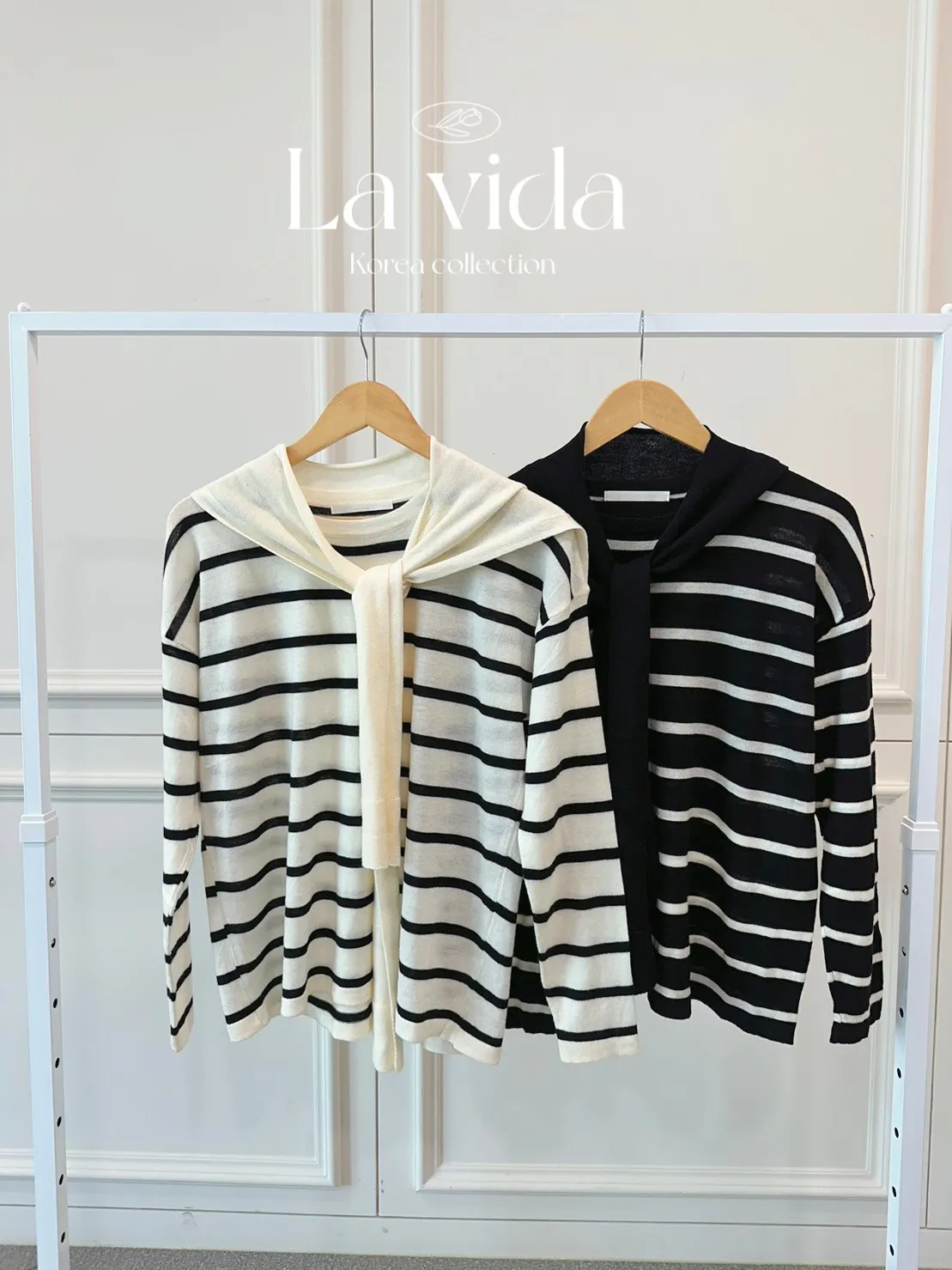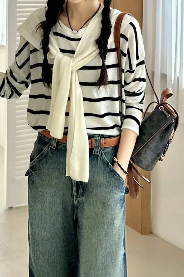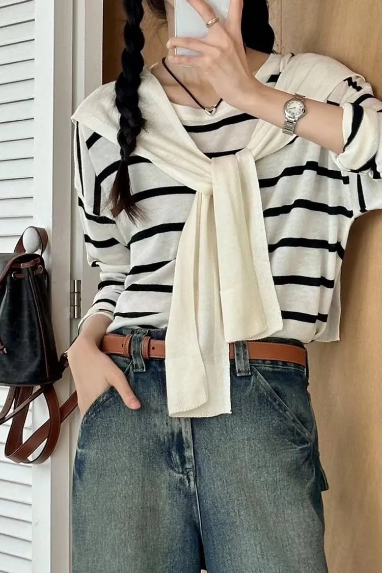 CS722超舒服披肩條紋薄款休閒套裝(上衣+披肩) 白 黑 線上價$720 官網價$750