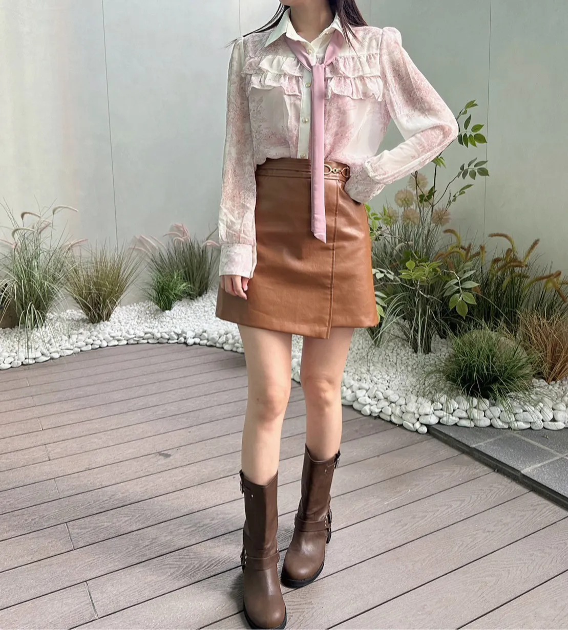 CS726復古水墨荷葉胸綁帶雪紡襯衫 粉 黑 線上價$860 官網價$890