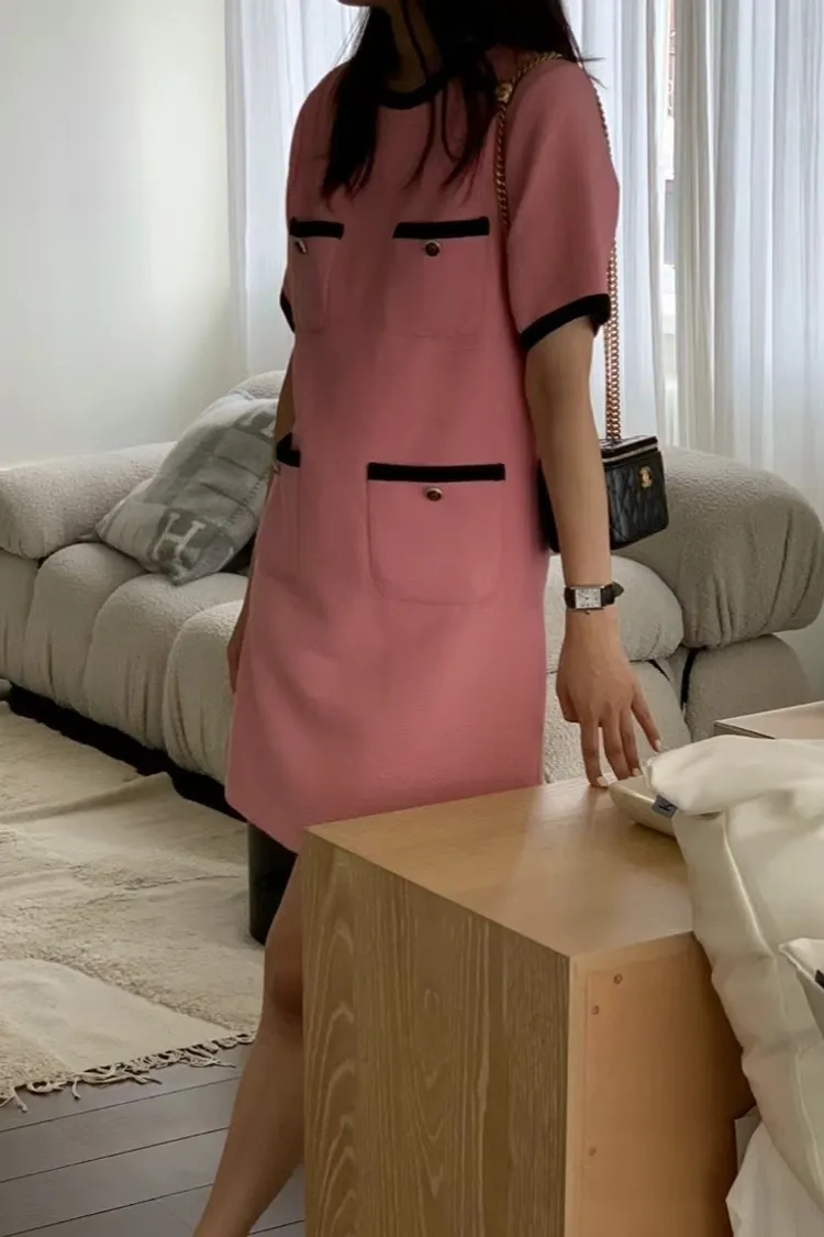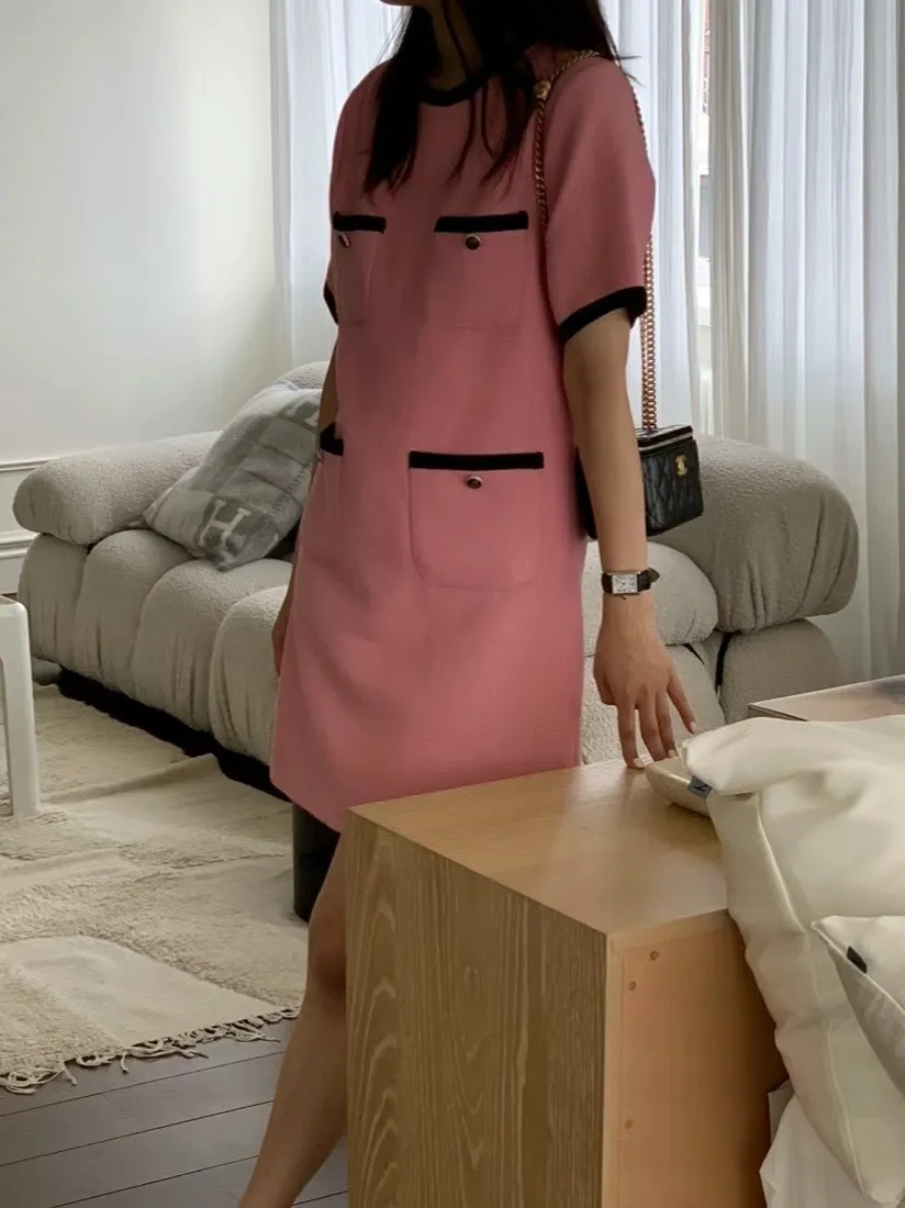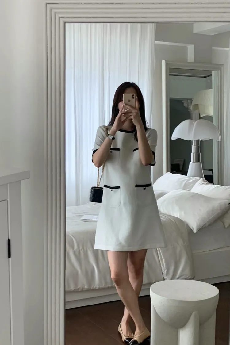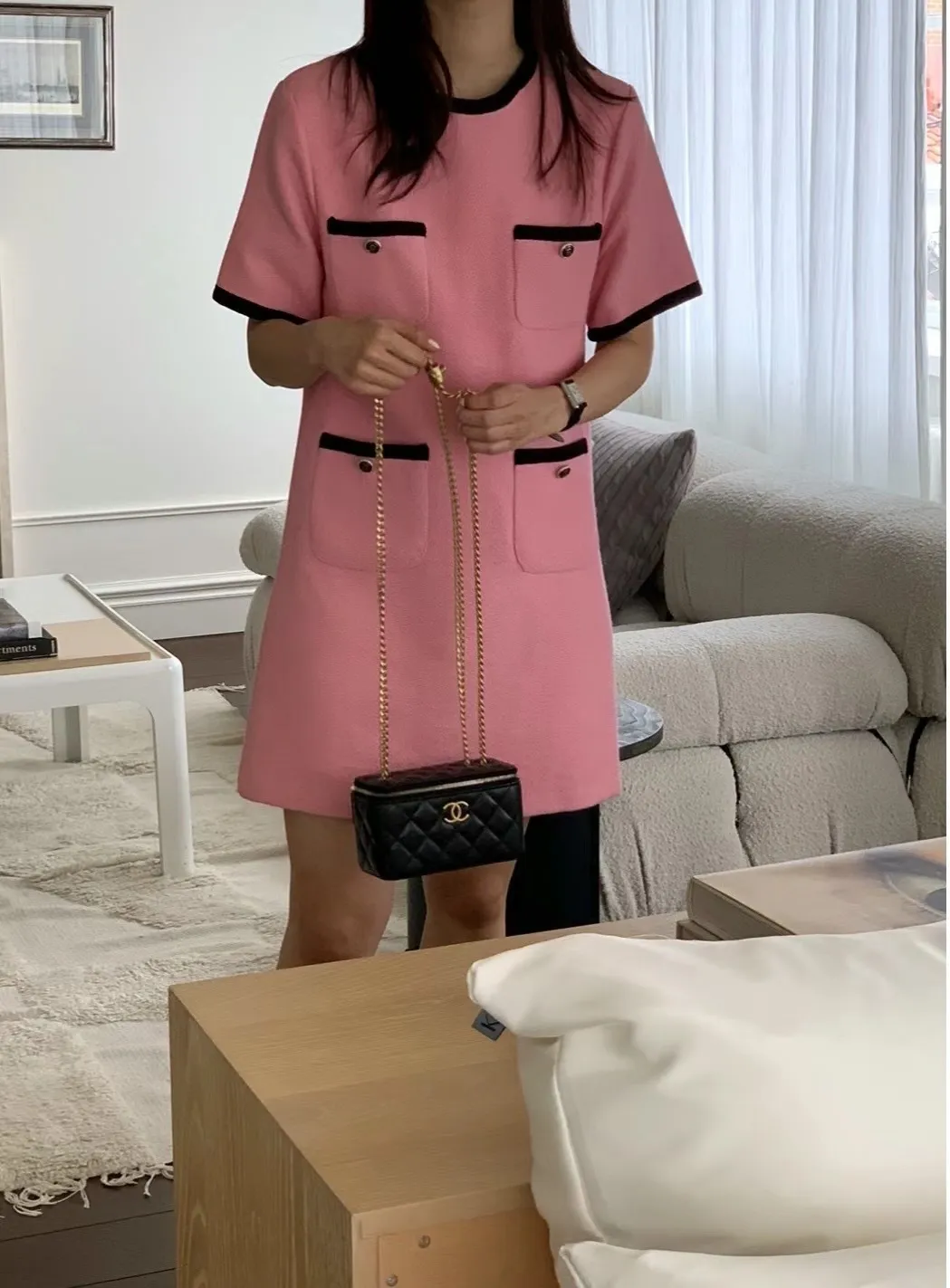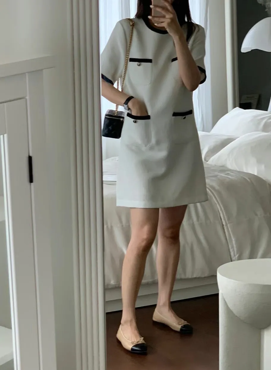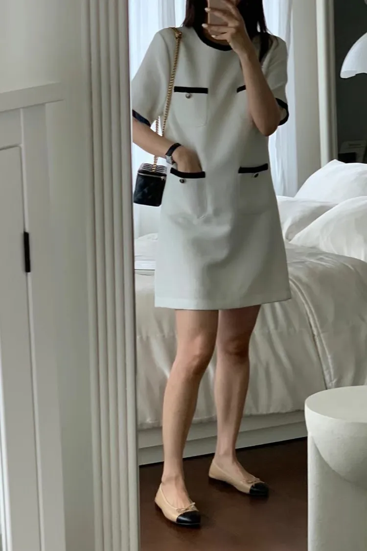 CS812許願款小香風四口袋連身洋裝 白 粉 黑 線上價$1760 官網價$1790