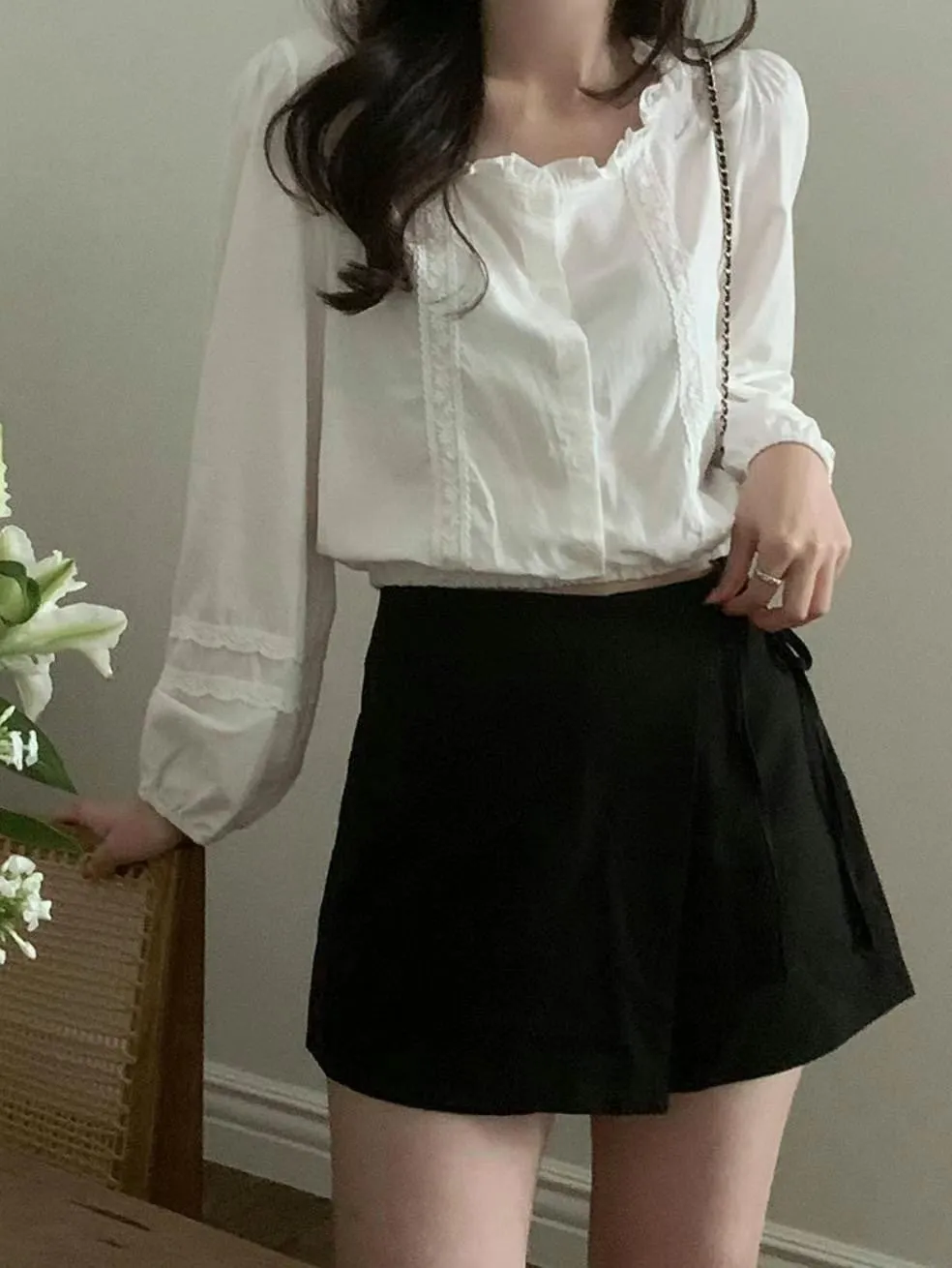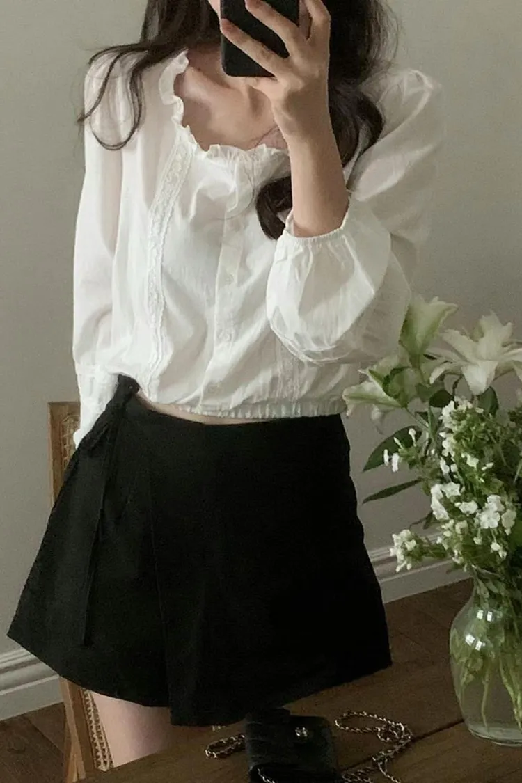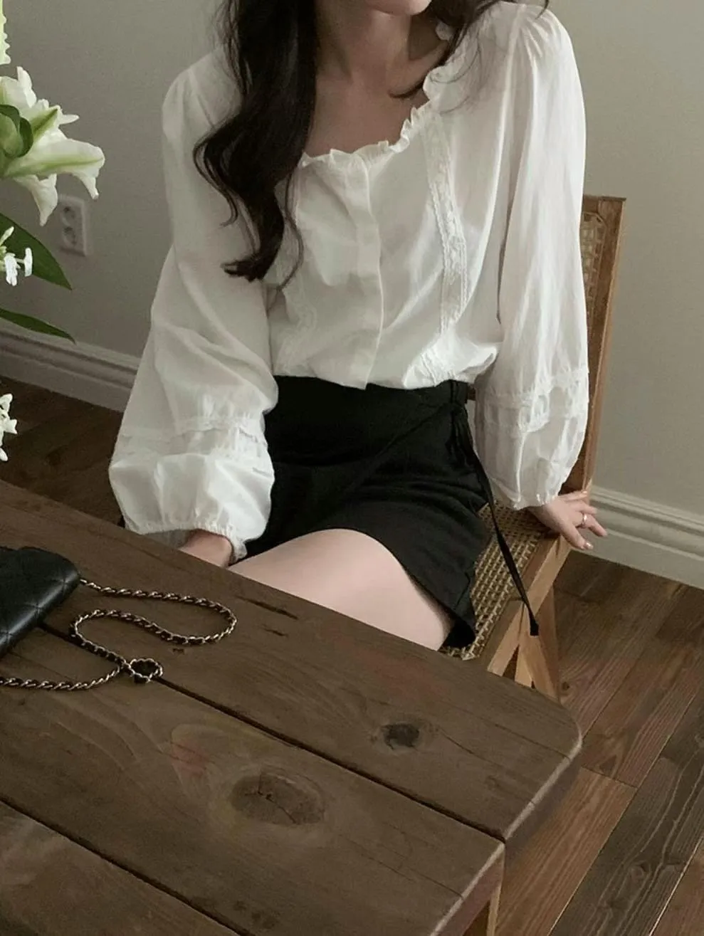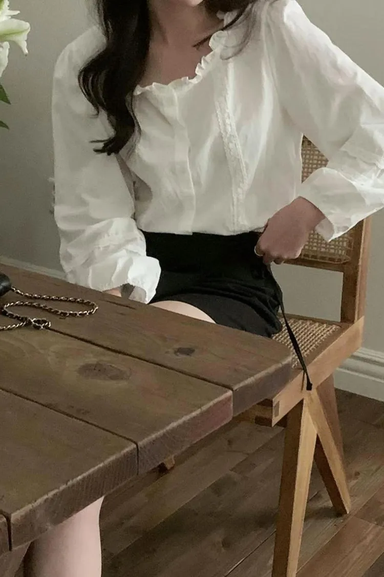 CS883薄款荷葉領棉蕾絲鑲嵌美上衣 白 黑 線上價$790 官網價$820