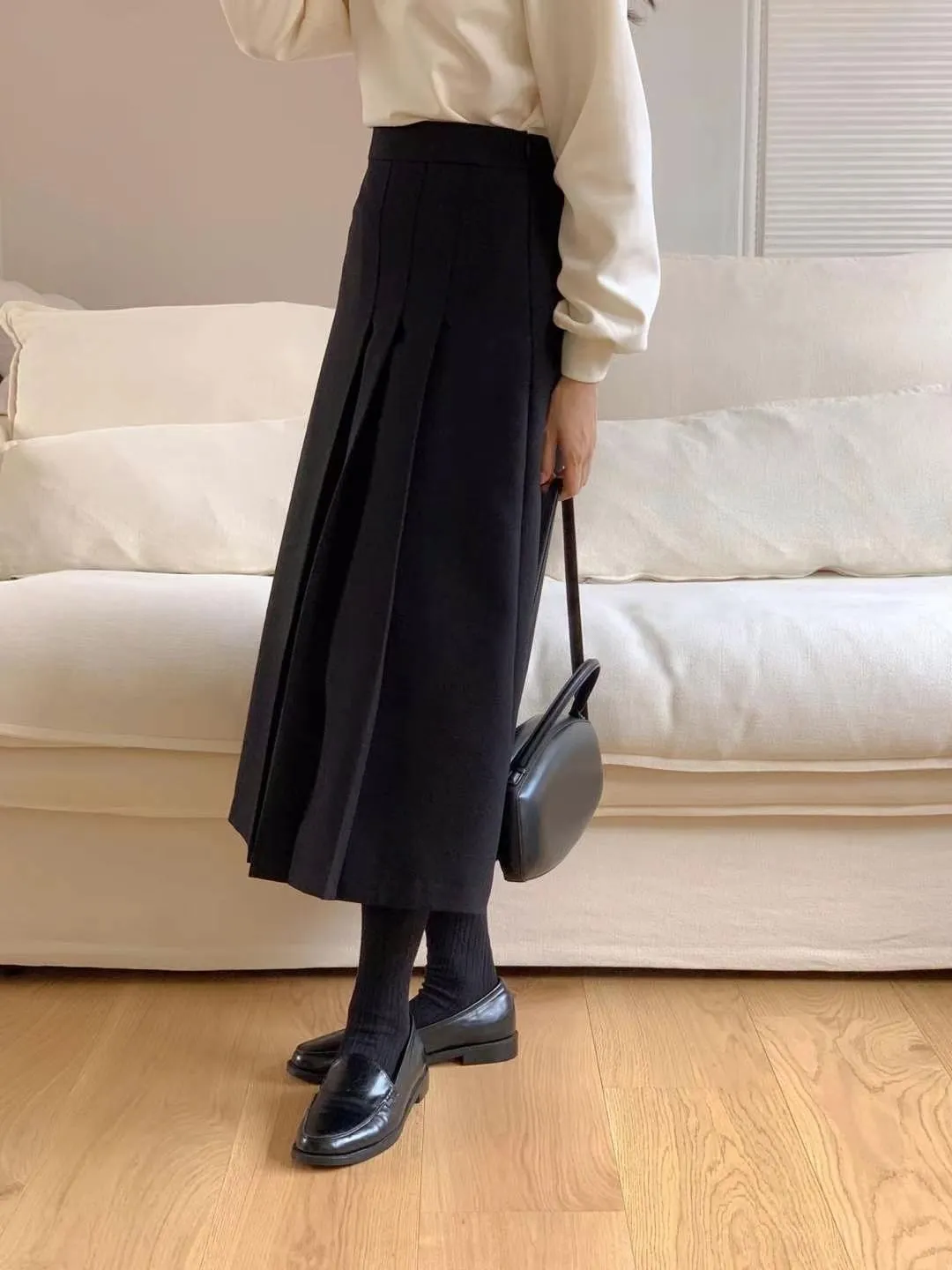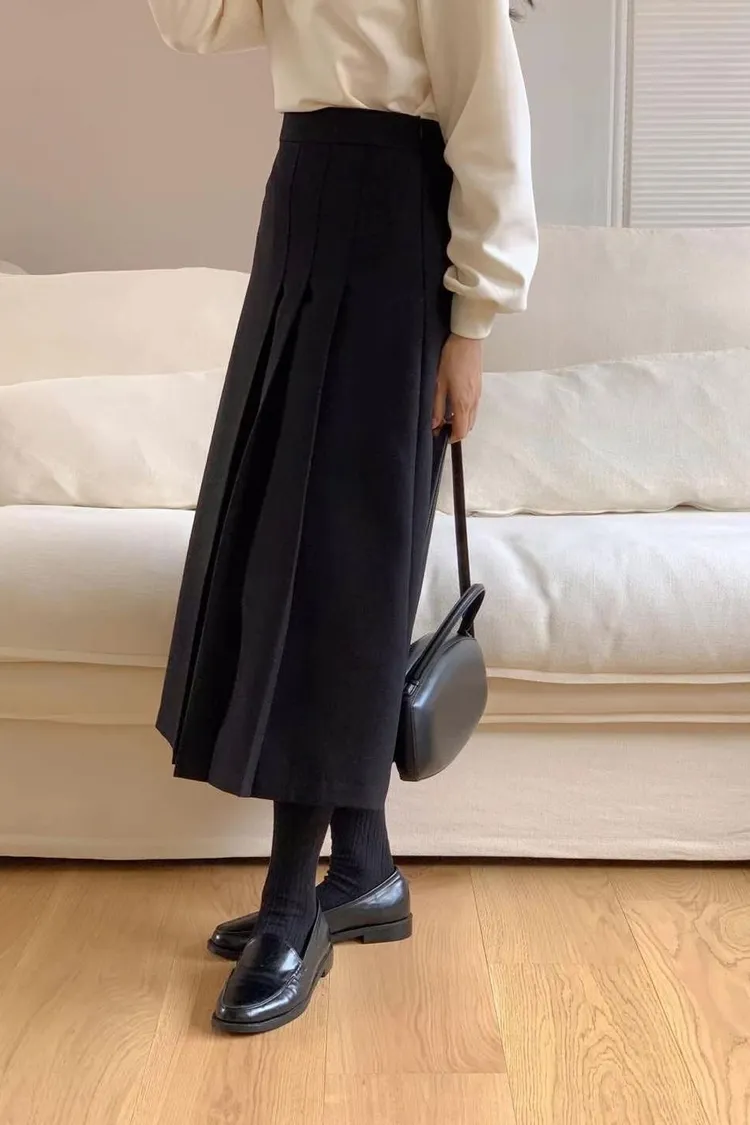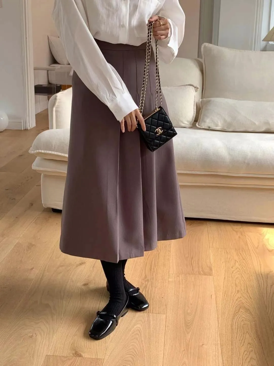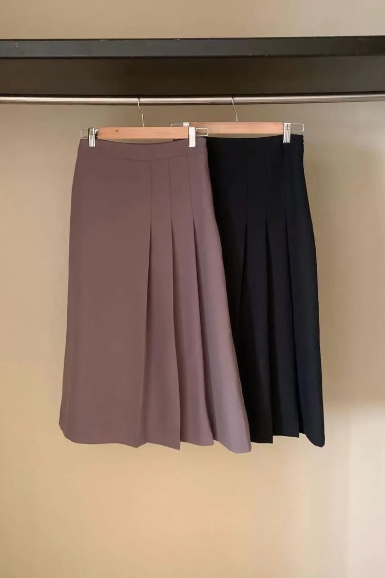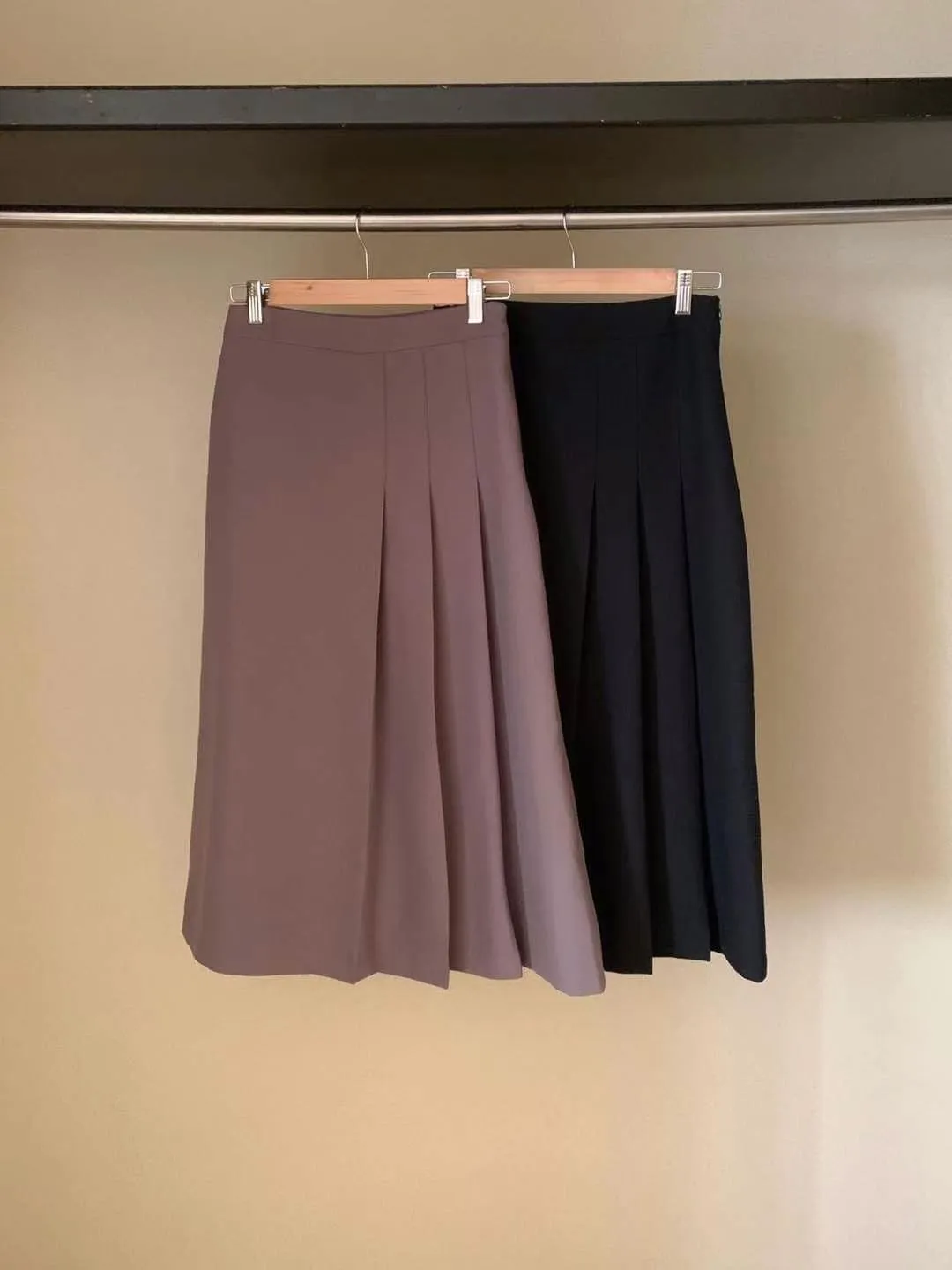 CS885單面側寬百褶微光澤質感裙 咖 黑 S M 線上價$879 官網價$899