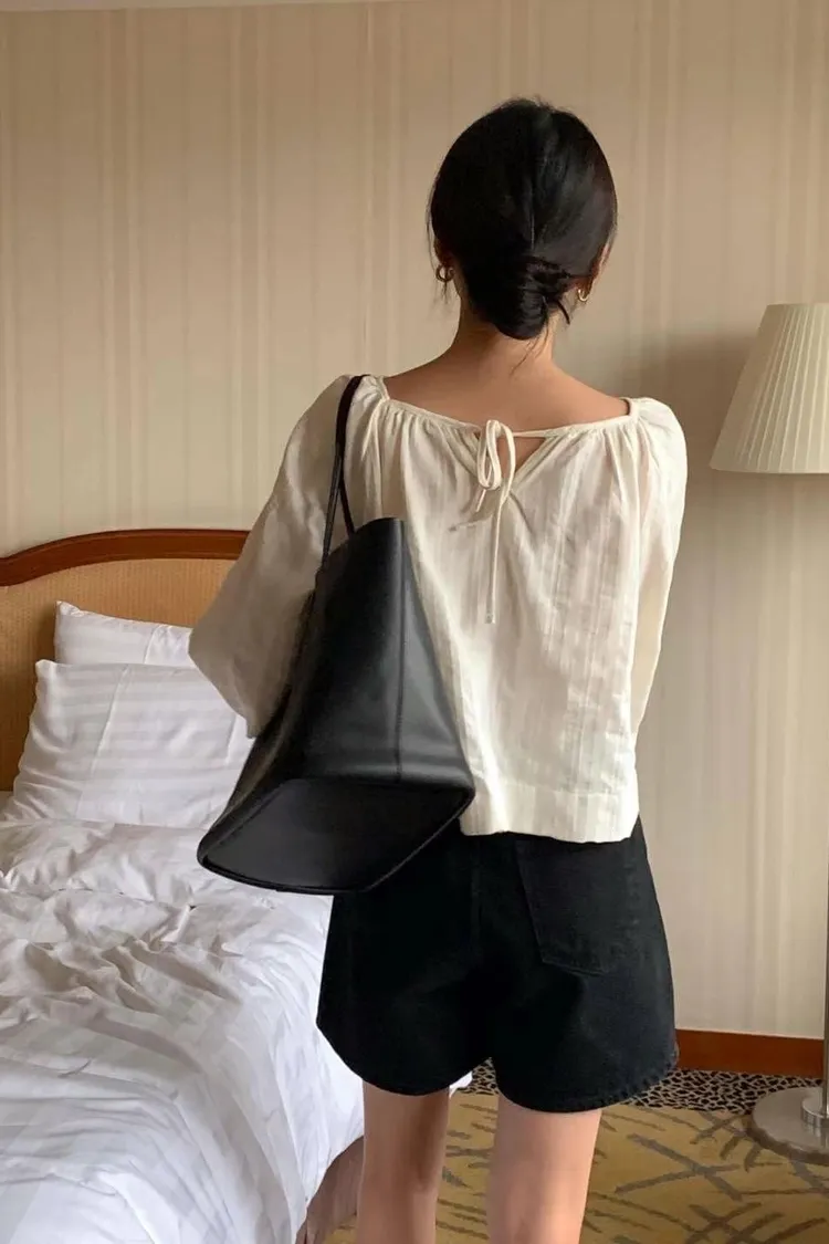 CS890精緻細條紋綁帶兩面穿上衣 米 黑 線上價$820 官網價$850