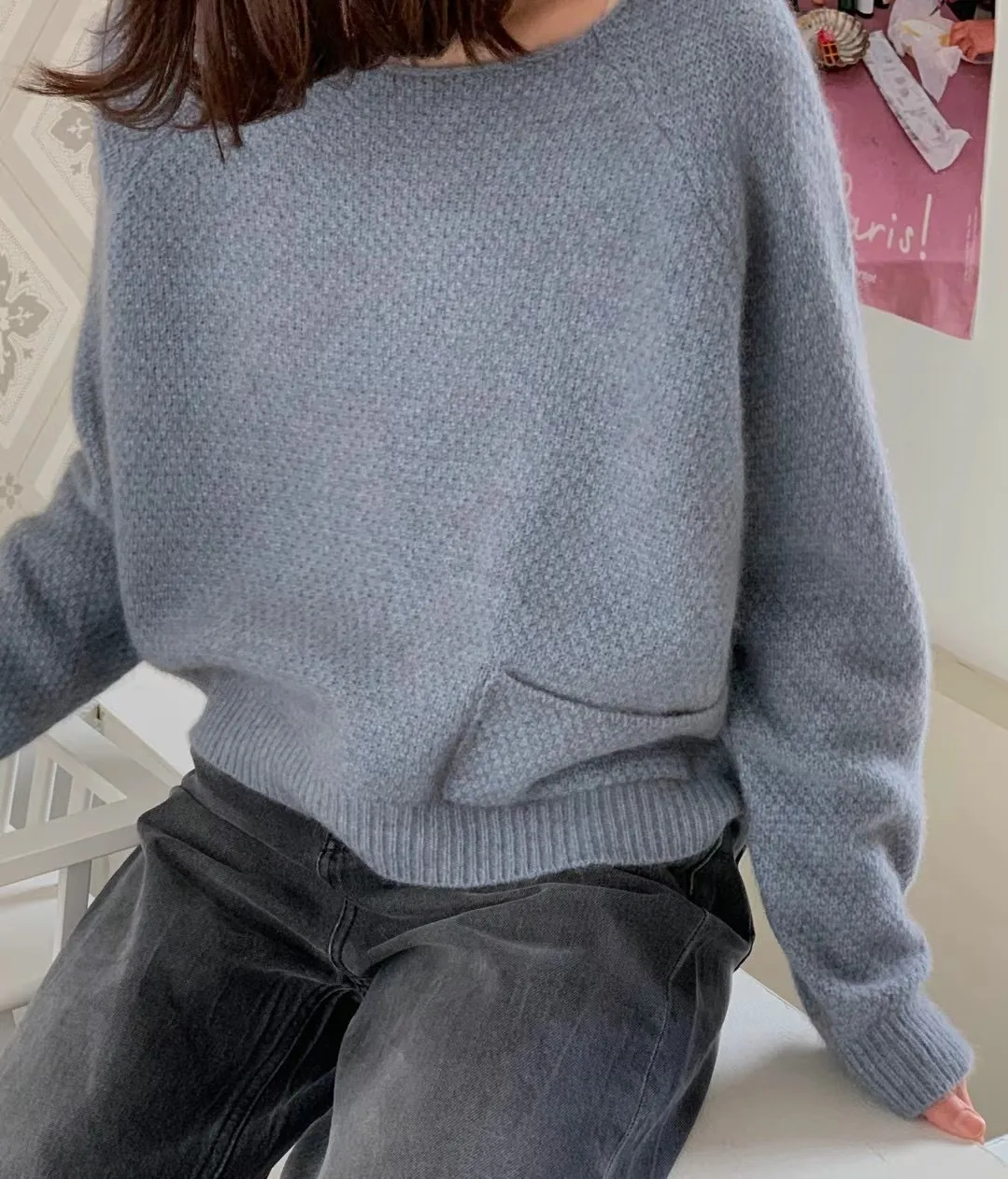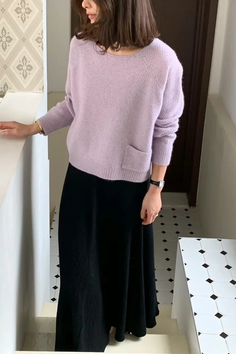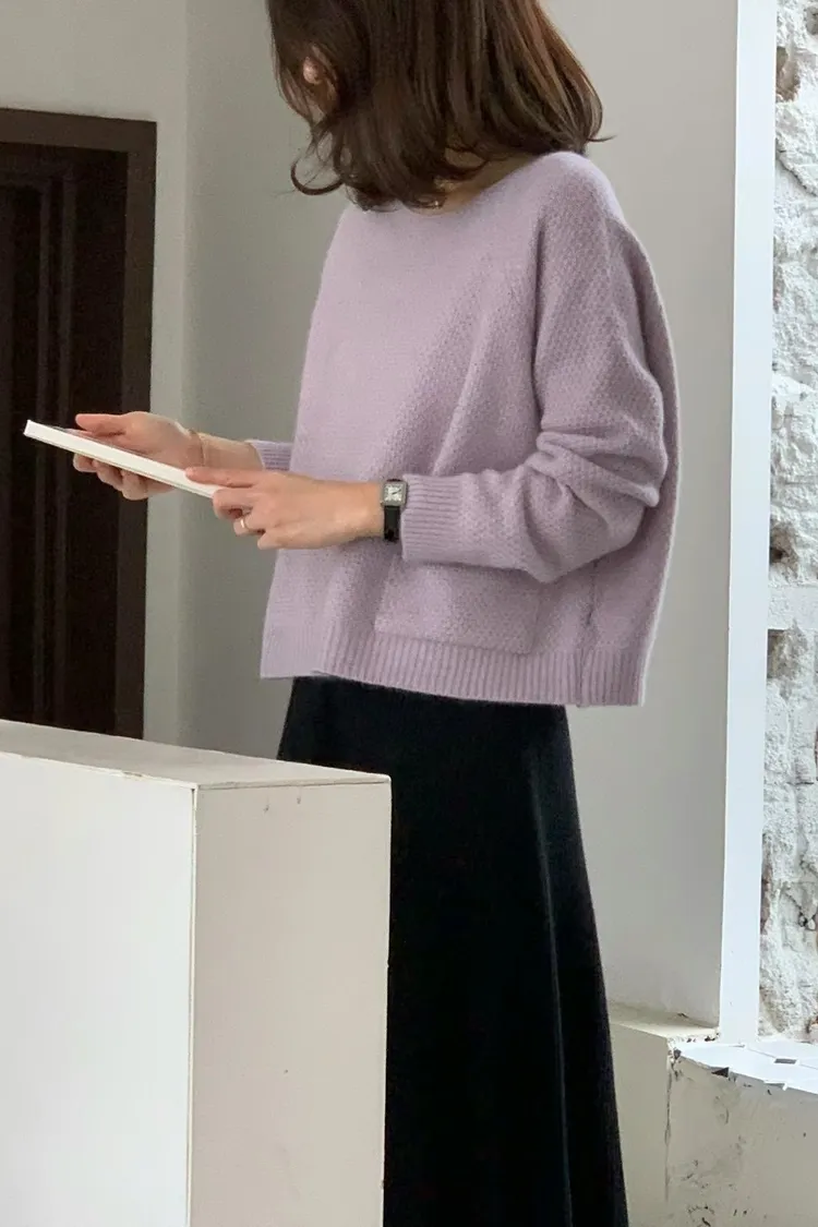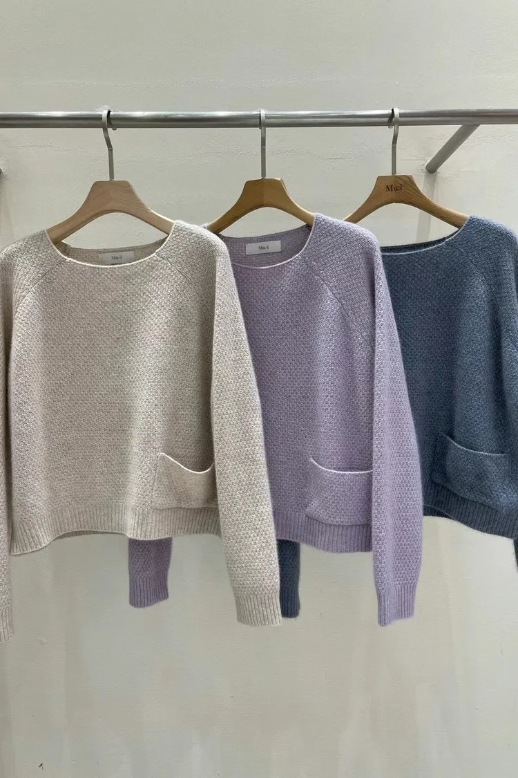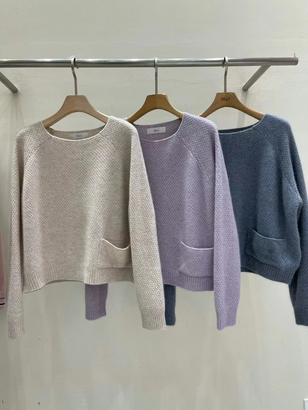 CS956單口袋質感寬圓領針織衫 米 紫 藍 線上價$1300 官網價$1330