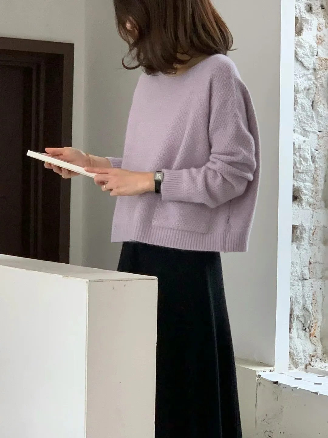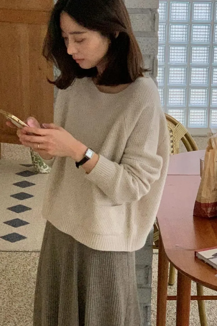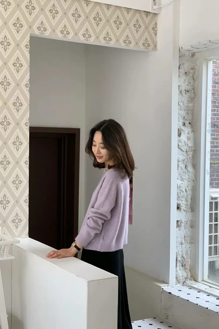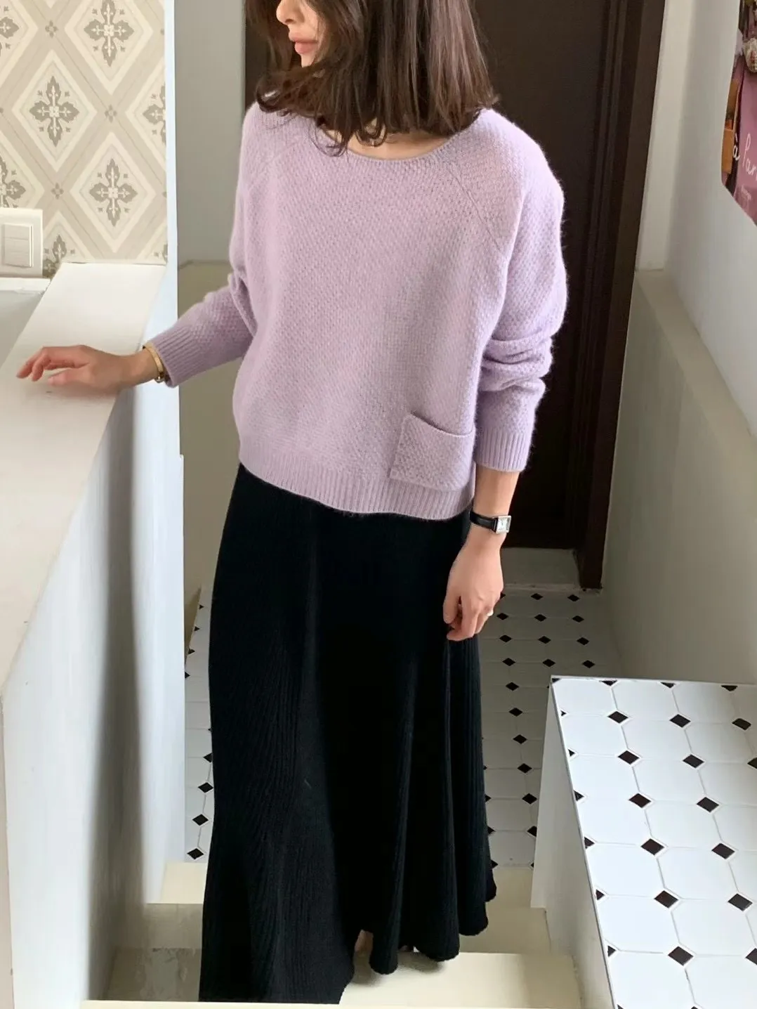 CS956單口袋質感寬圓領針織衫 米 紫 藍 線上價$1300 官網價$1330