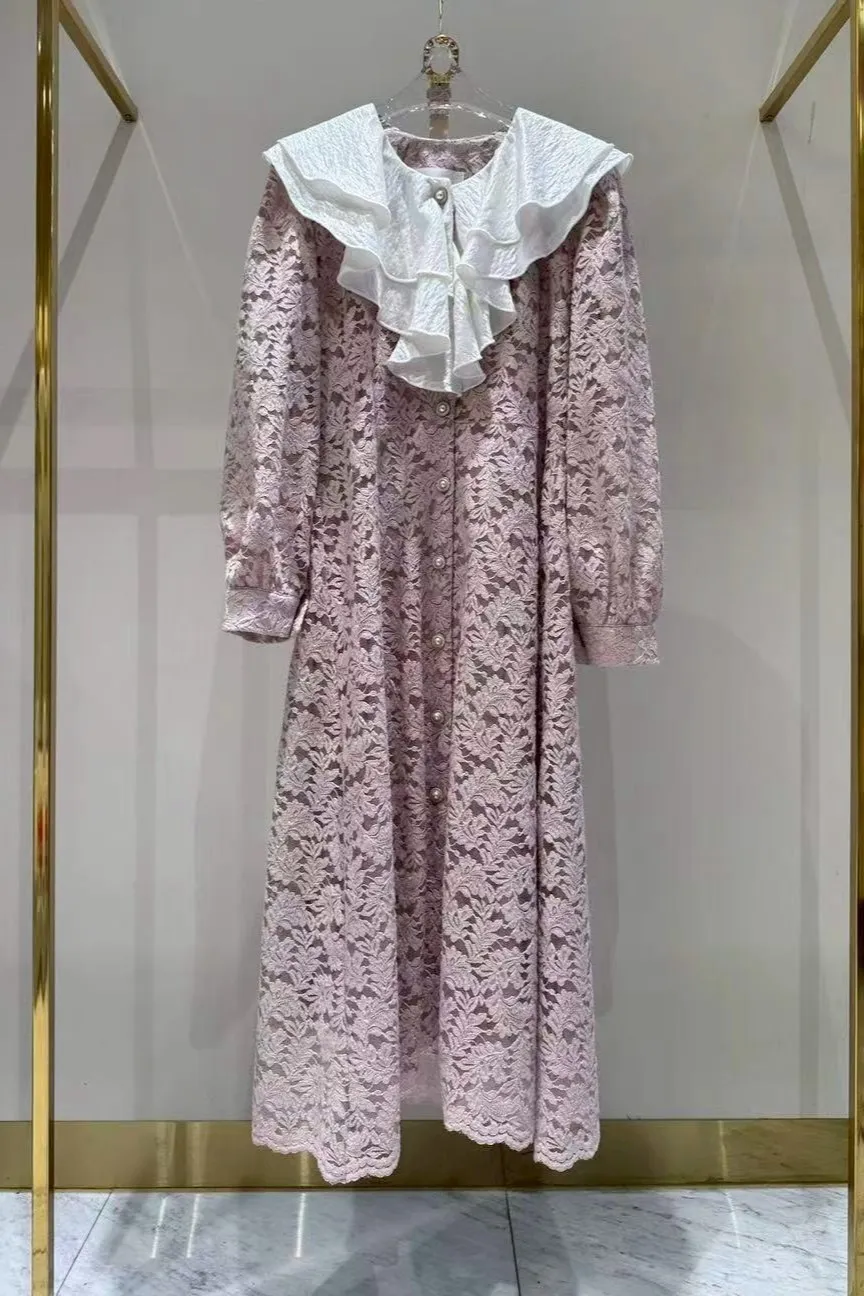 棉+聚酯 柔美荷葉領 透光蕾絲高級面料 附珍珠腰帶 有內裡