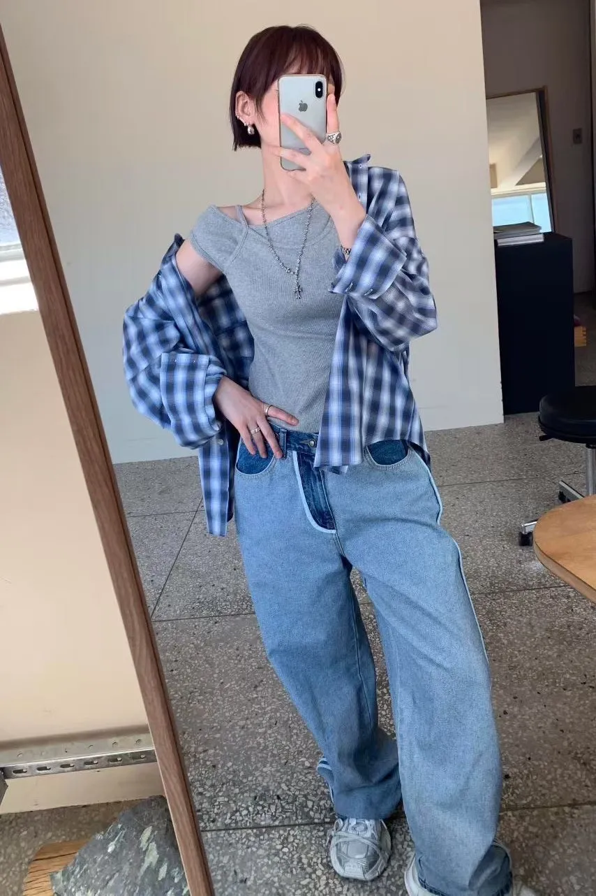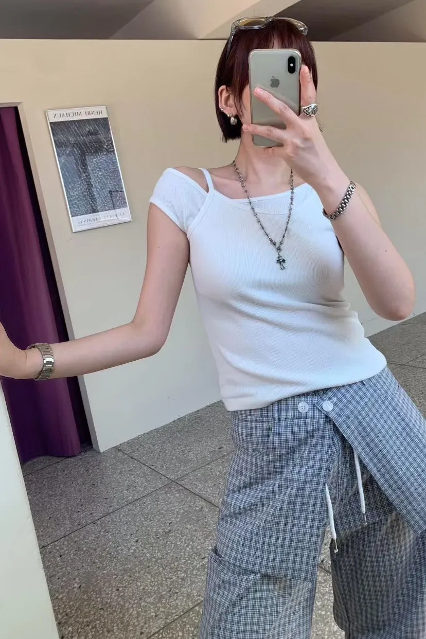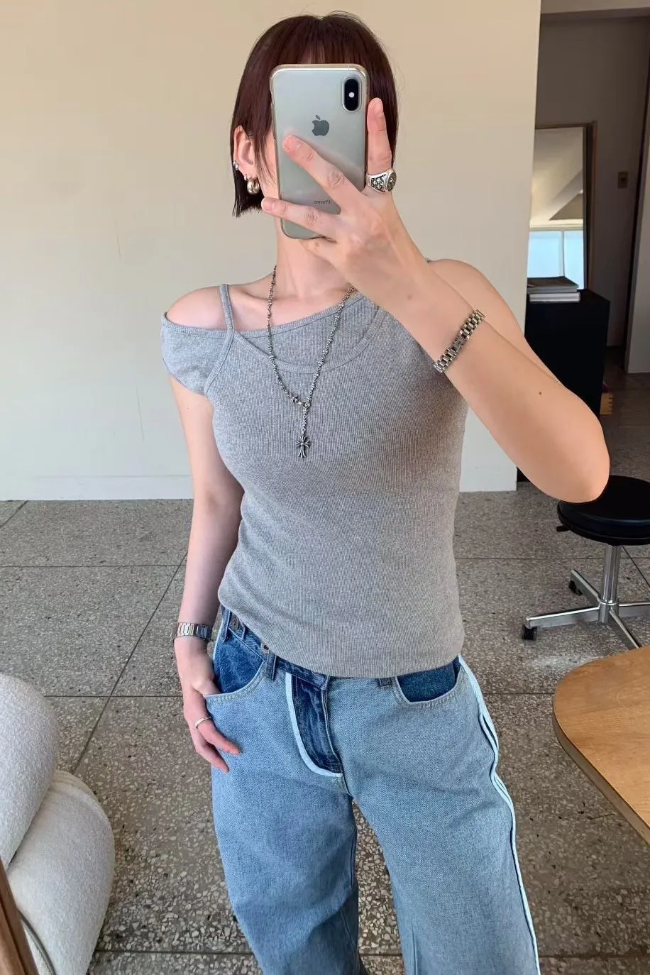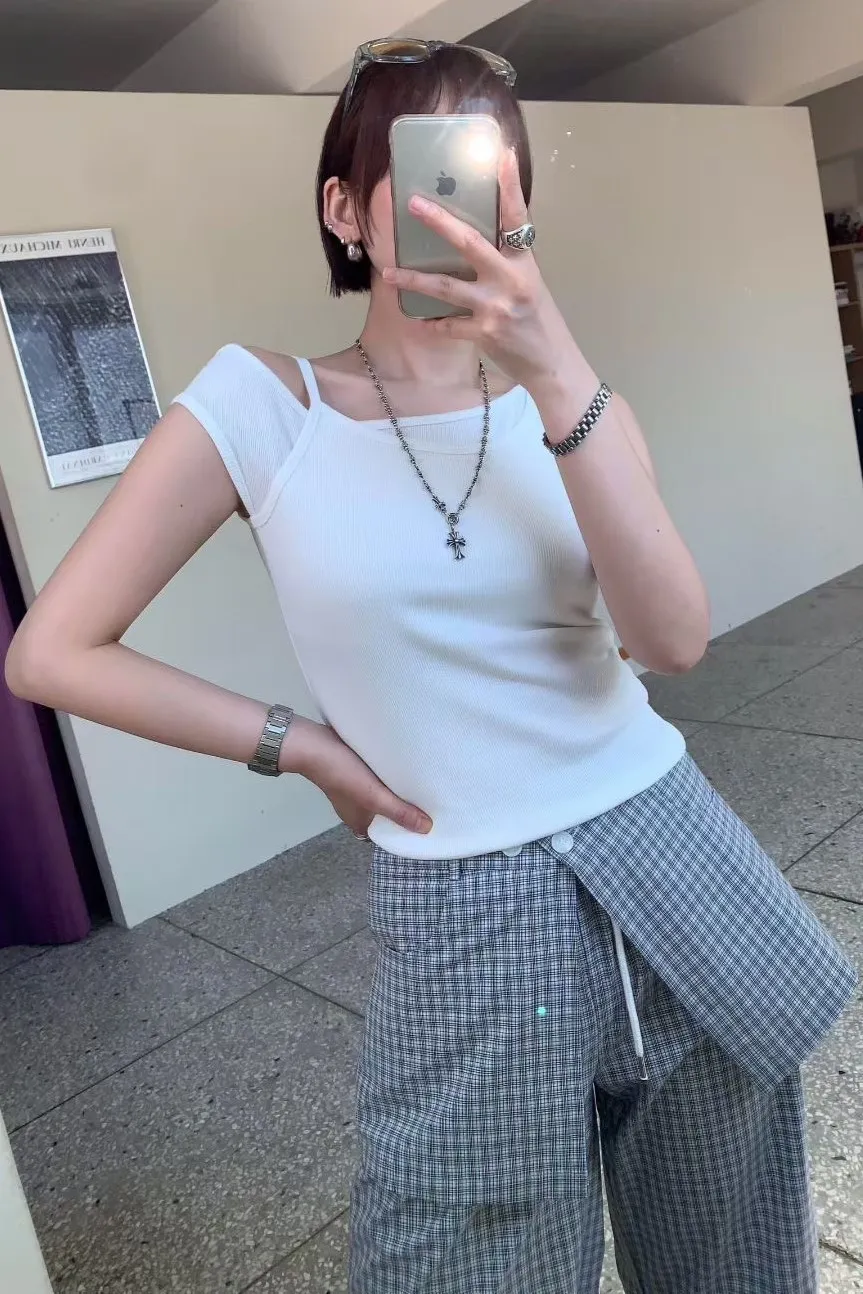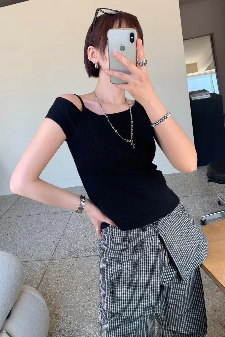 棉+彈力 薄款透氣有彈性 小露鎖骨 假兩件 不透有半截內裡 夏天合適