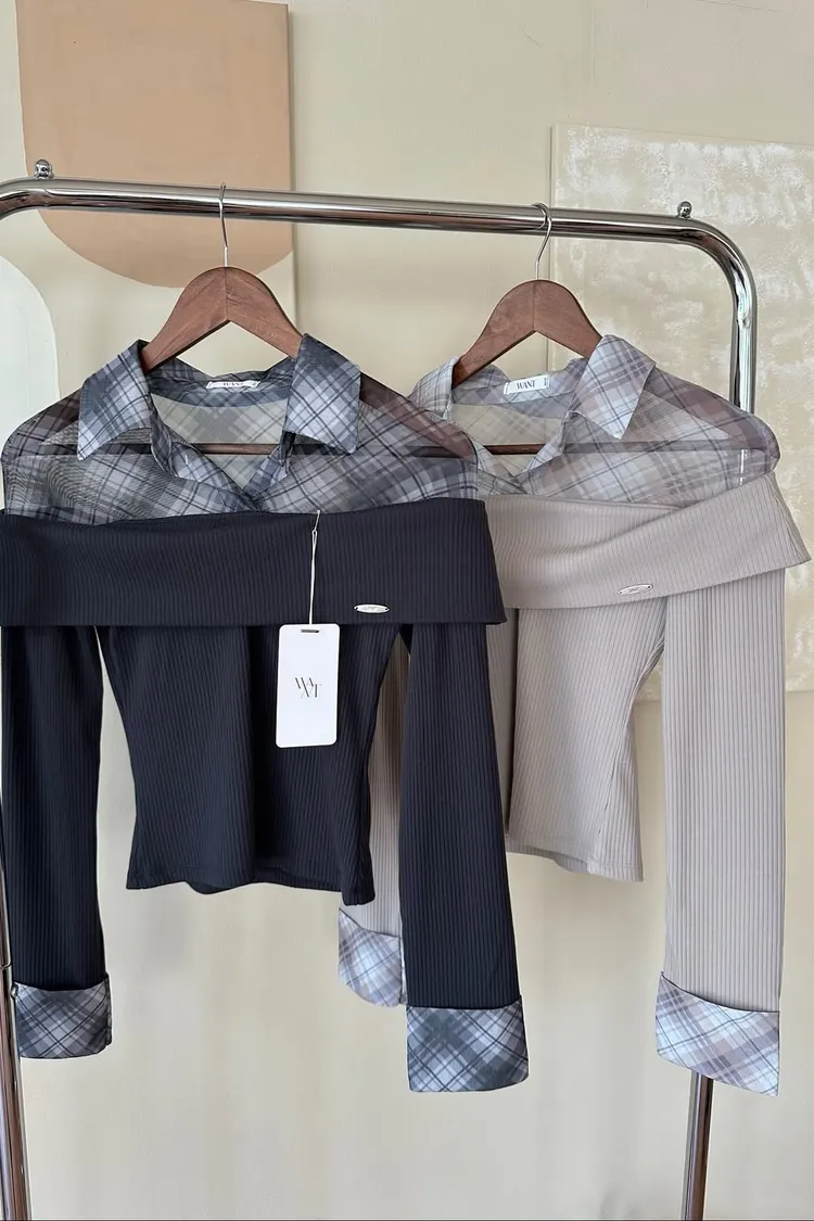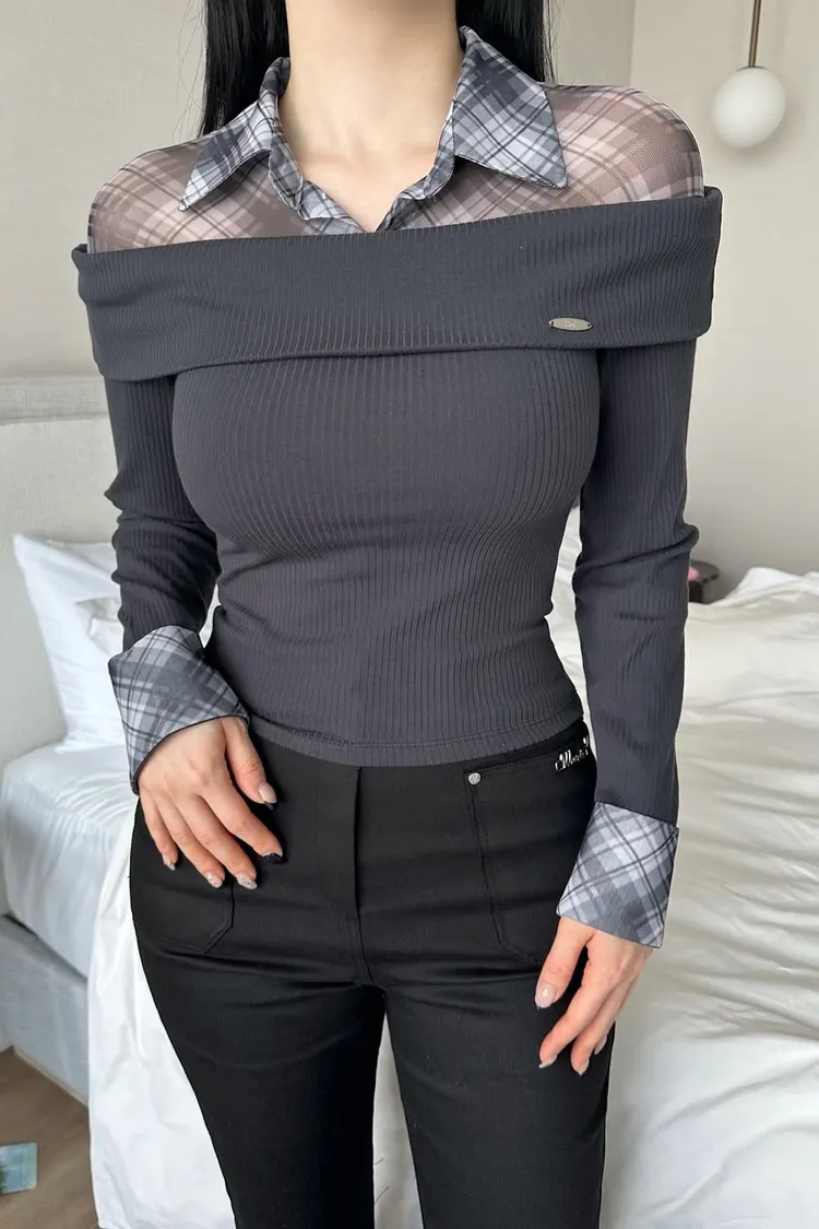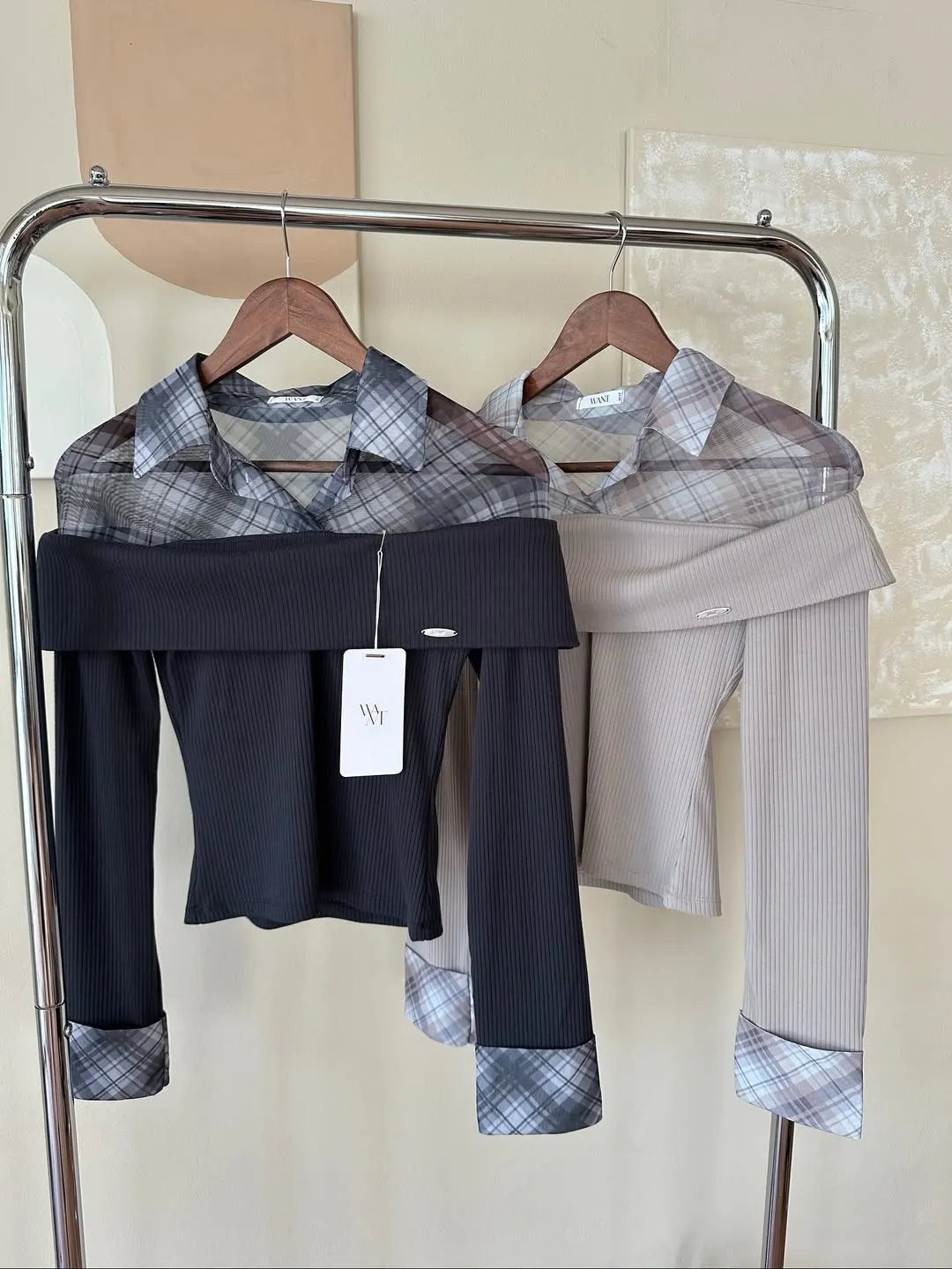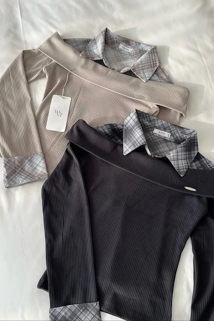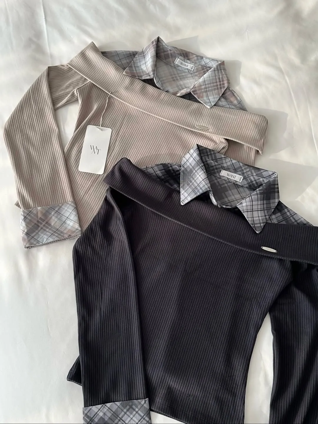 雪紡+棉+聚酯 針織一字領 假兩件 胸前小標