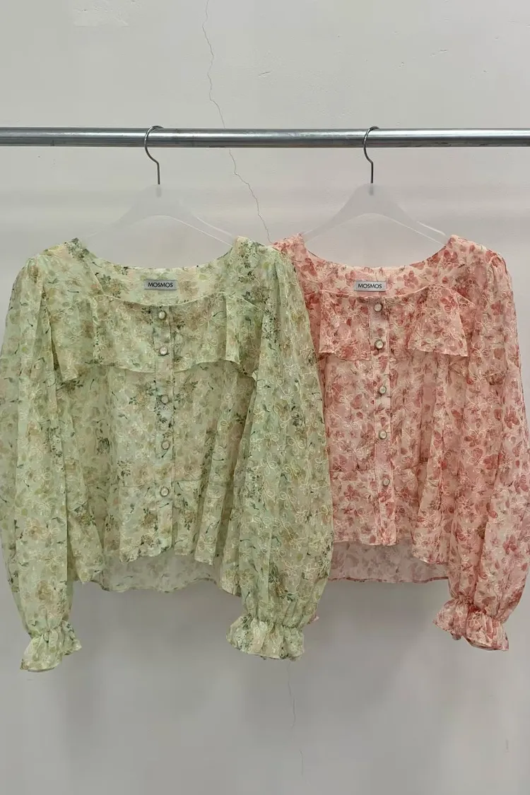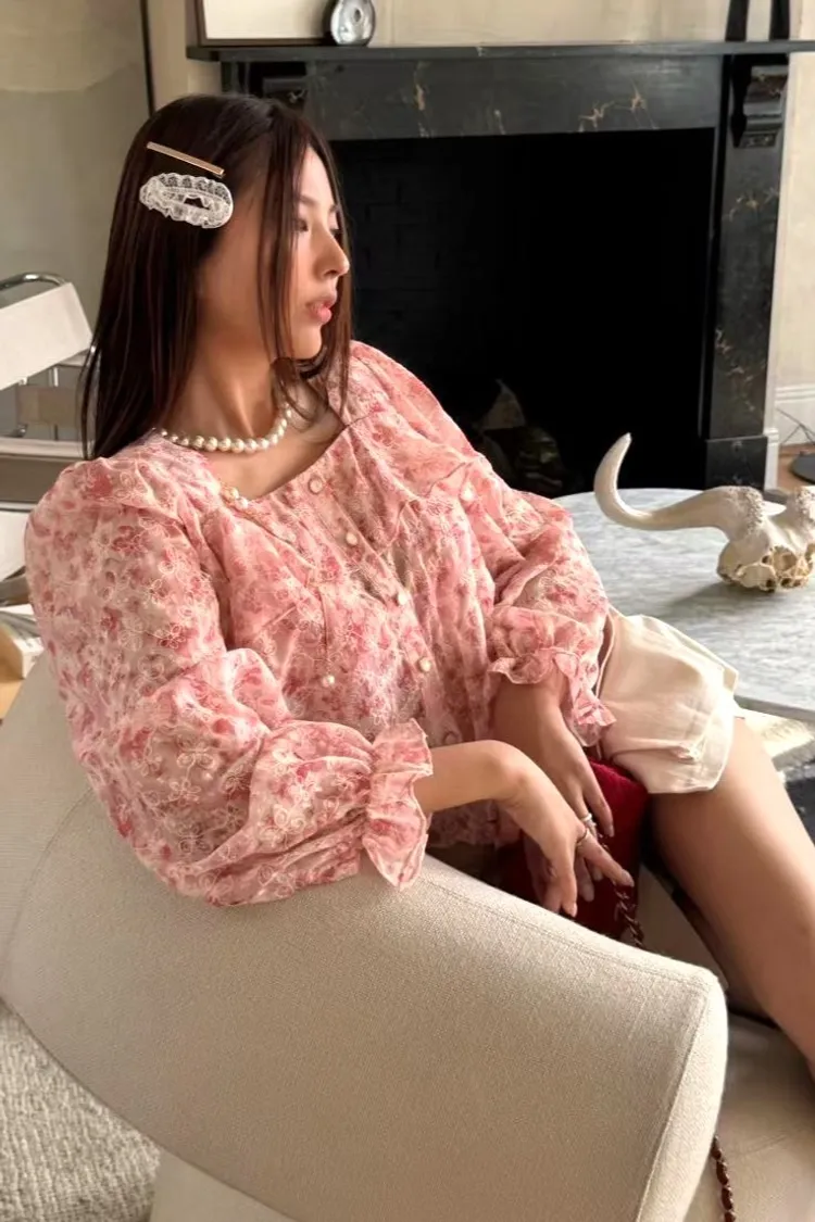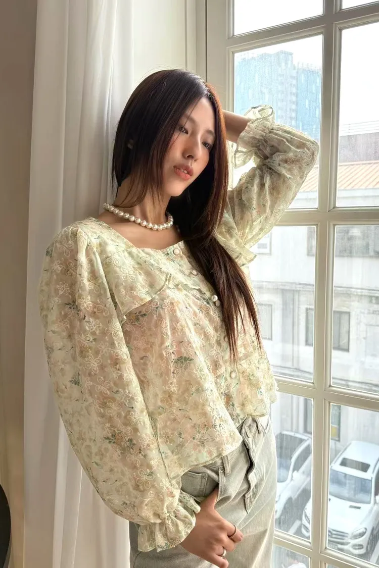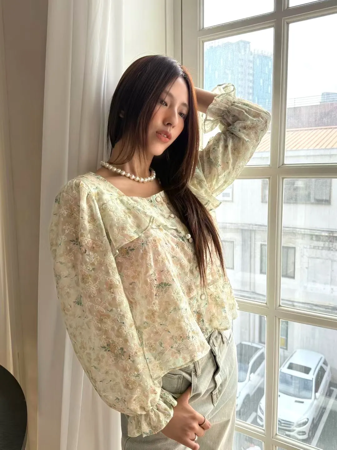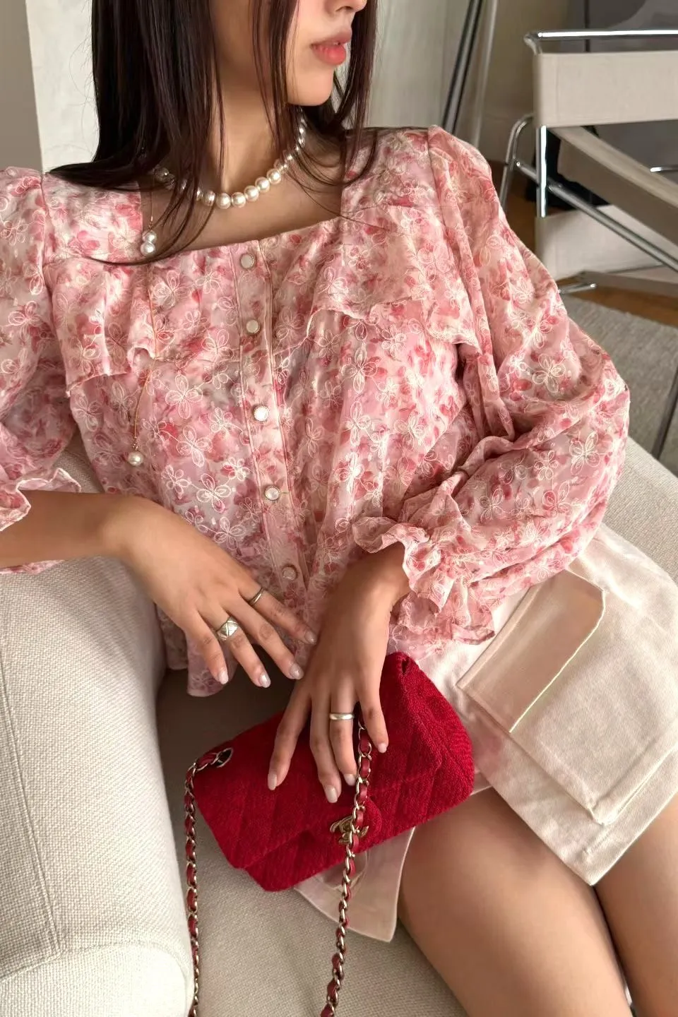 雪紡 親膚舒適 方領設計 精緻美釦 花苞鬆緊袖口 透光輕盈