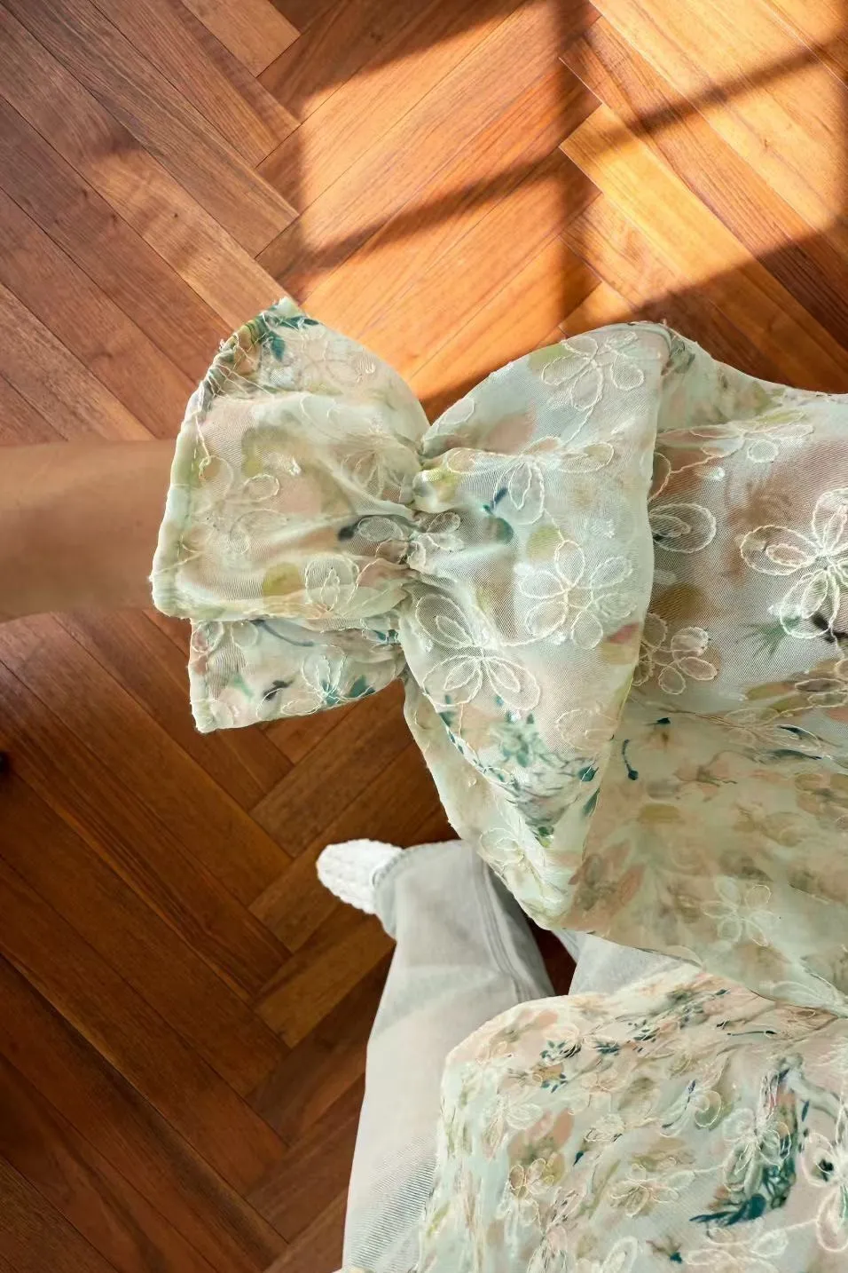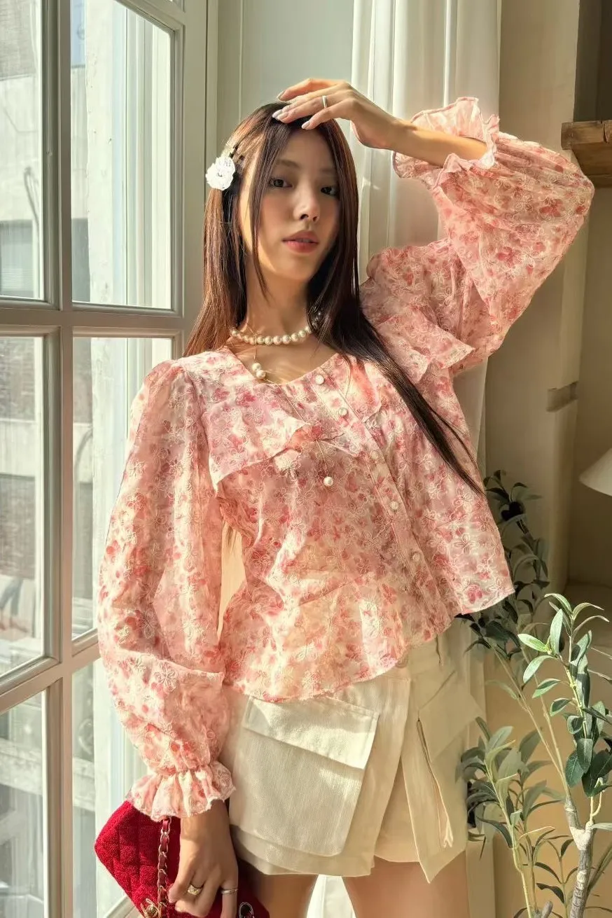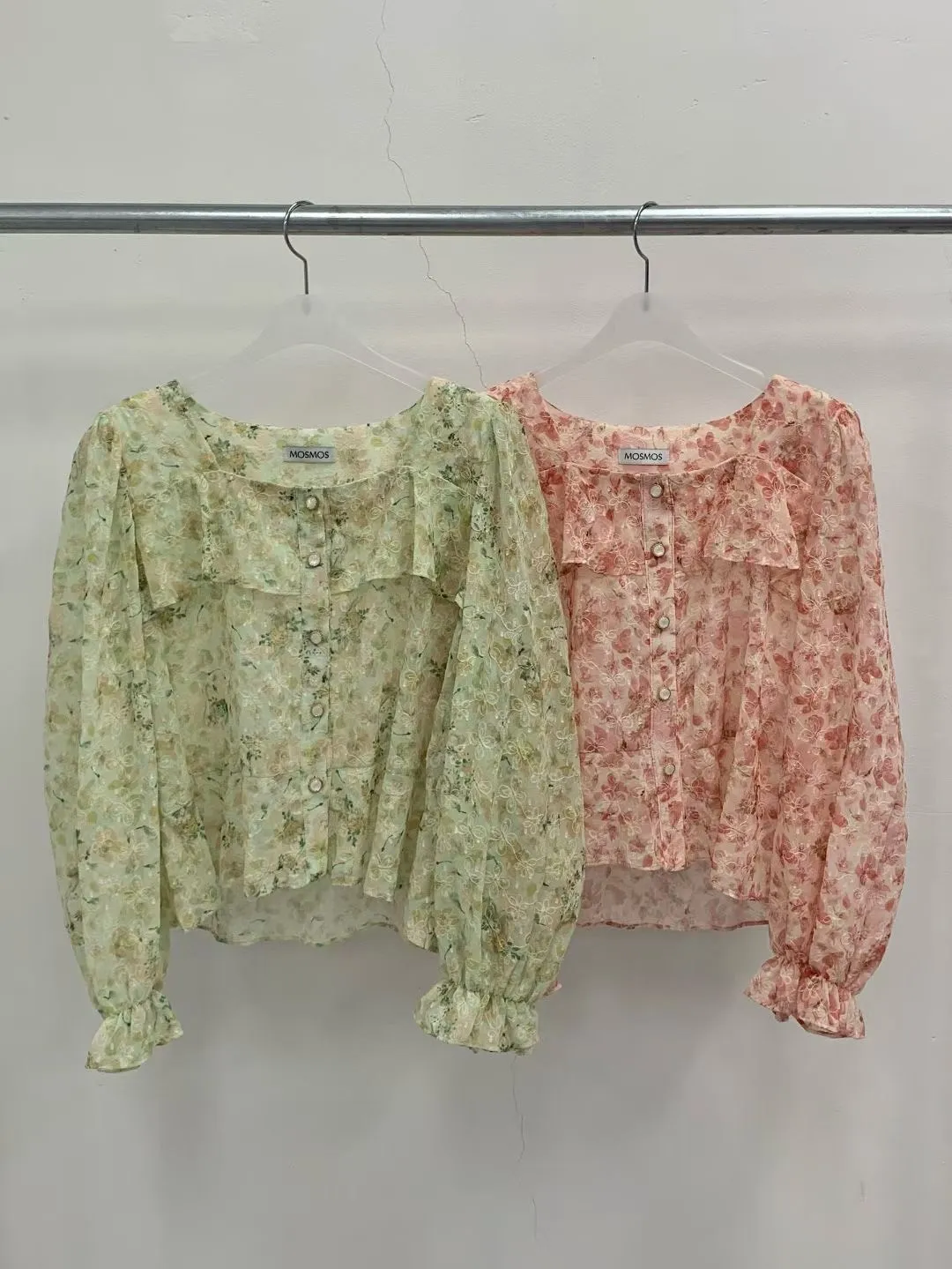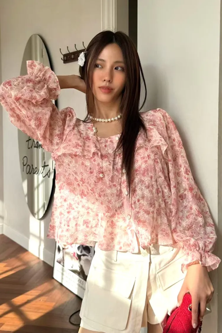 雪紡 親膚舒適 方領設計 精緻美釦 花苞鬆緊袖口 透光輕盈