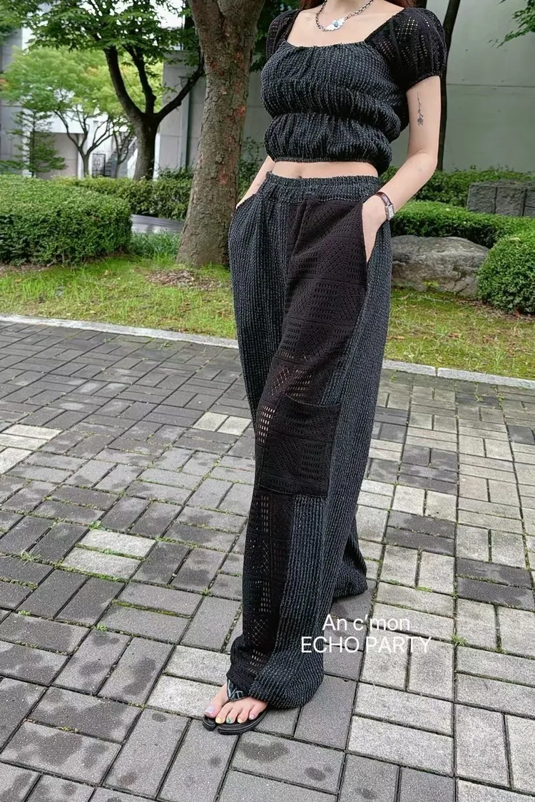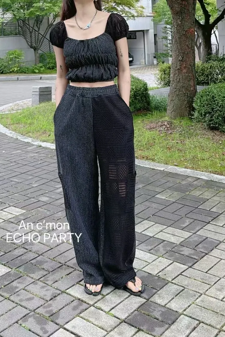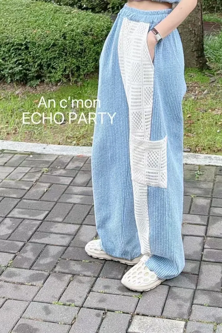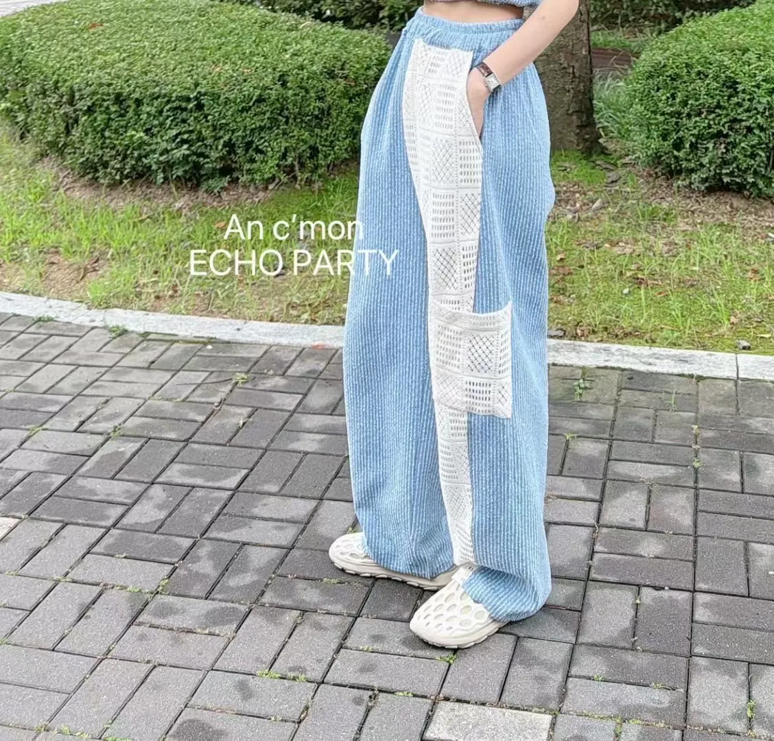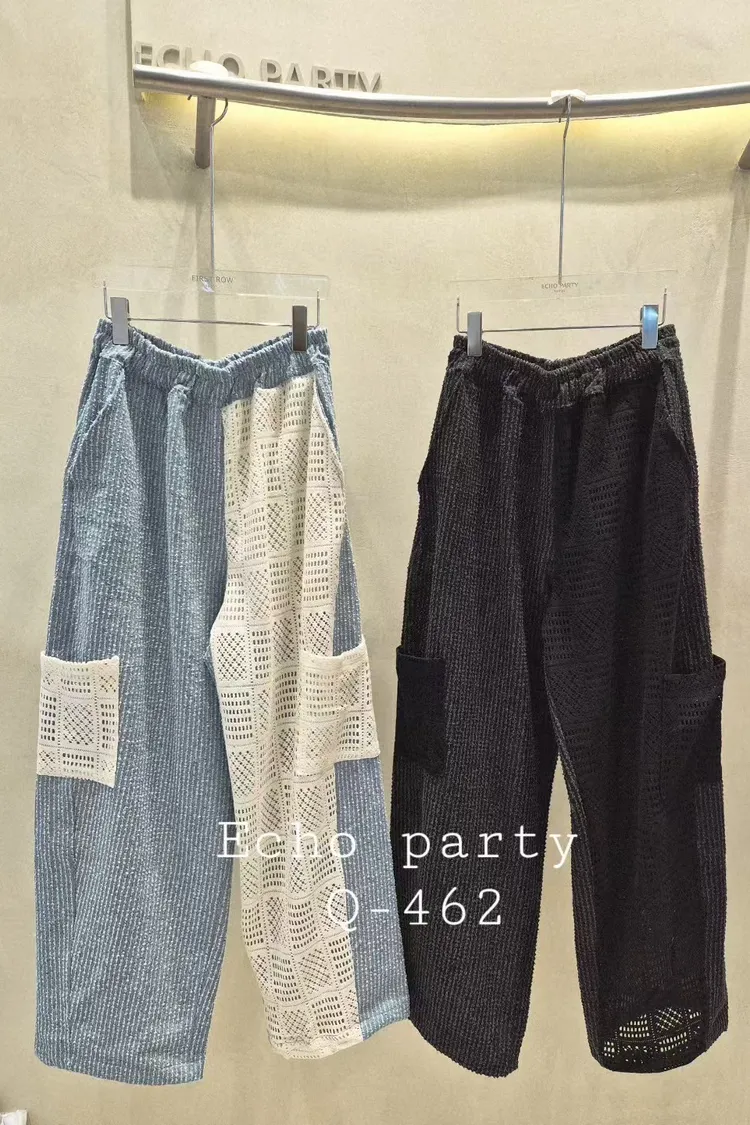 棉+聚酯 全腰鬆緊 細緻簍空蕾絲 透光拼接 有口袋 褲管縮口