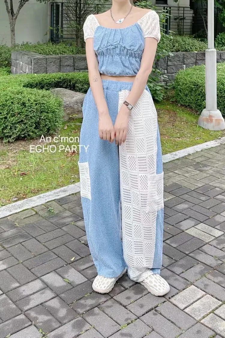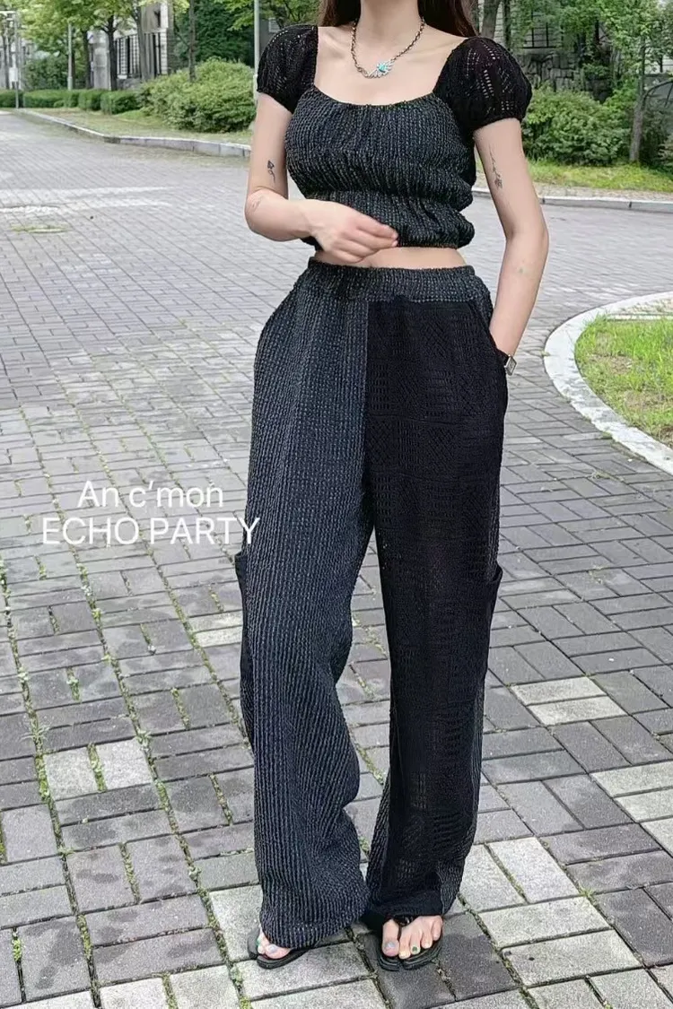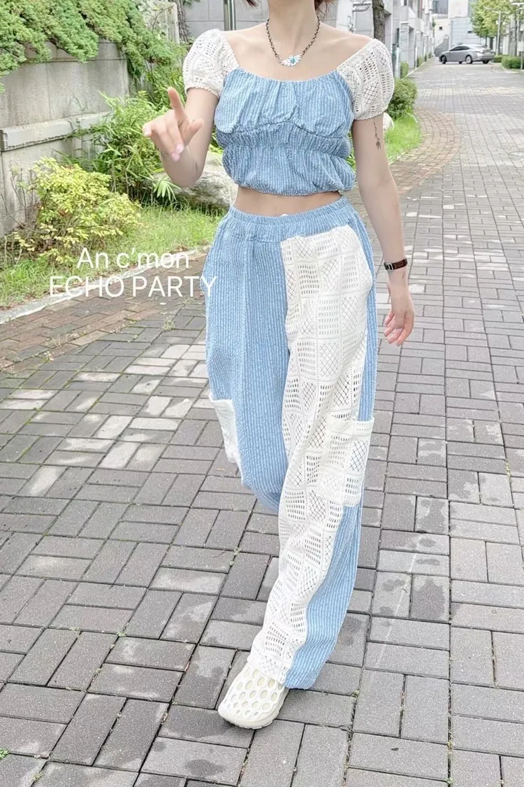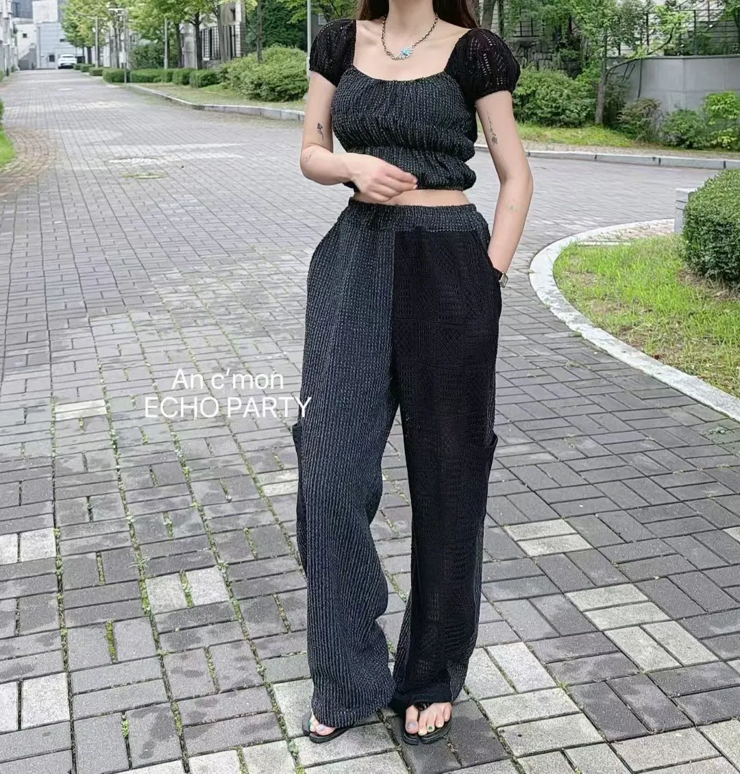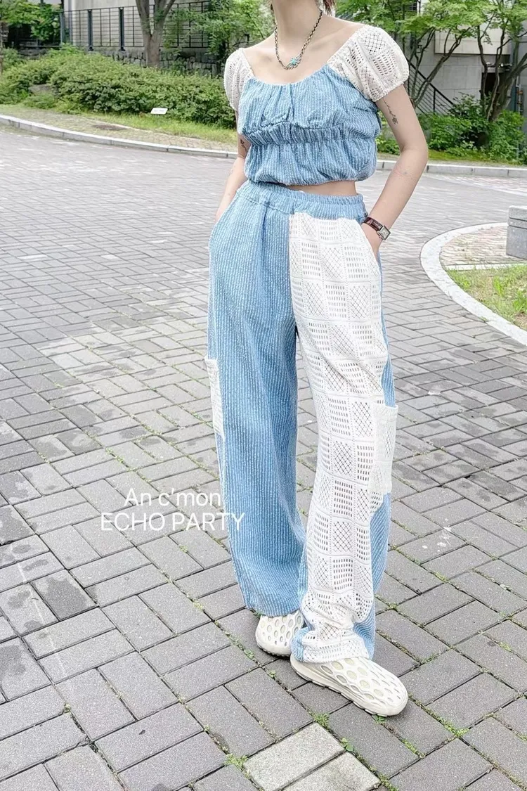 棉+聚酯 全腰鬆緊 細緻簍空蕾絲 透光拼接 有口袋 褲管縮口