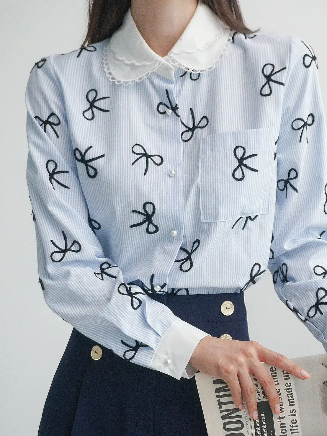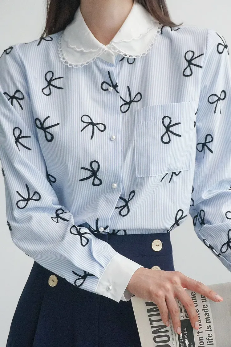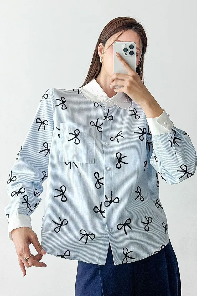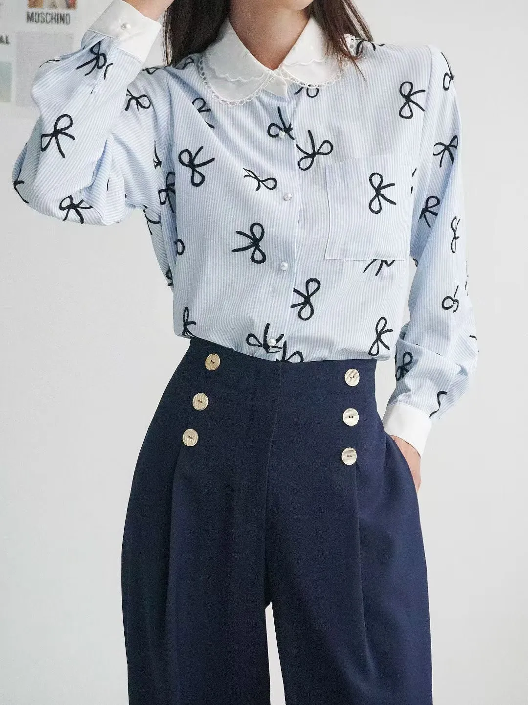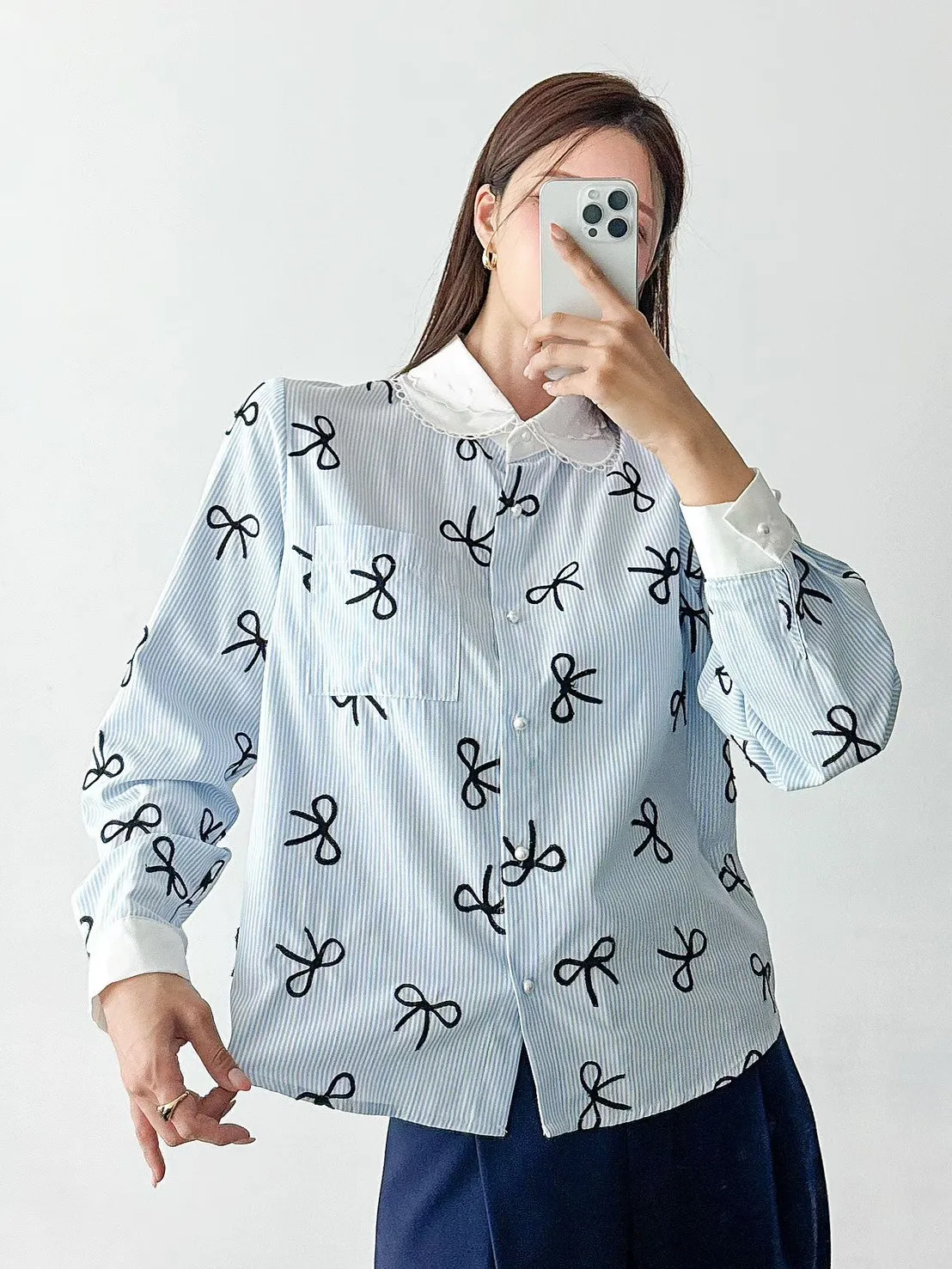 棉+縲縈 蕾絲滾邊翻領 質絨蝴蝶結 珍珠釦