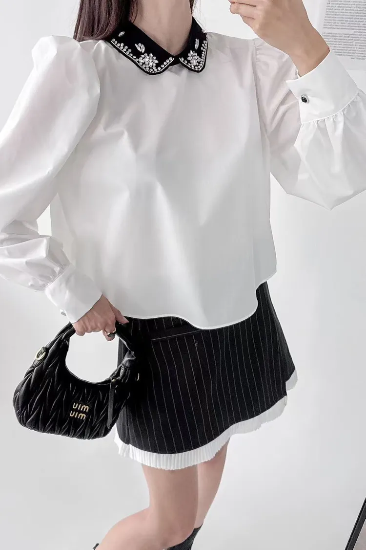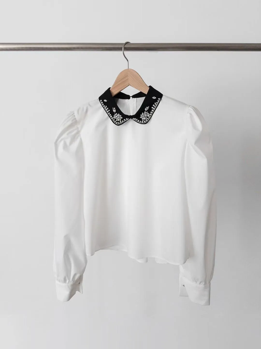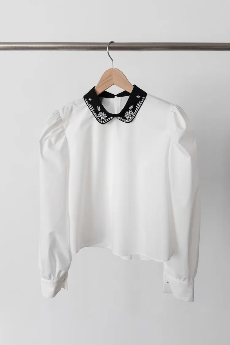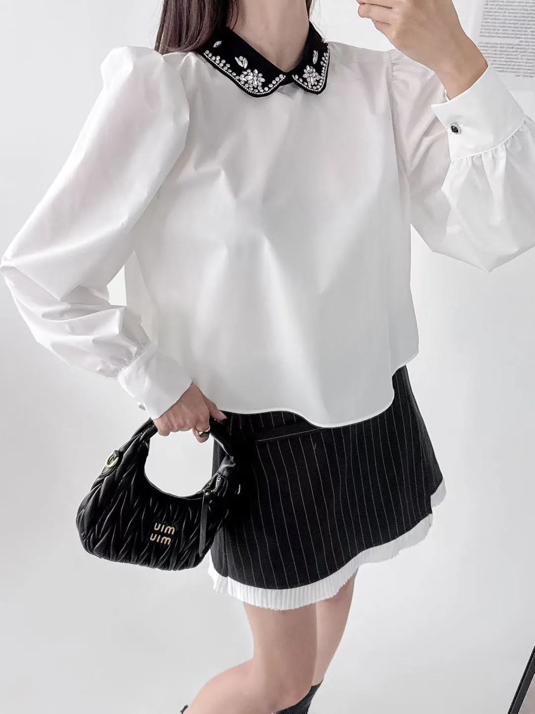 棉 精緻鑲鑽美領 後頸釦穿脫 微公主袖 寬鬆舒適