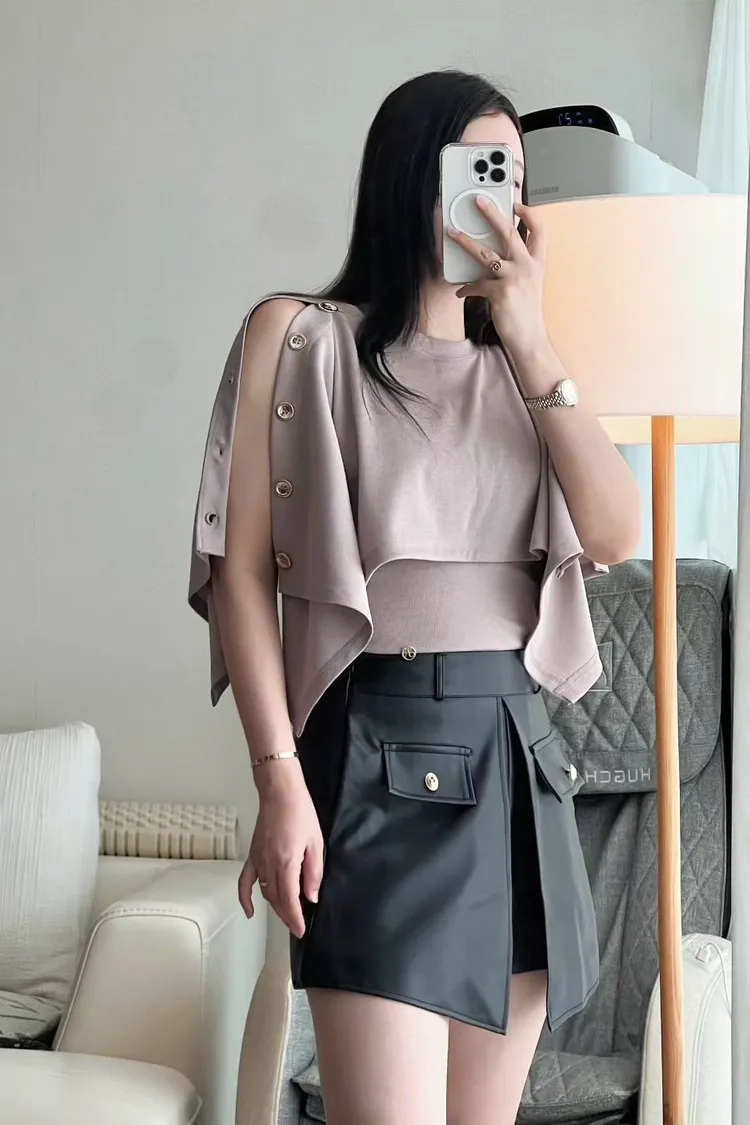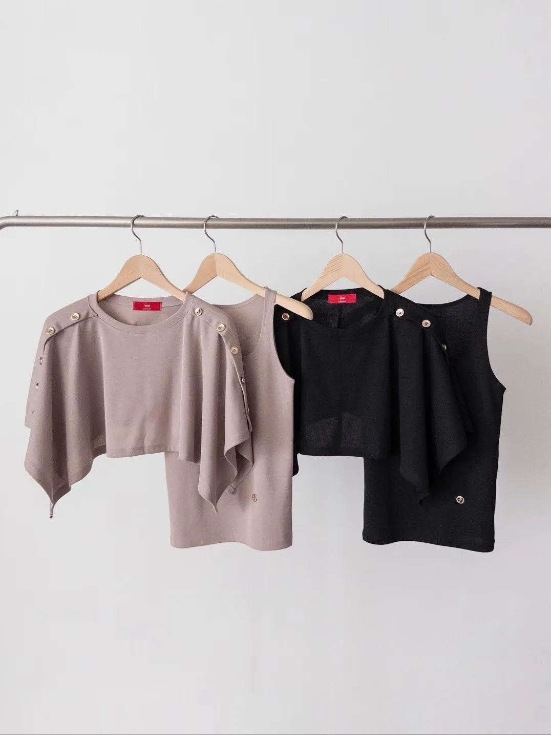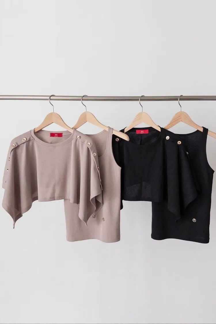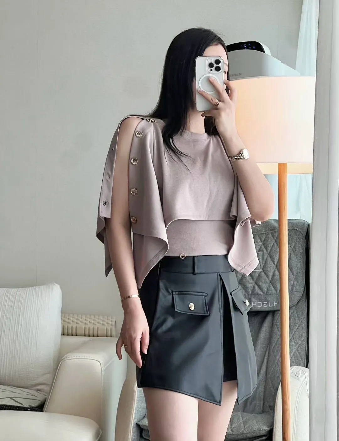 聚酯 類似紗棉觸感 裡面有背心+外面罩衫 有彈性 不易皺