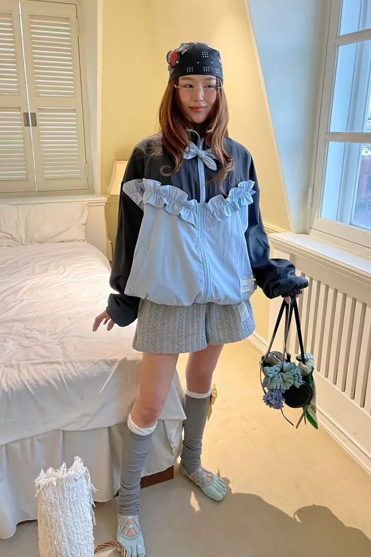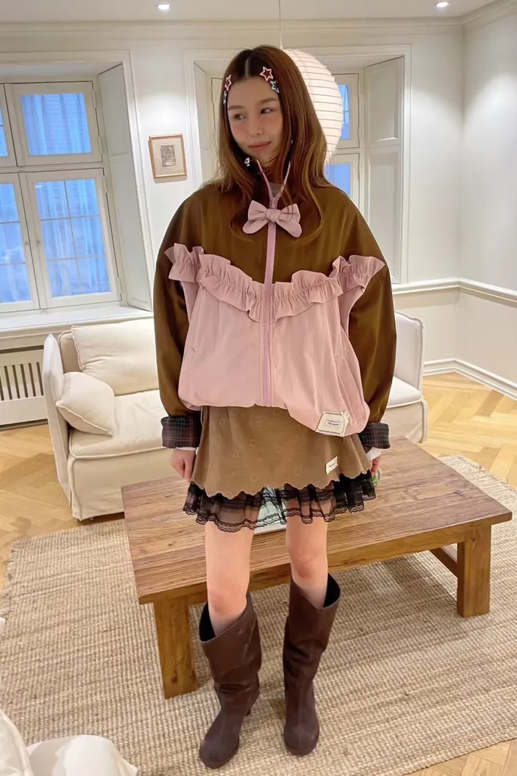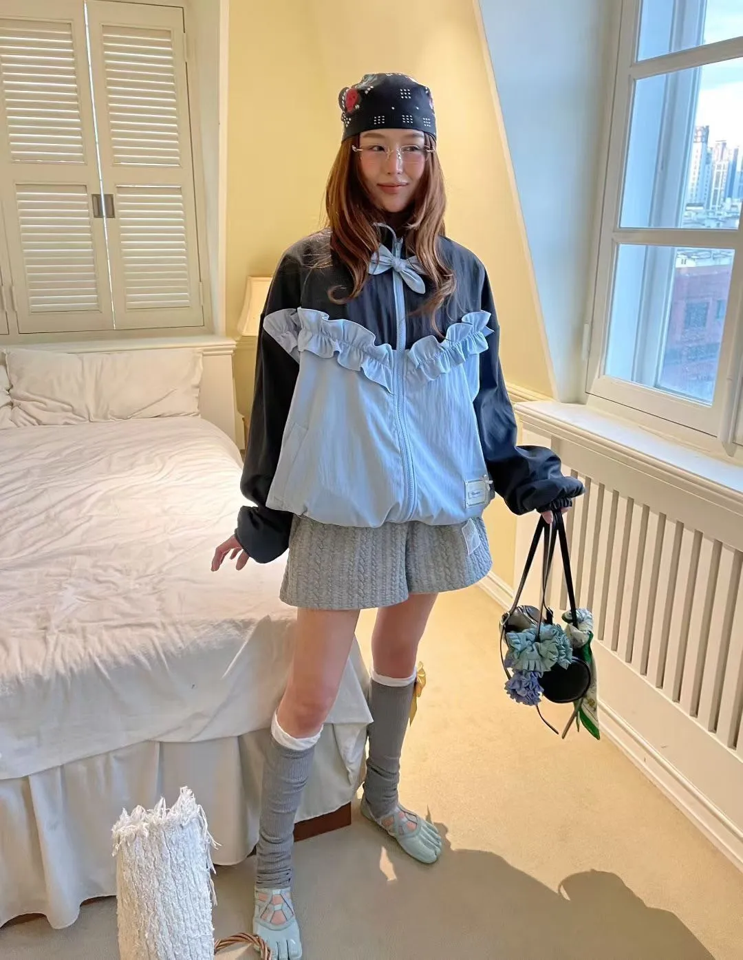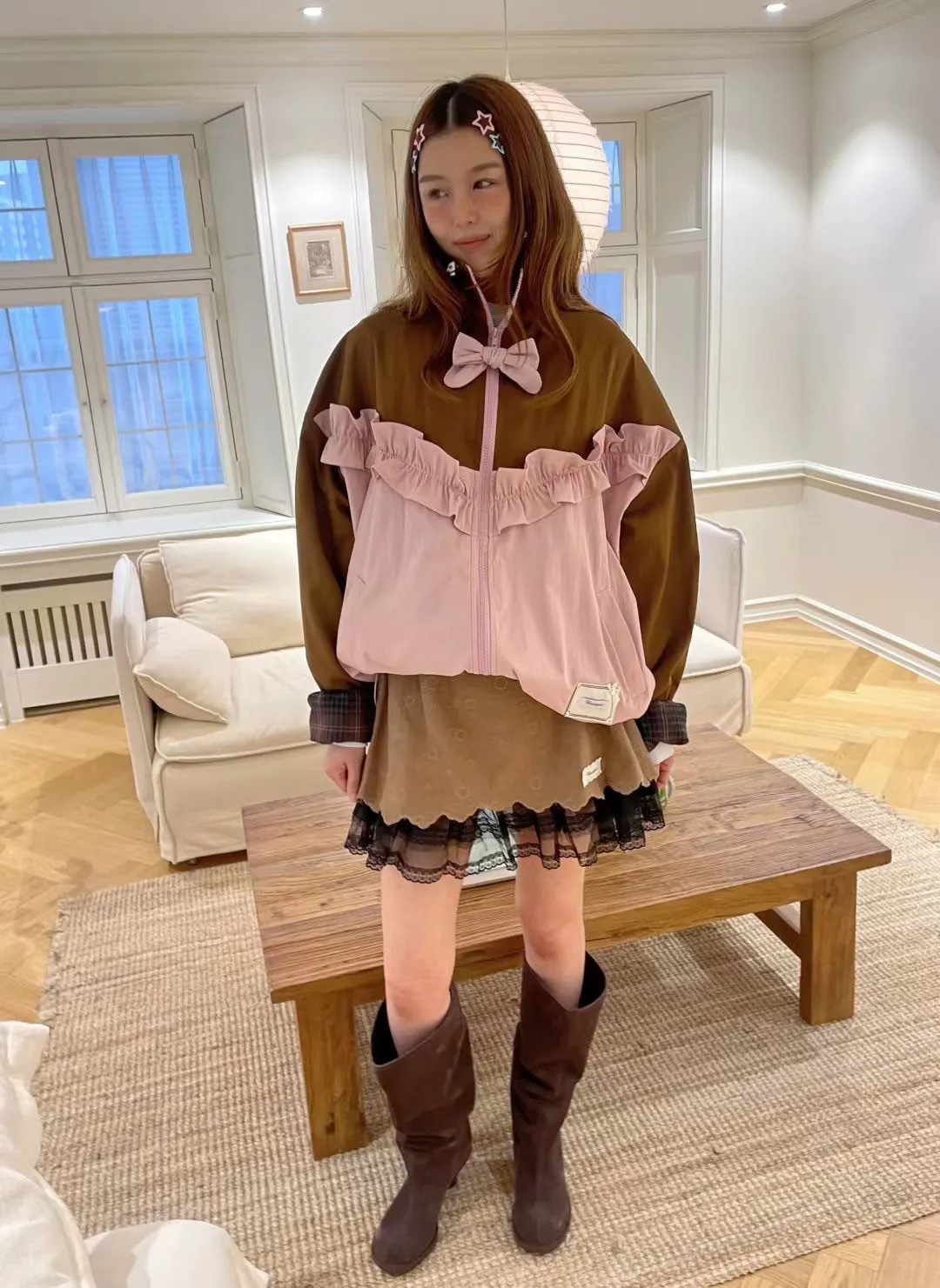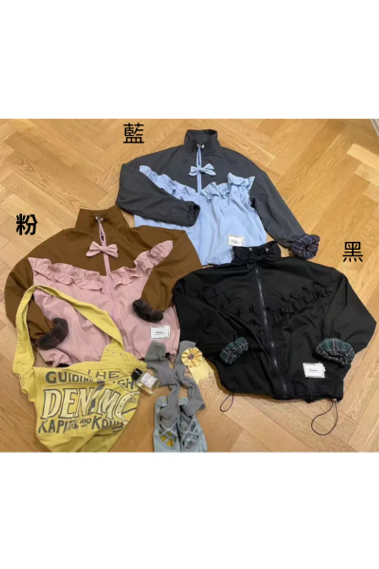 聚酯 層次荷葉撞色拼接 薄款質地 格紋內裡 拉鍊穿脫 有口袋