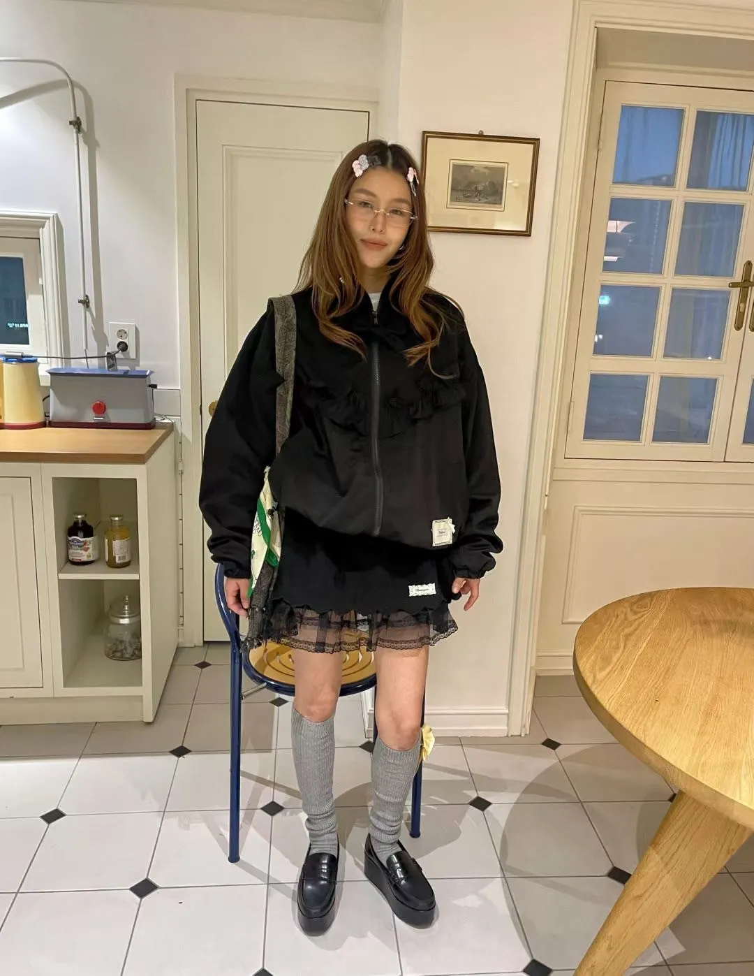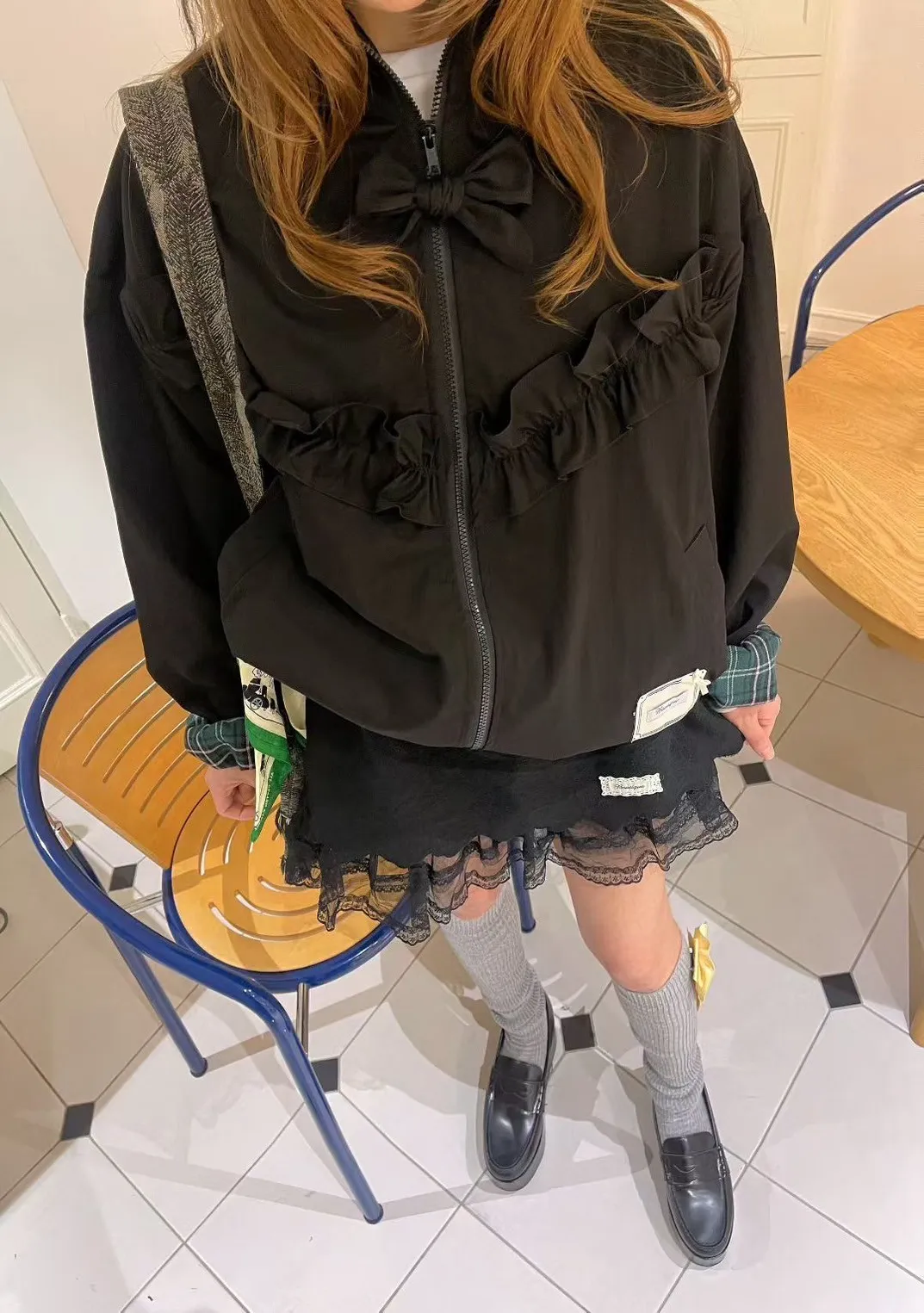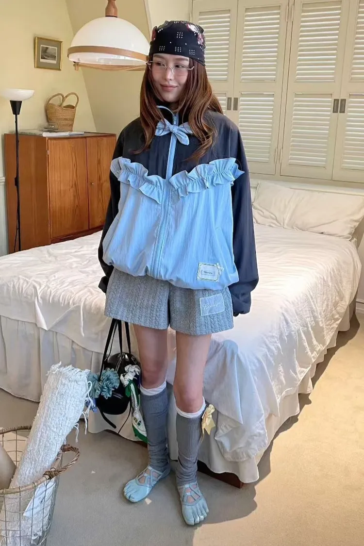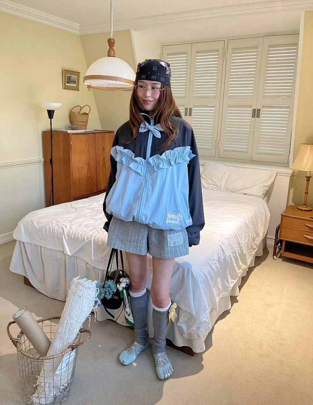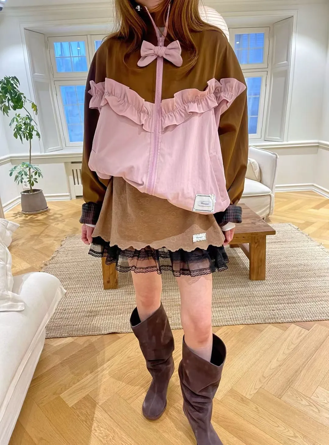 聚酯 層次荷葉撞色拼接 薄款質地 格紋內裡 拉鍊穿脫 有口袋