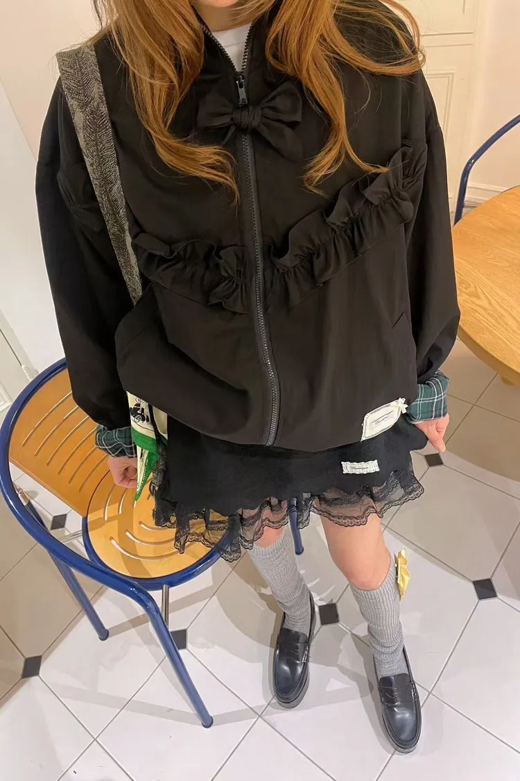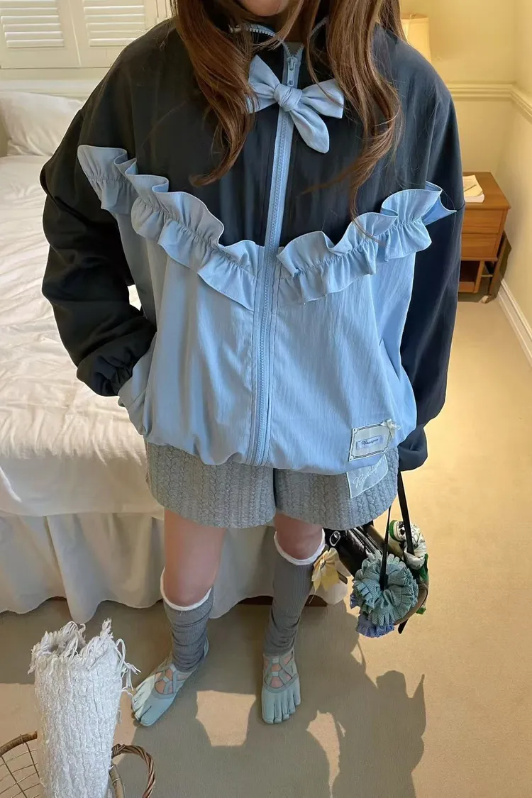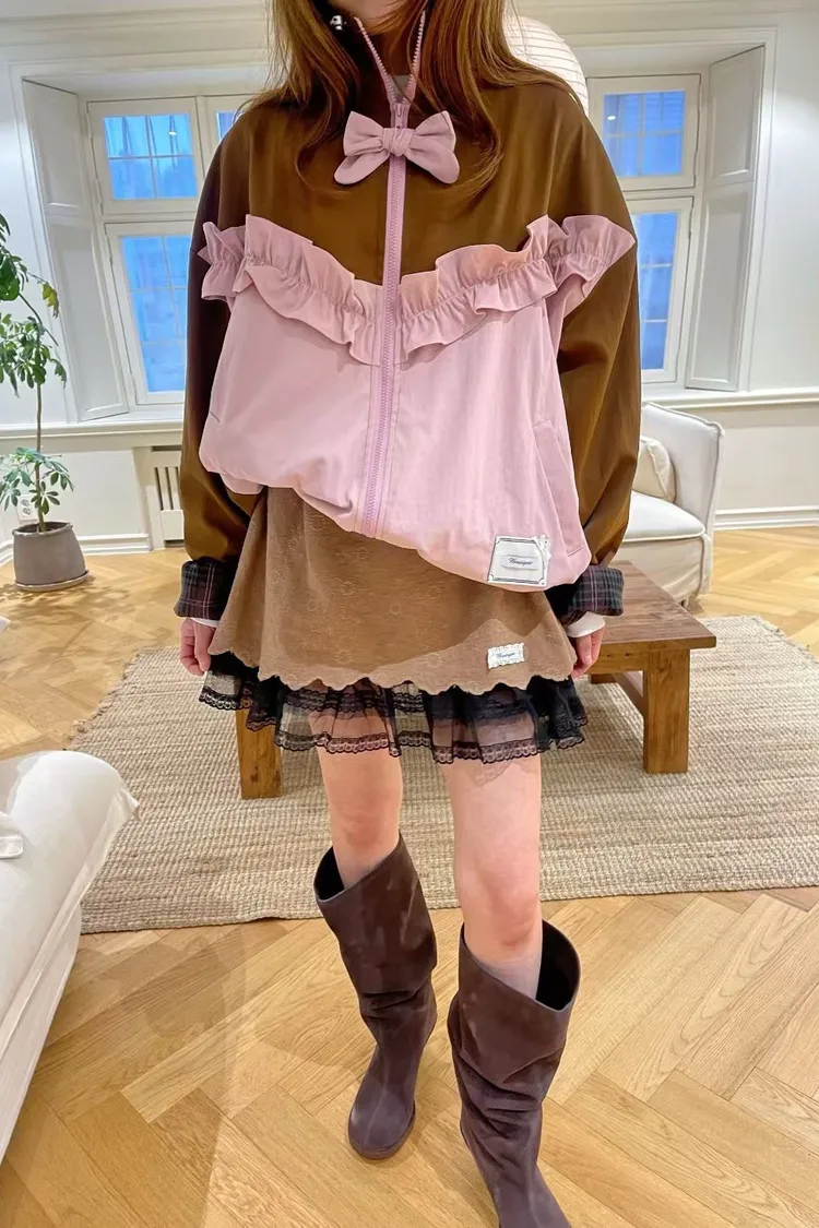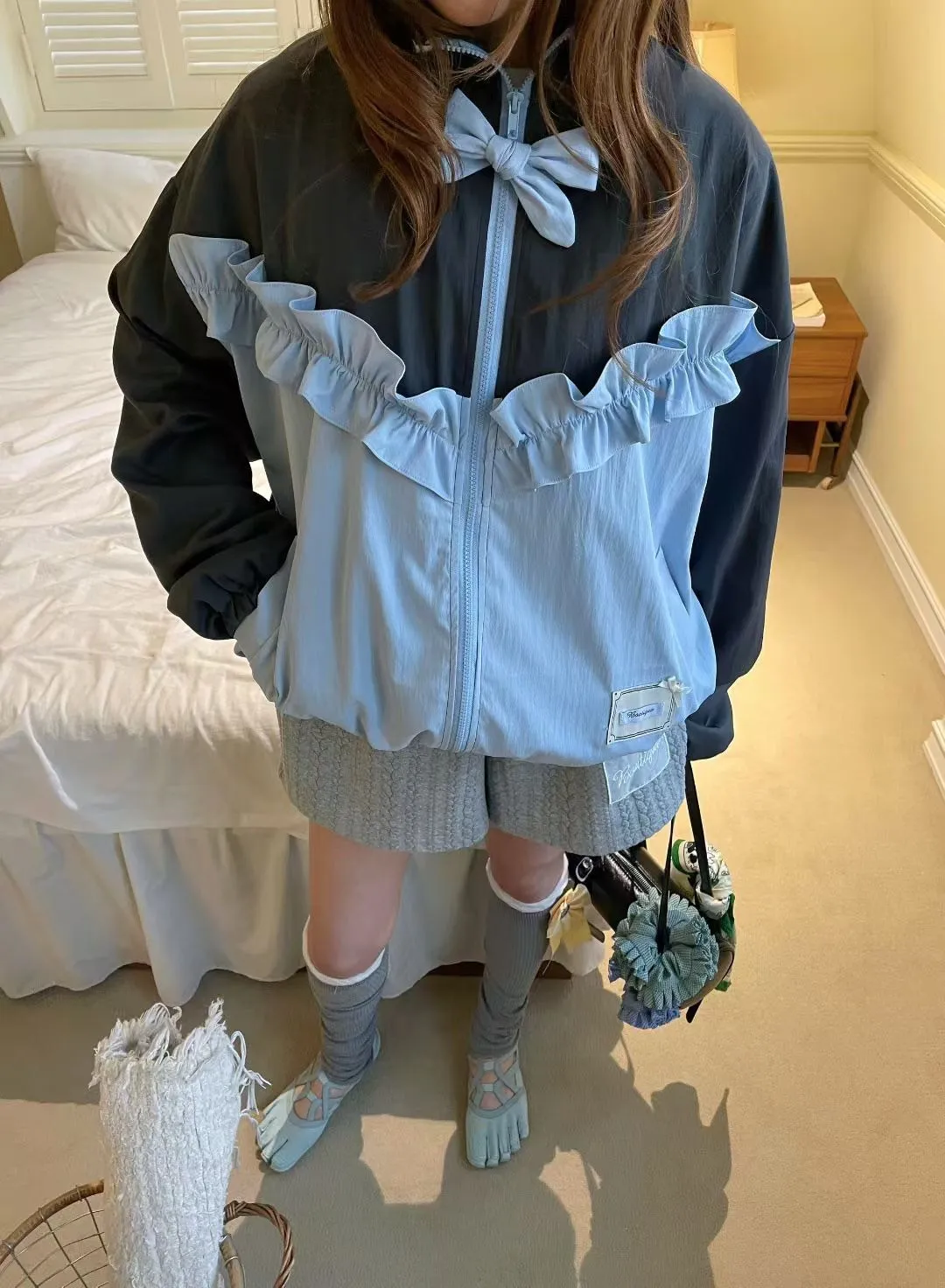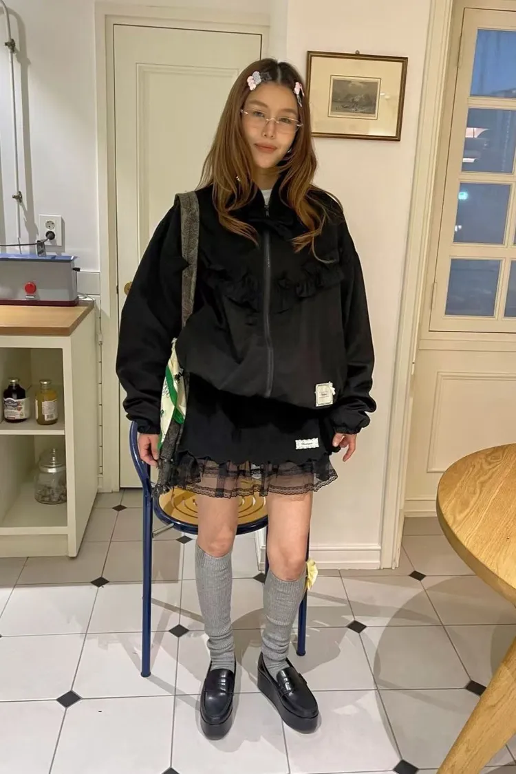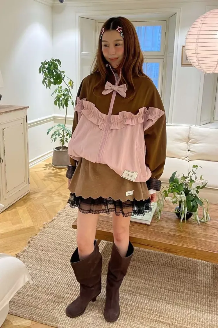 聚酯 層次荷葉撞色拼接 薄款質地 格紋內裡 拉鍊穿脫 有口袋