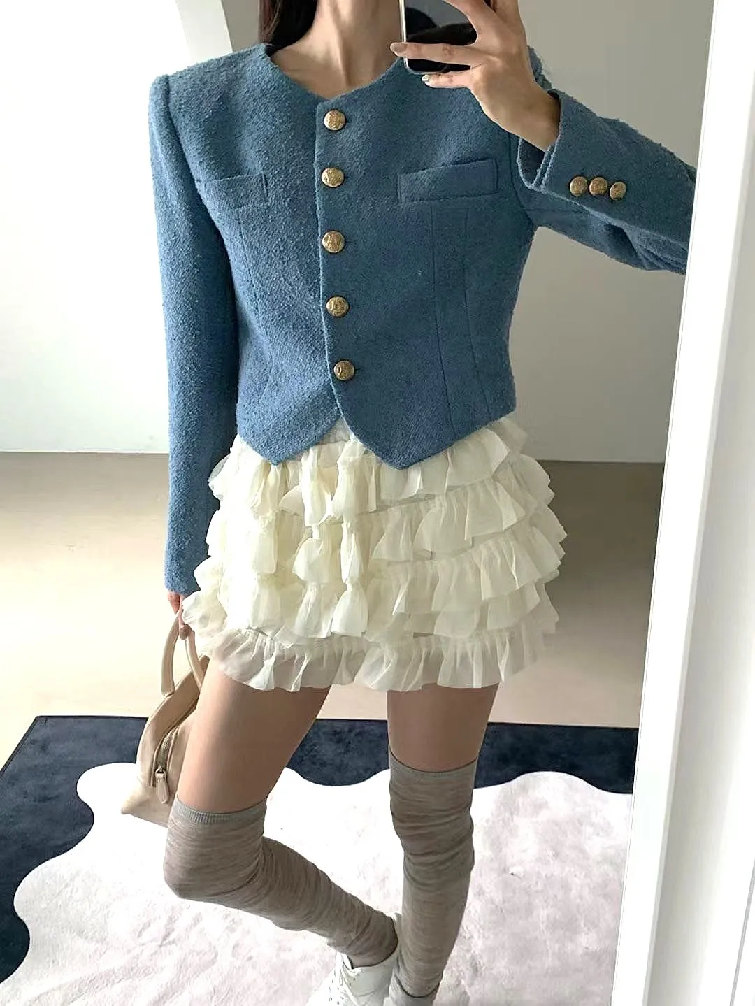 棉+聚酯 細毛顆粒面料 有內裡 立體細腰版型 存在感金釦 倒V下擺顯腿長