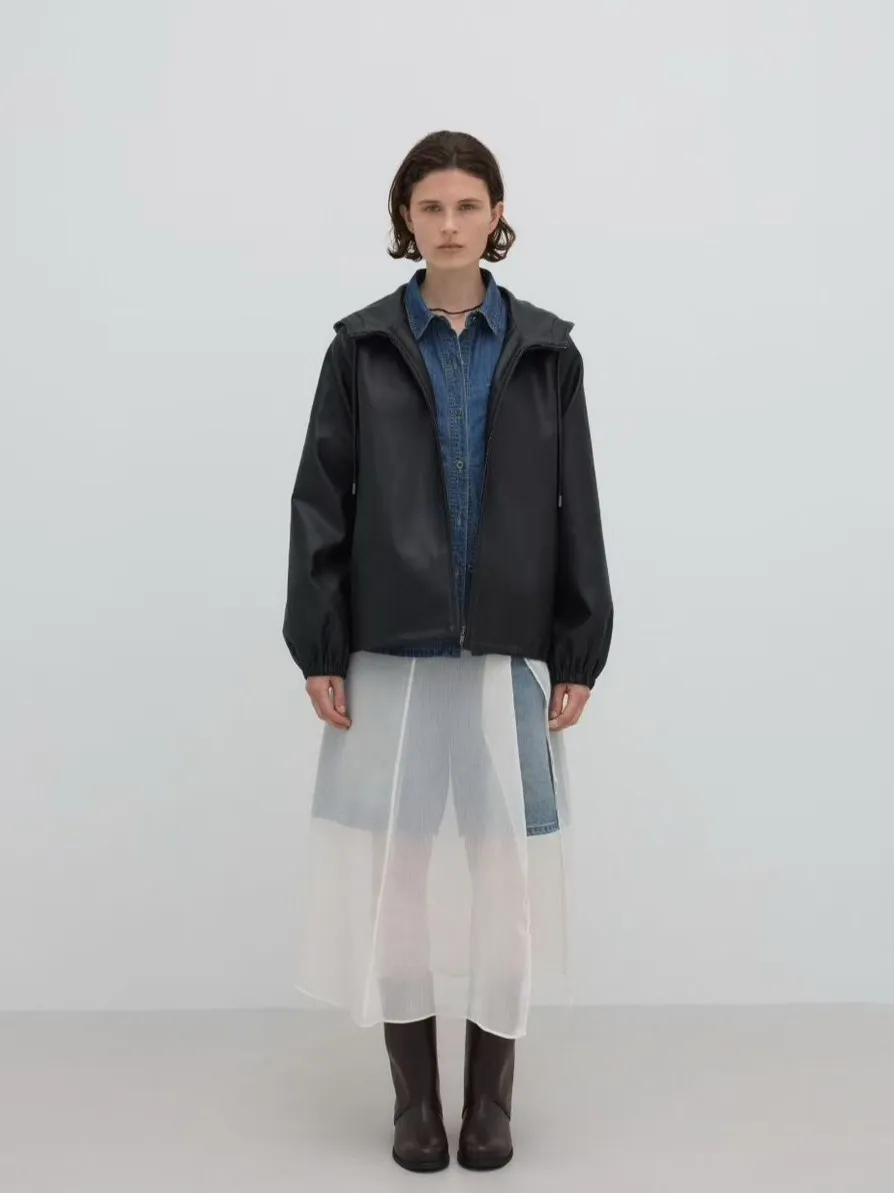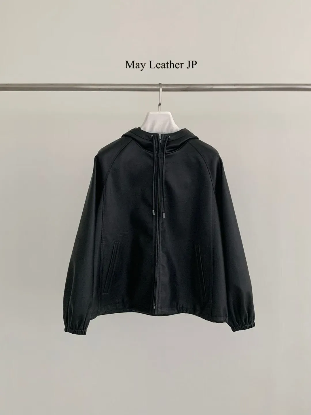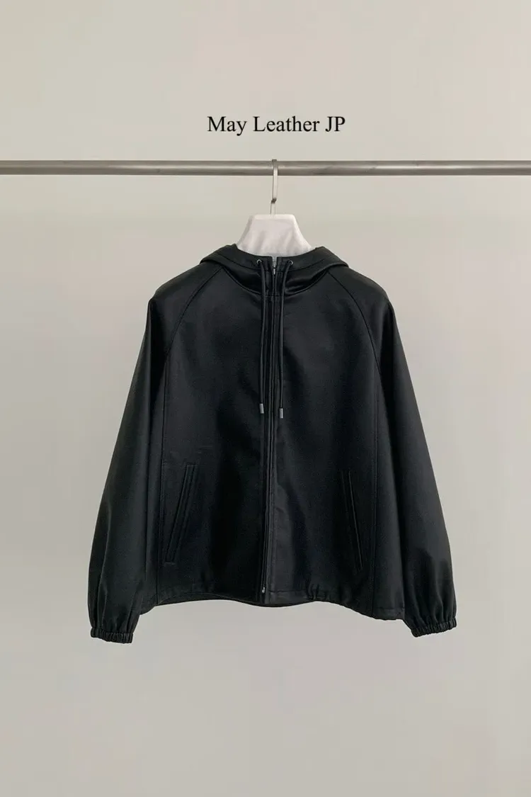 合成皮革 柔軟質地 有挺度 手繡下擺鬆緊 拉鍊穿脫 連帽設計
