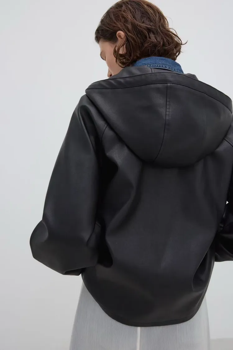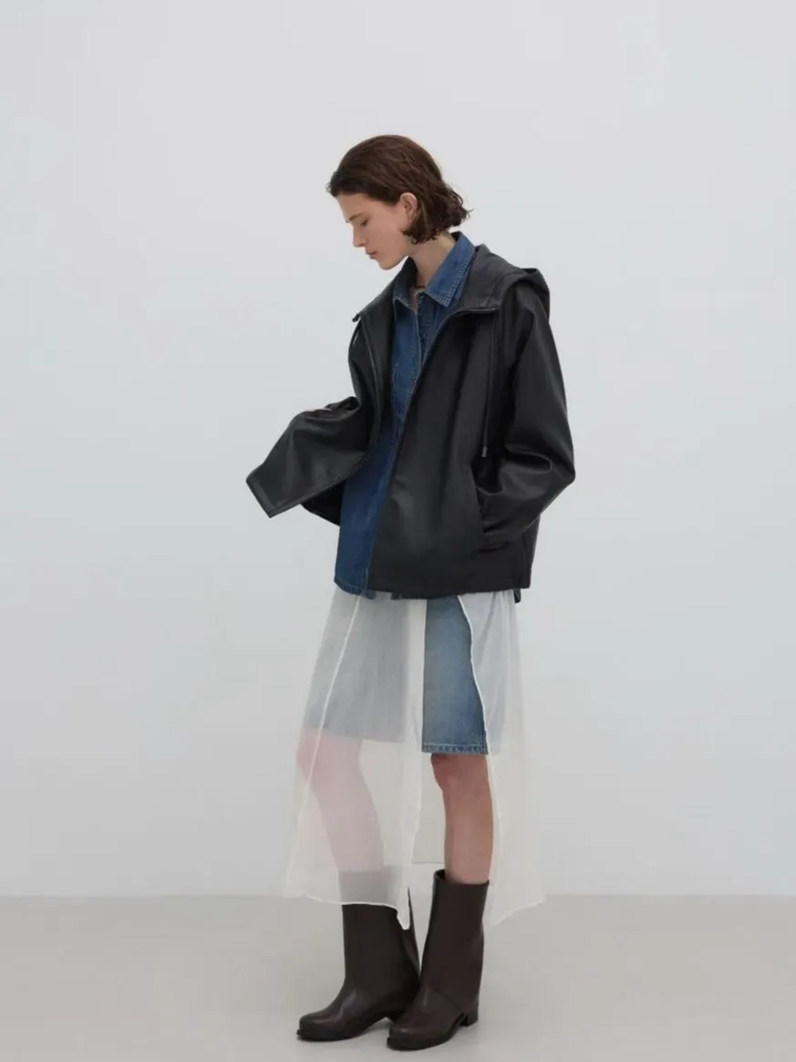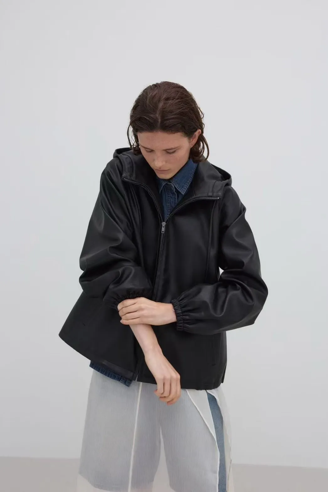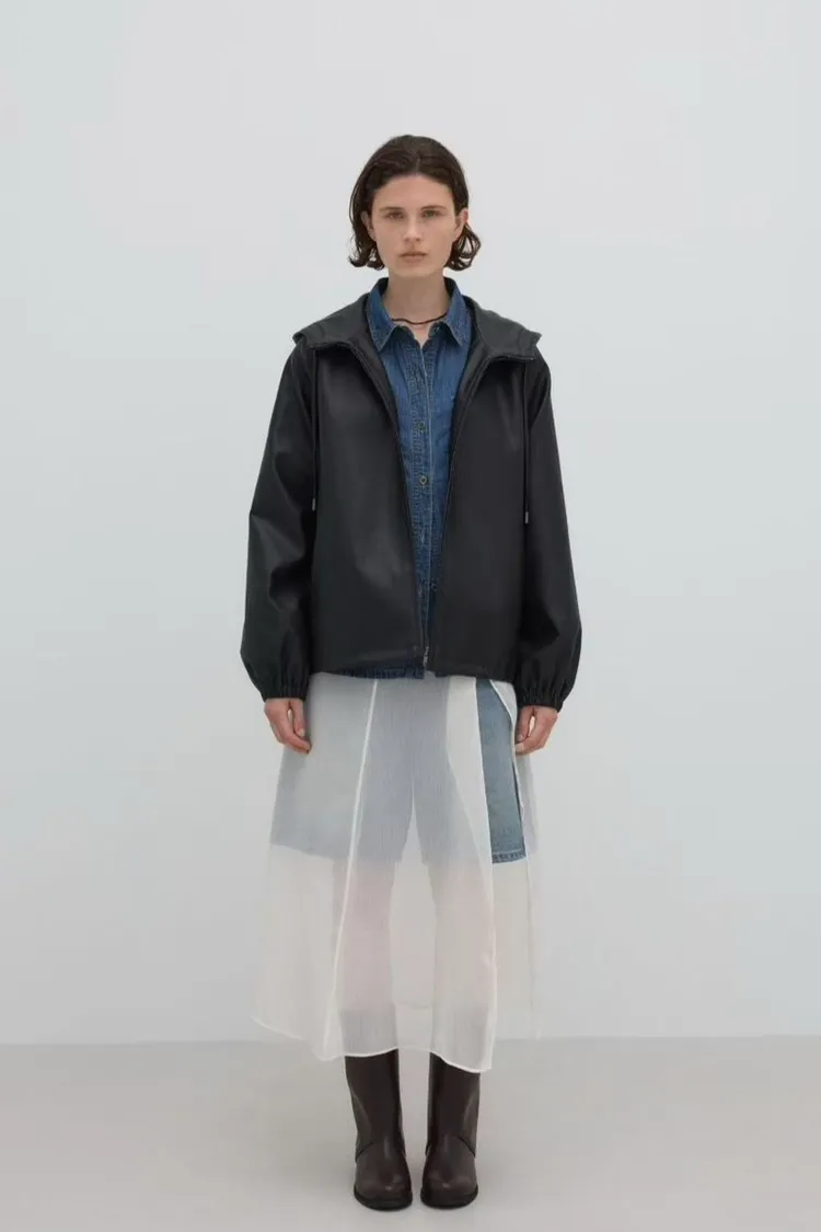 合成皮革 柔軟質地 有挺度 手繡下擺鬆緊 拉鍊穿脫 連帽設計