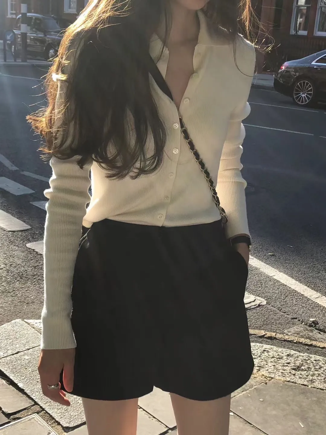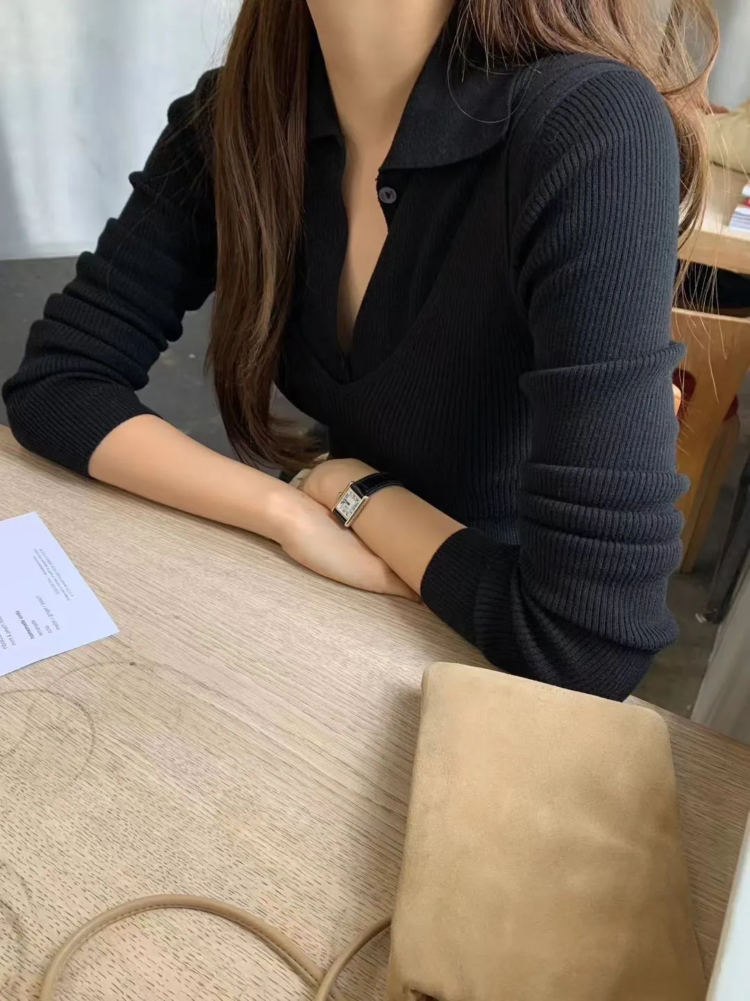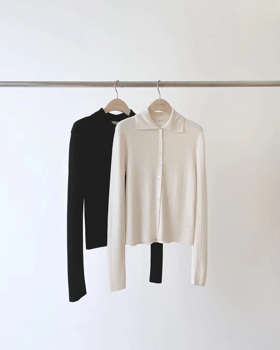 CY640襯衫領排釦針織上衣 米 黑 官網價$1680 線上價$1650