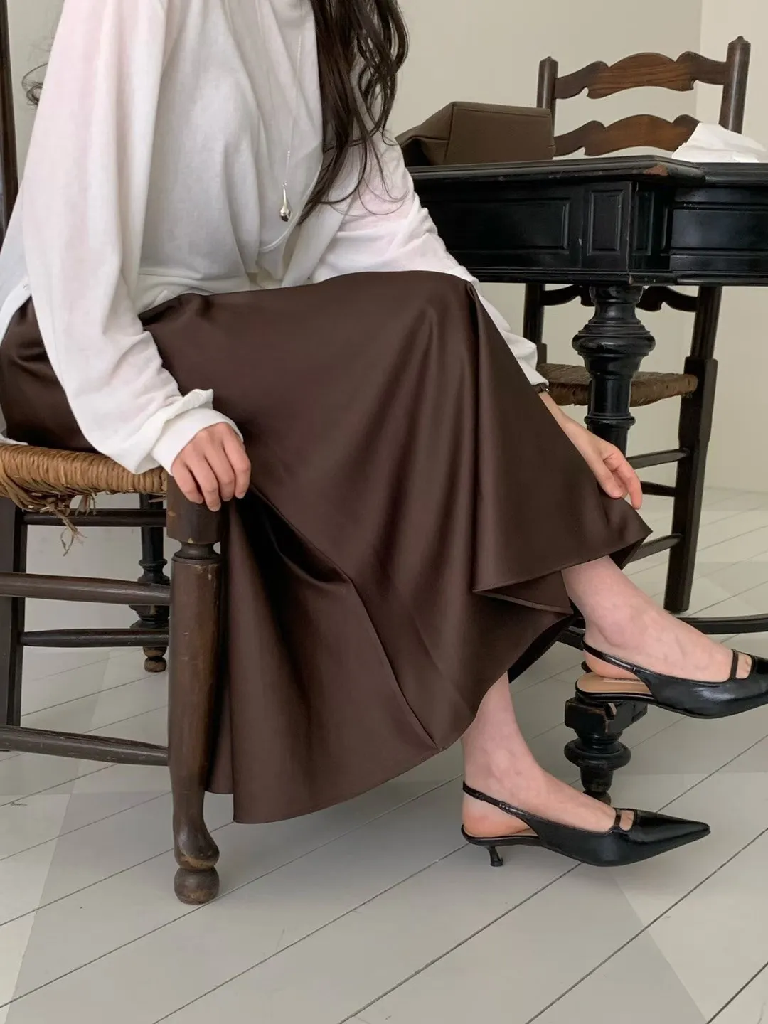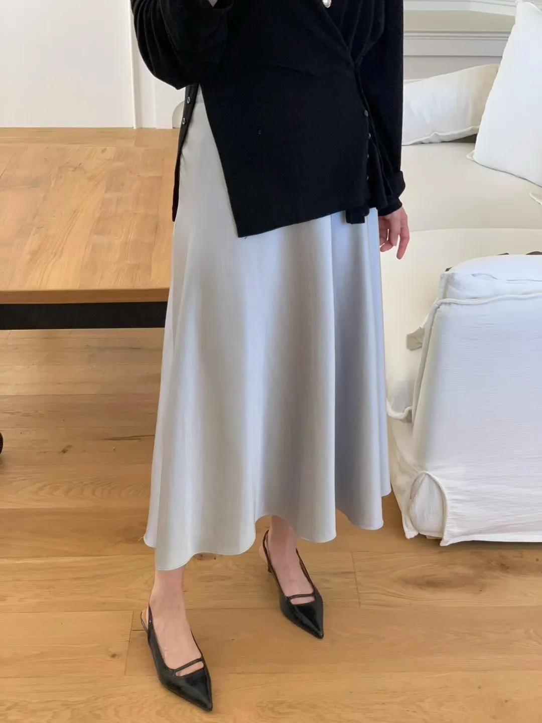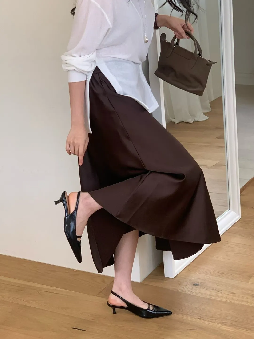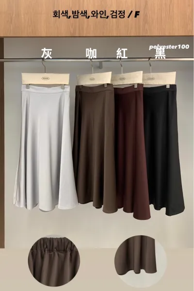 聚酯 高級光澤感 腰有鬆緊 垂墜傘擺 側拉鍊 後腰鬆緊