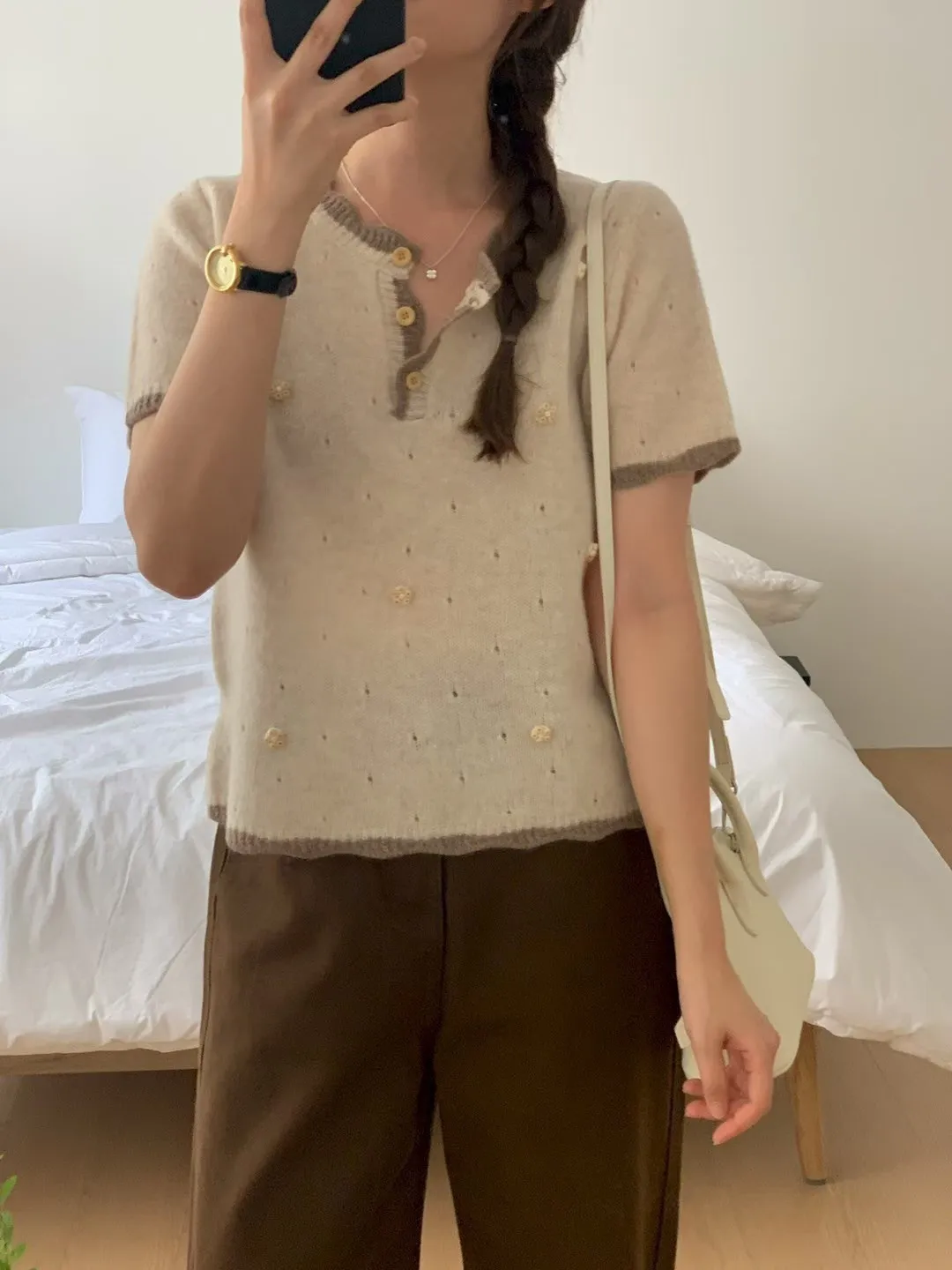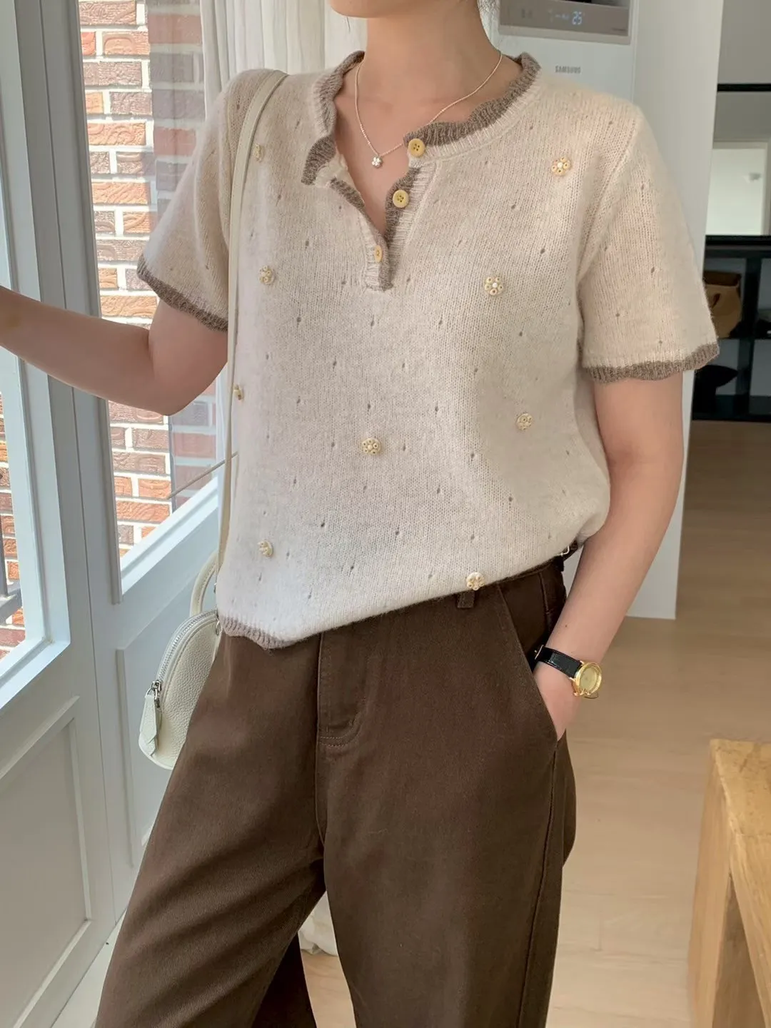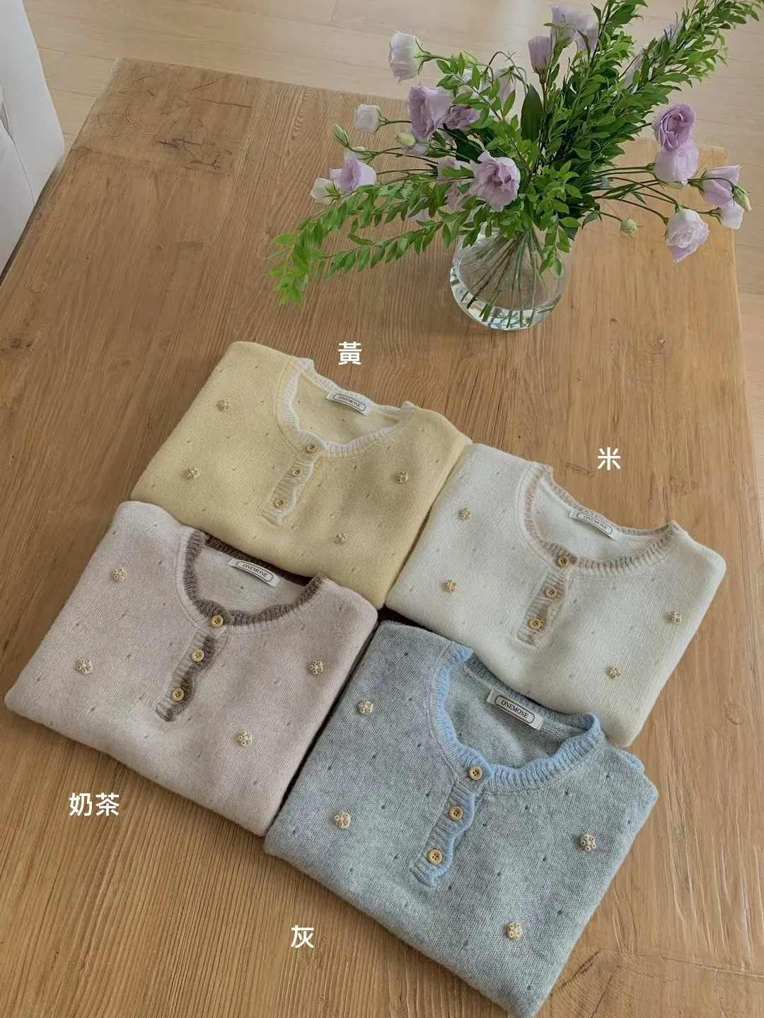 羊毛100%,滾邊配色 可愛釦子 立體小花