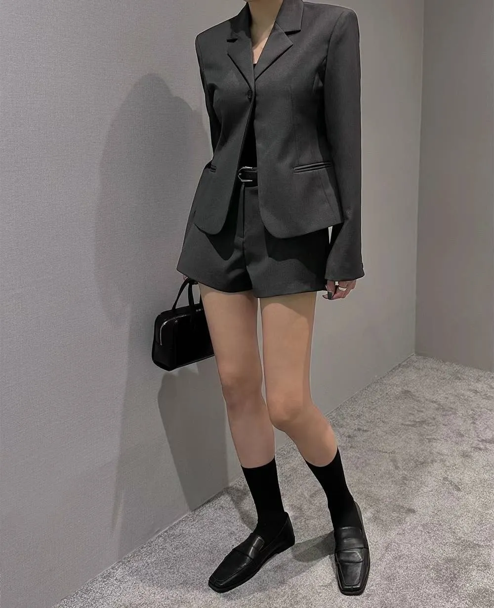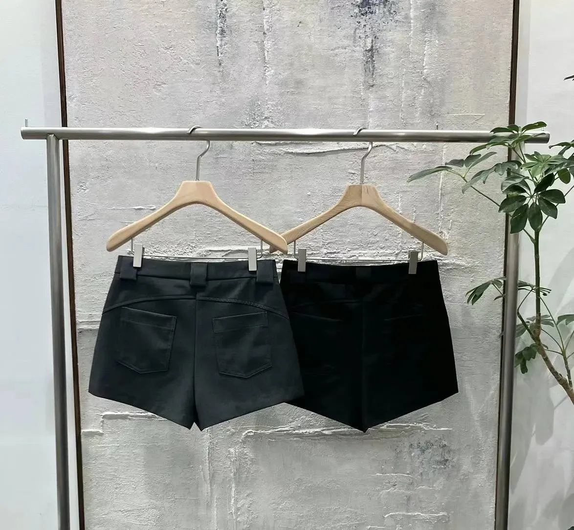 西裝面料 滑面觸感 有挺度 立體臀車線 背後口袋 寬腰耳