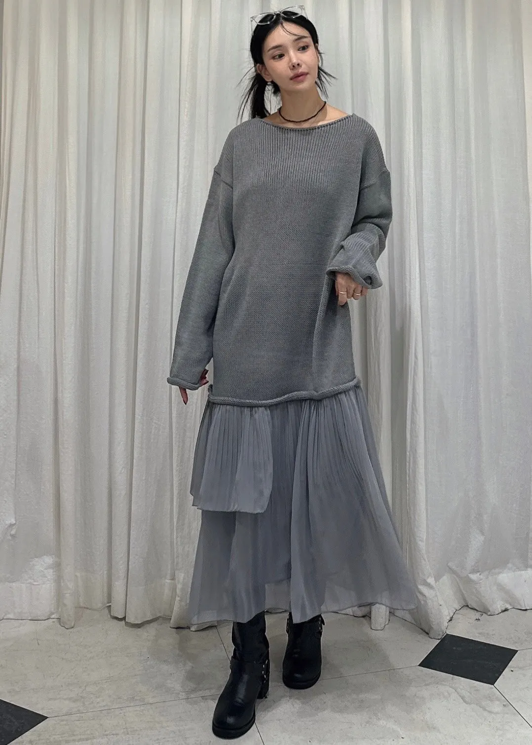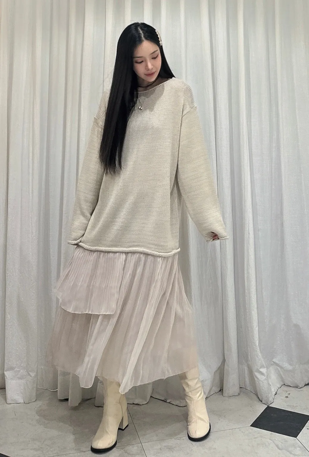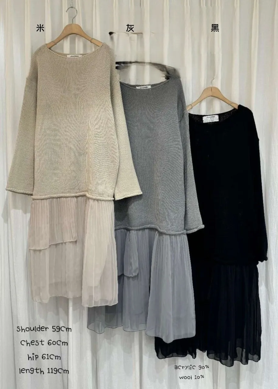 羊毛10%+壓克力 小性感船型領可斜肩 網紗飄逸裙擺