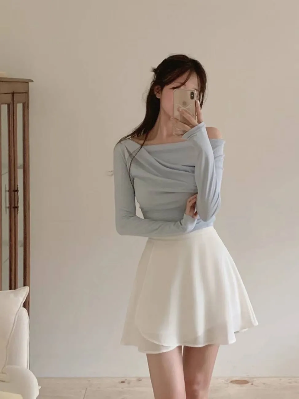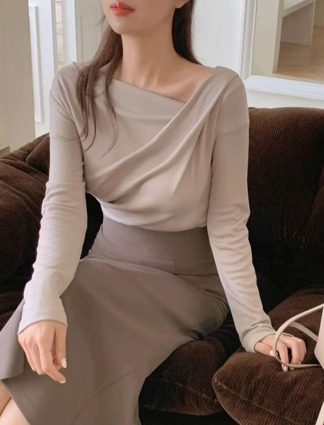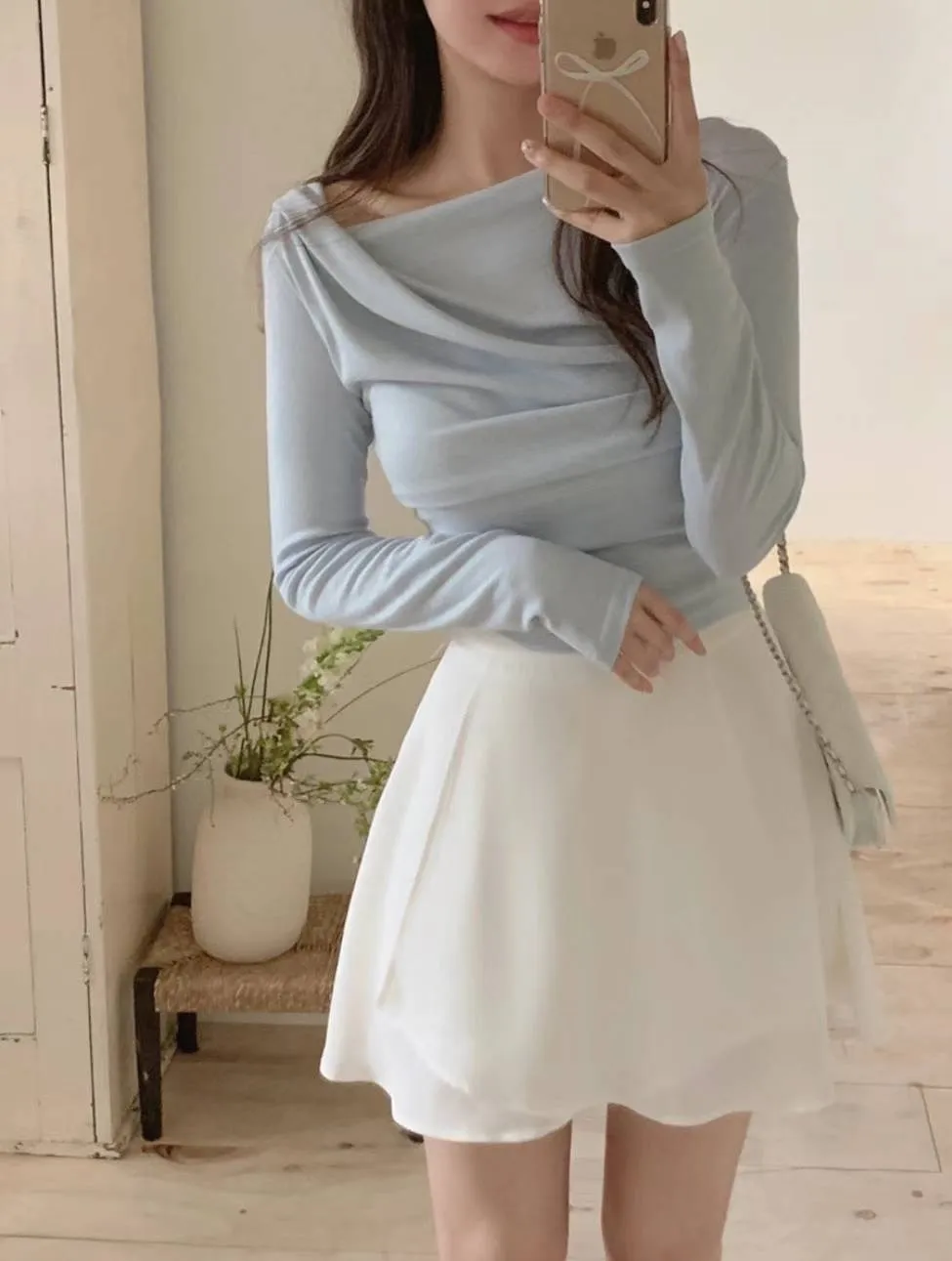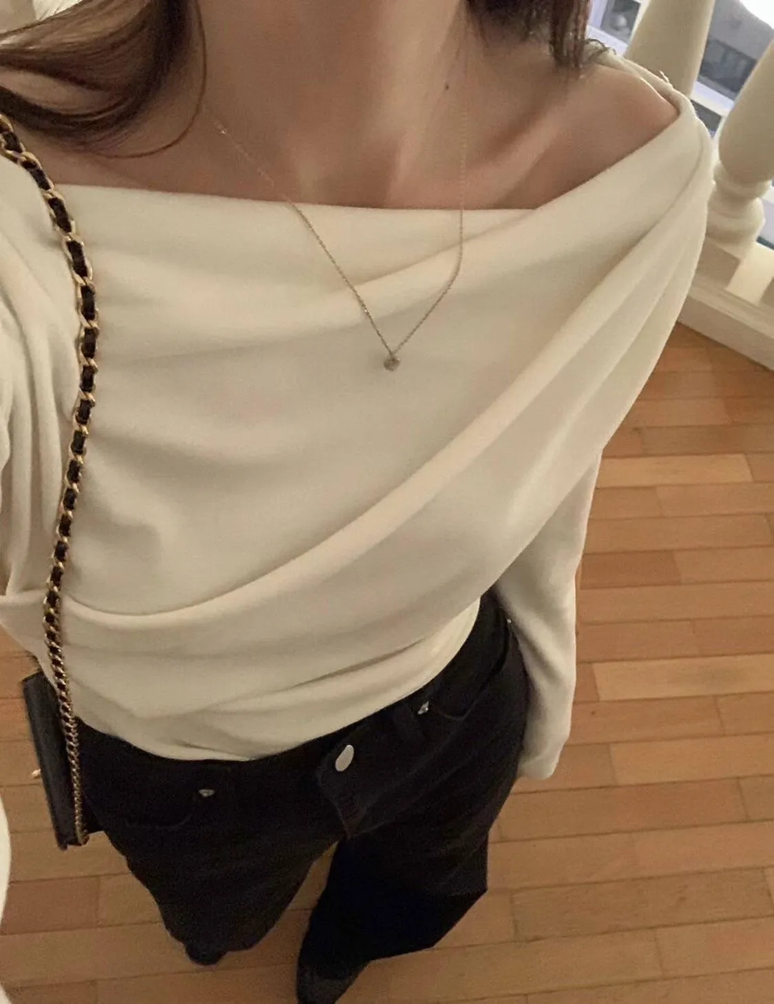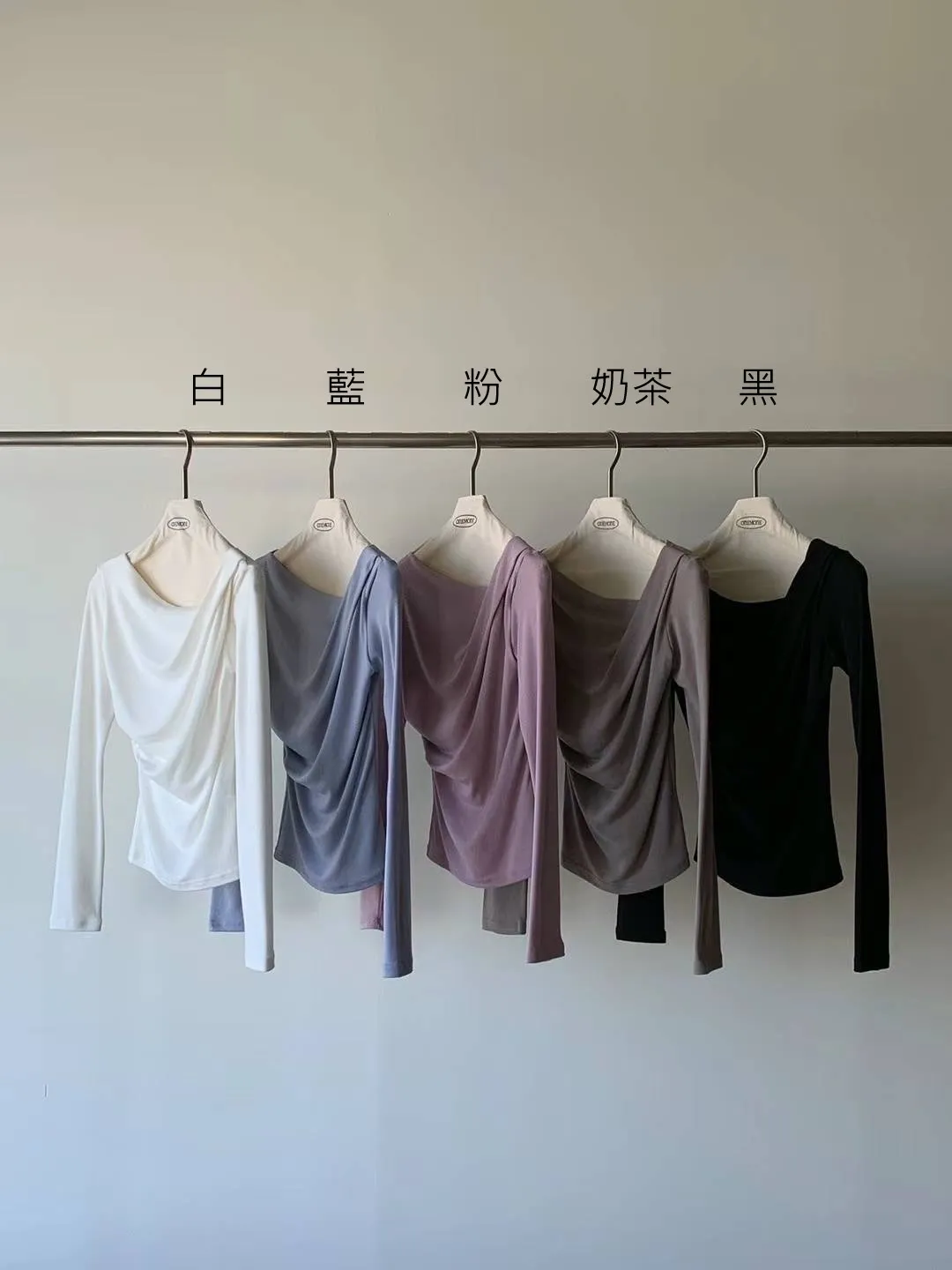 DC502斜肩女神垂墜上衣 白 奶茶 藍 粉 黑 官網價$580 線上價$550