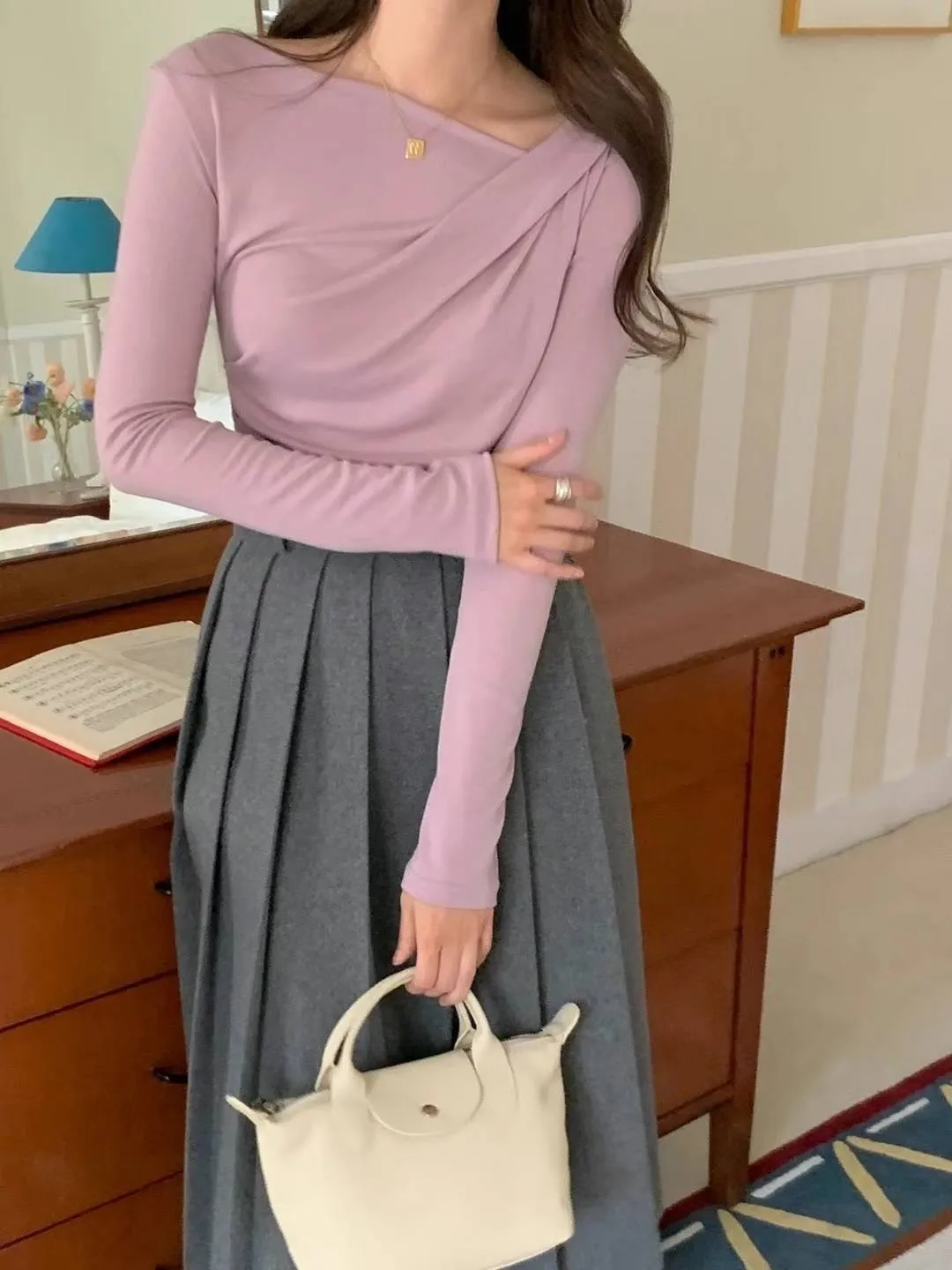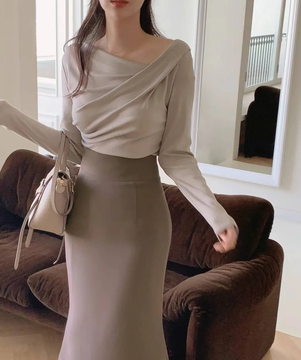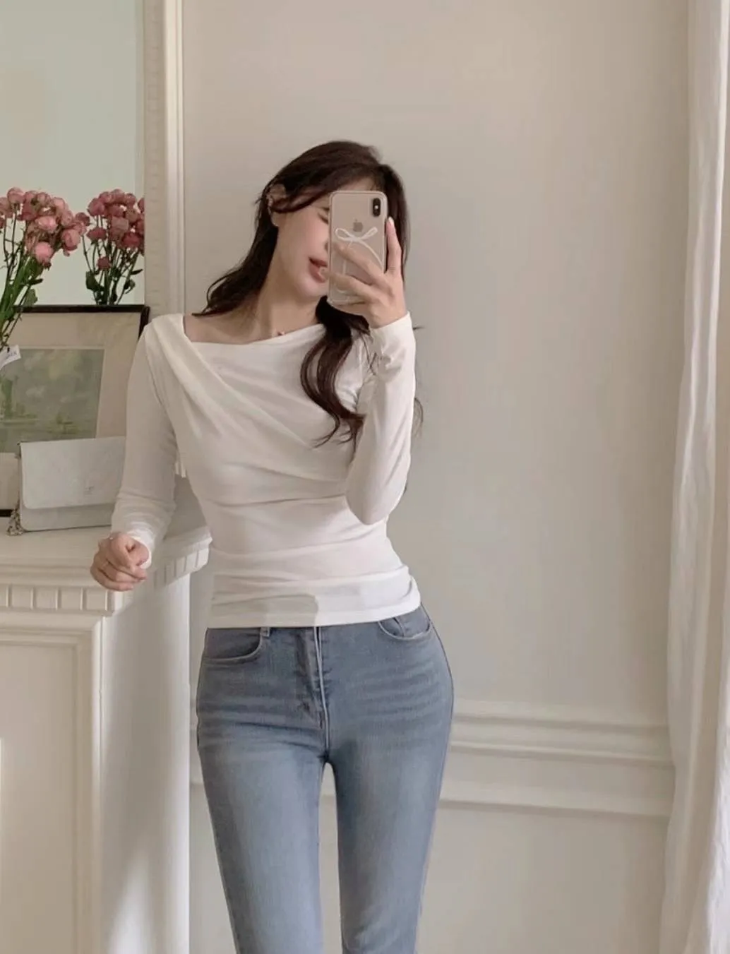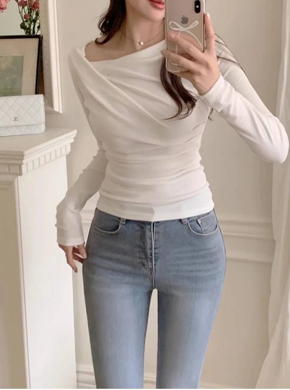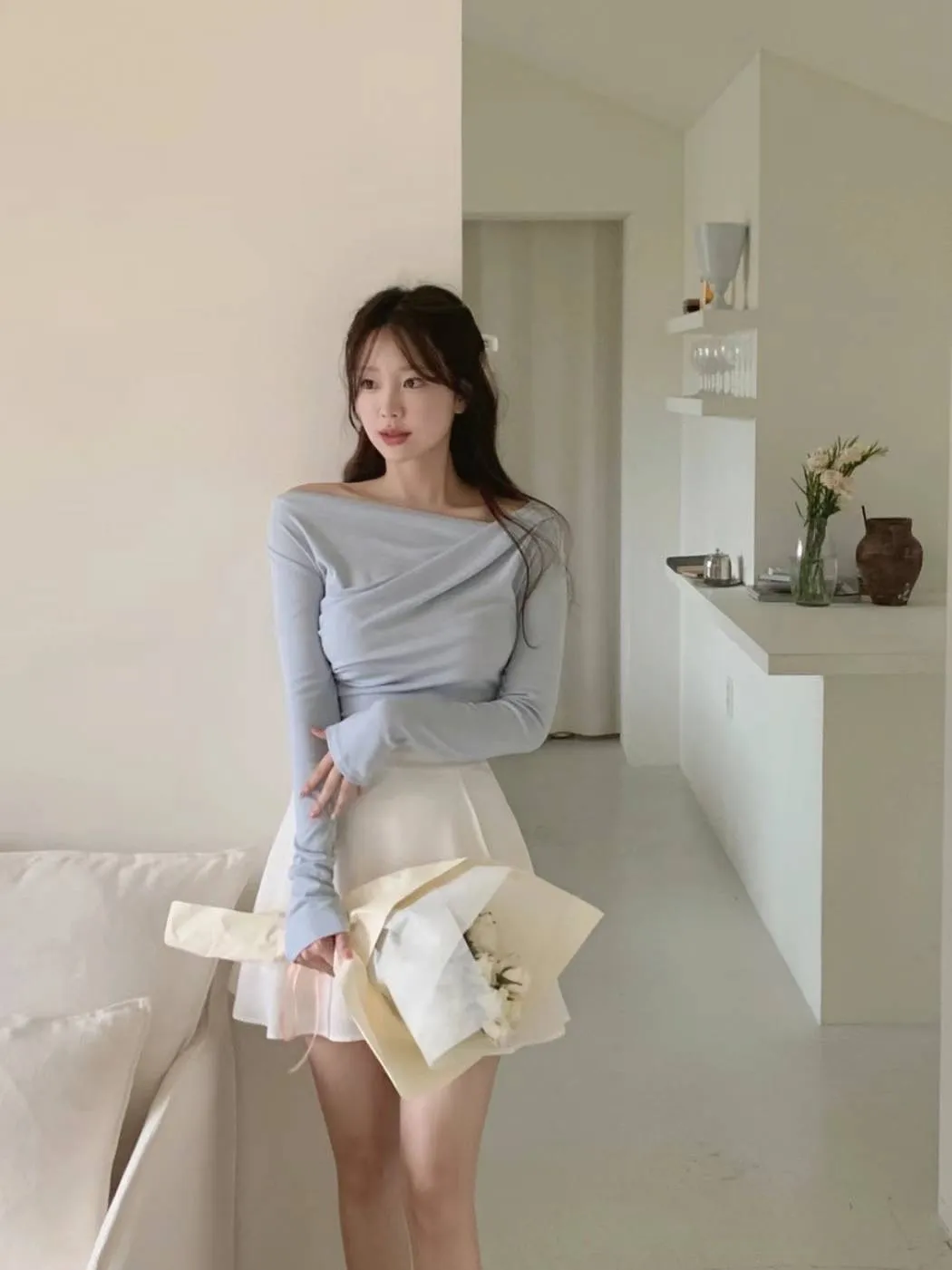 DC502斜肩女神垂墜上衣 白 奶茶 藍 粉 黑 官網價$580 線上價$550