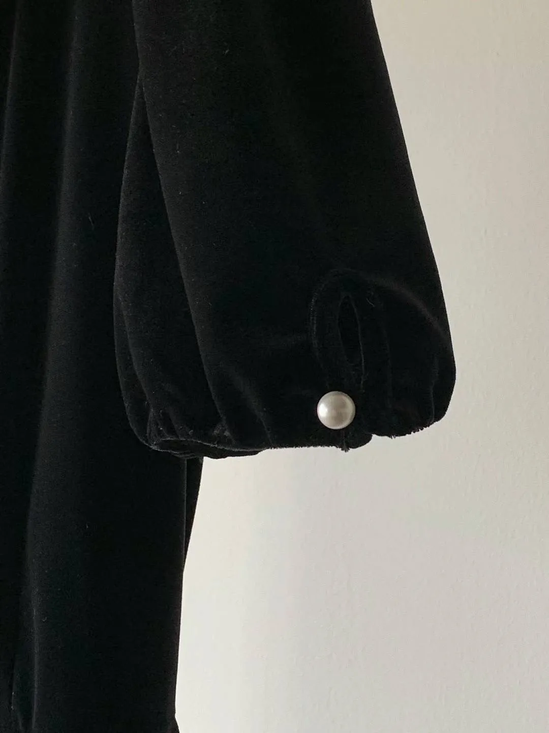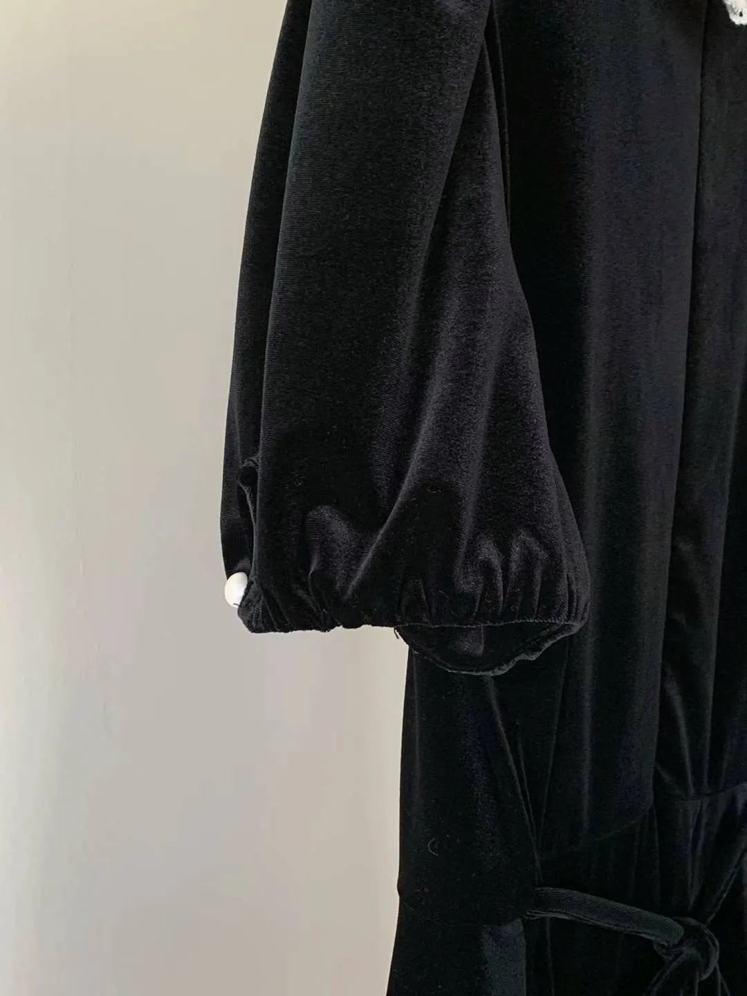 天鵝絨 蕾絲翻領 後拉鍊穿脫 細腰綁繩 袖口有釦 尺寸友善