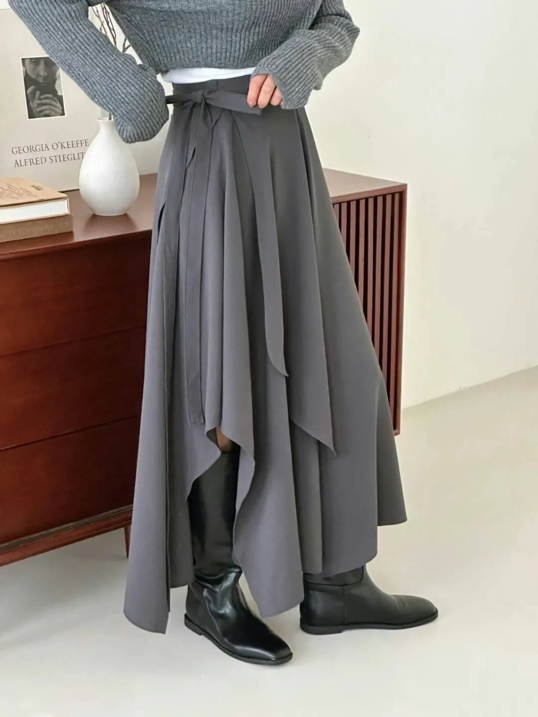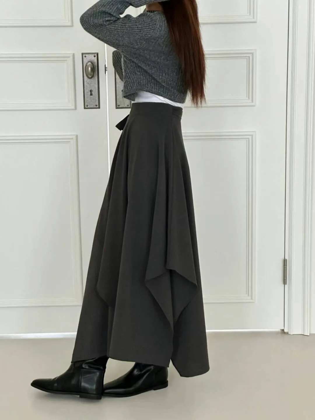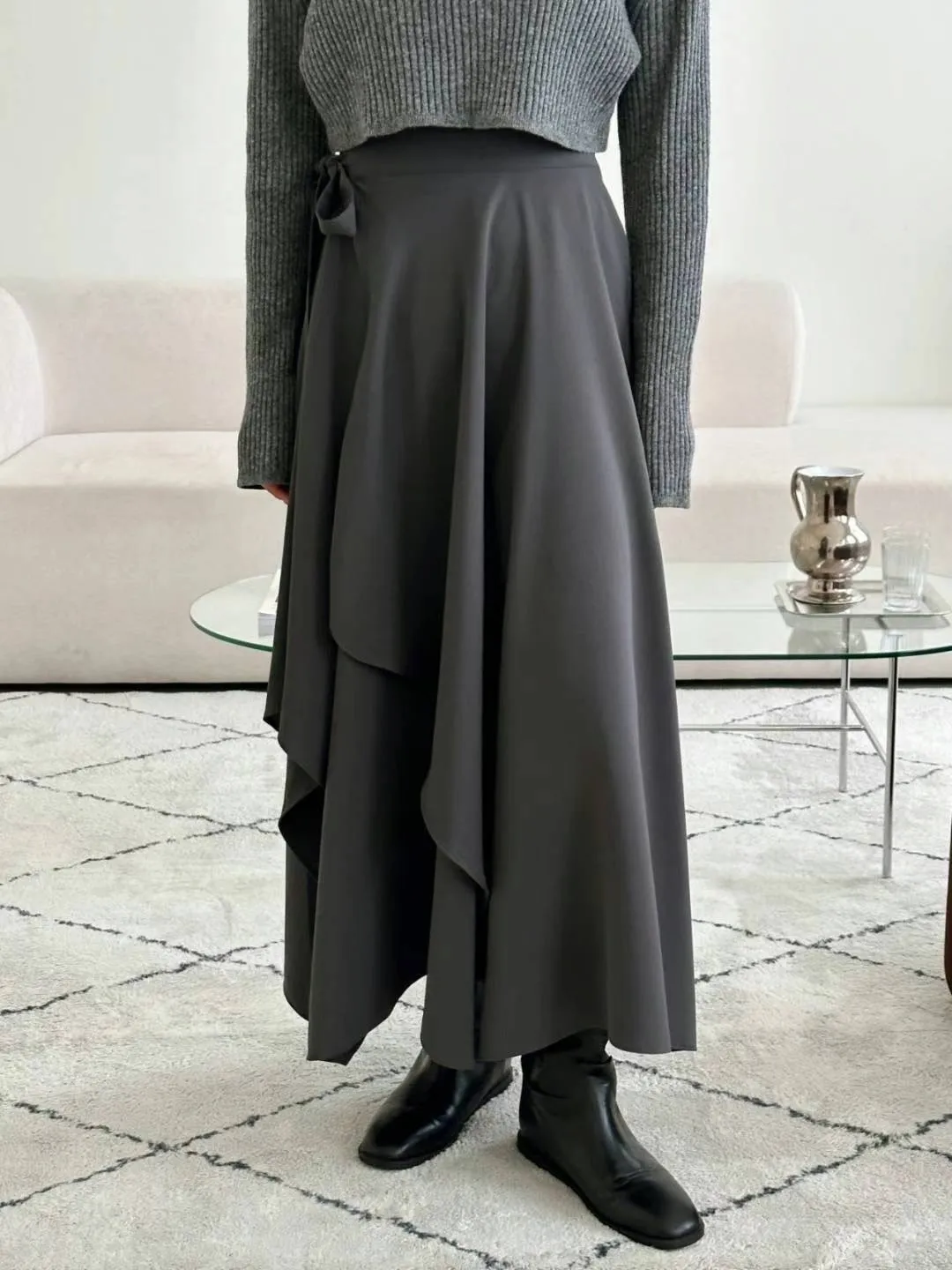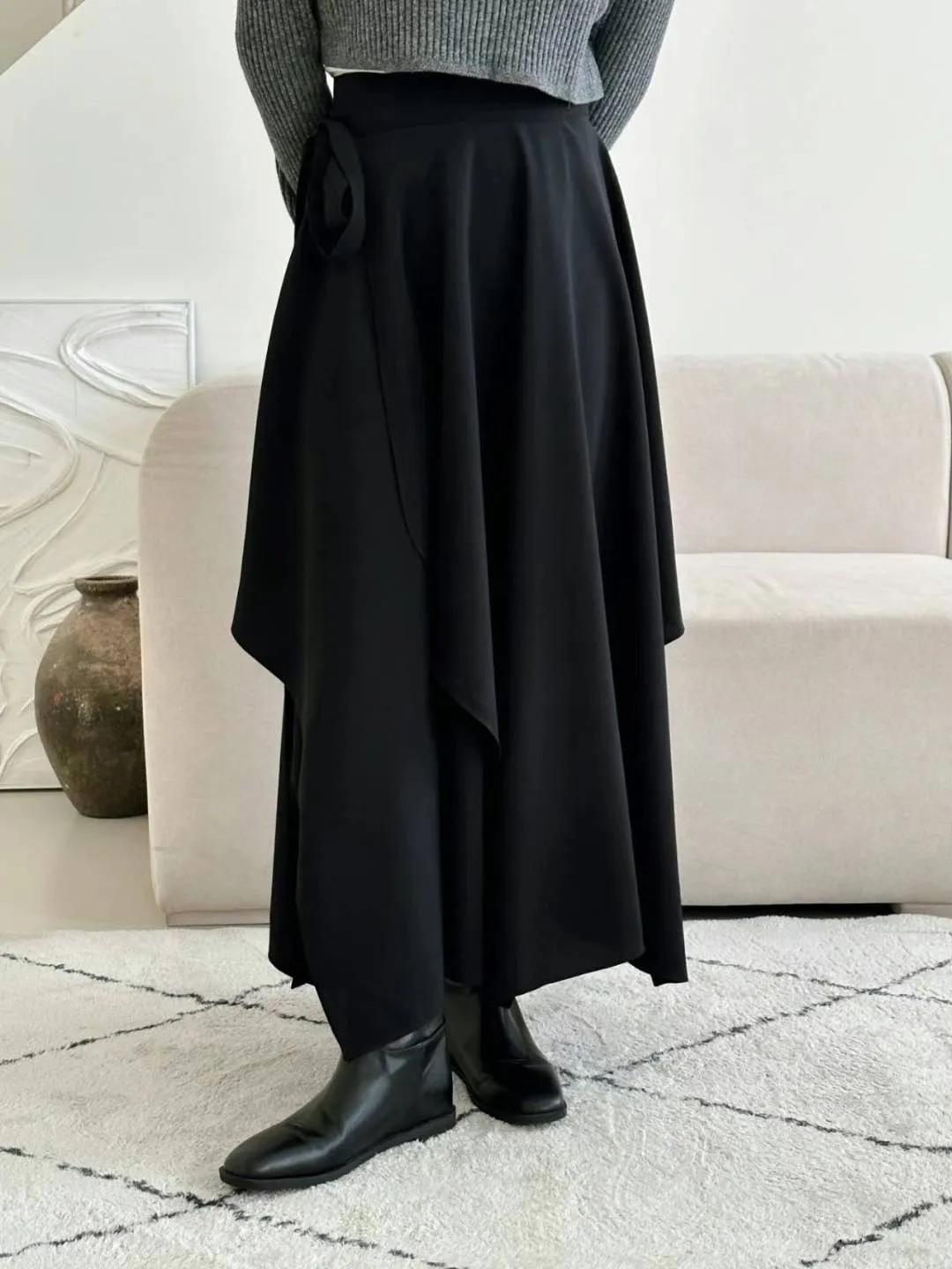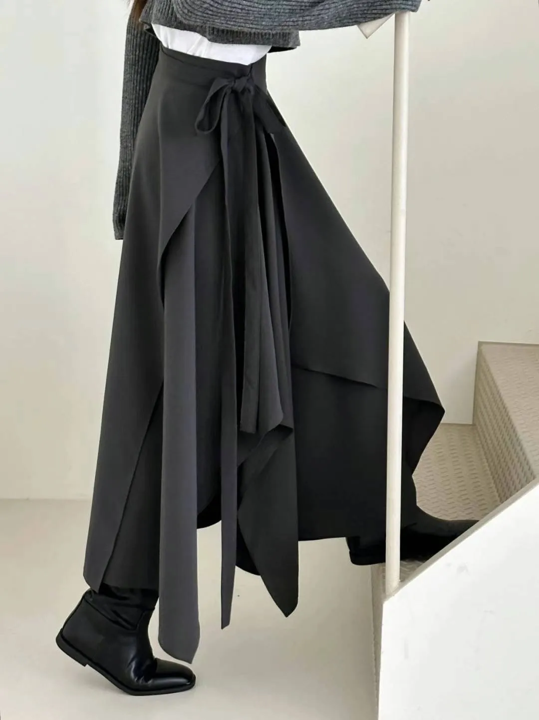 西裝面料 涼感縲縈 側腰綁帶 垂墜設計美感 不規則下擺