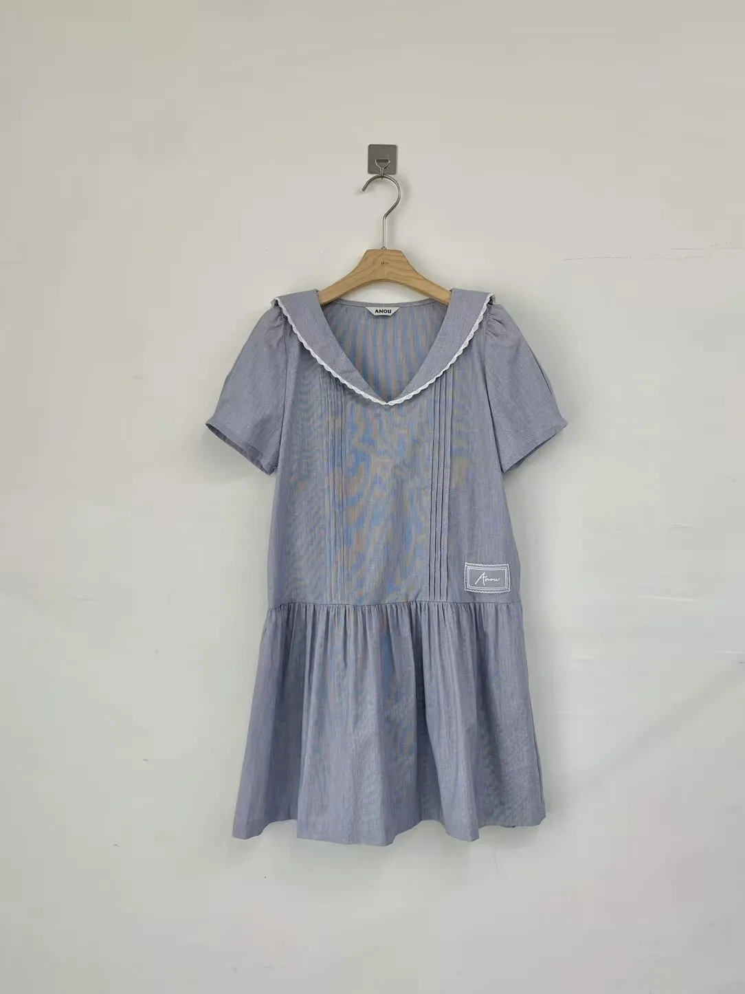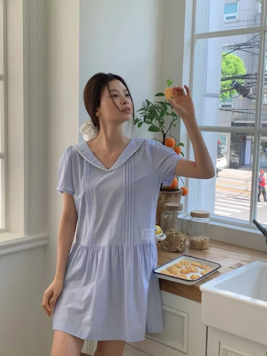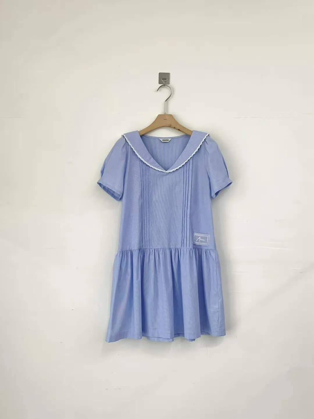 棉 薄款面料 直接穿脫 腰側刺繡小標 水手領口滾邊蕾絲 無內裡無口袋