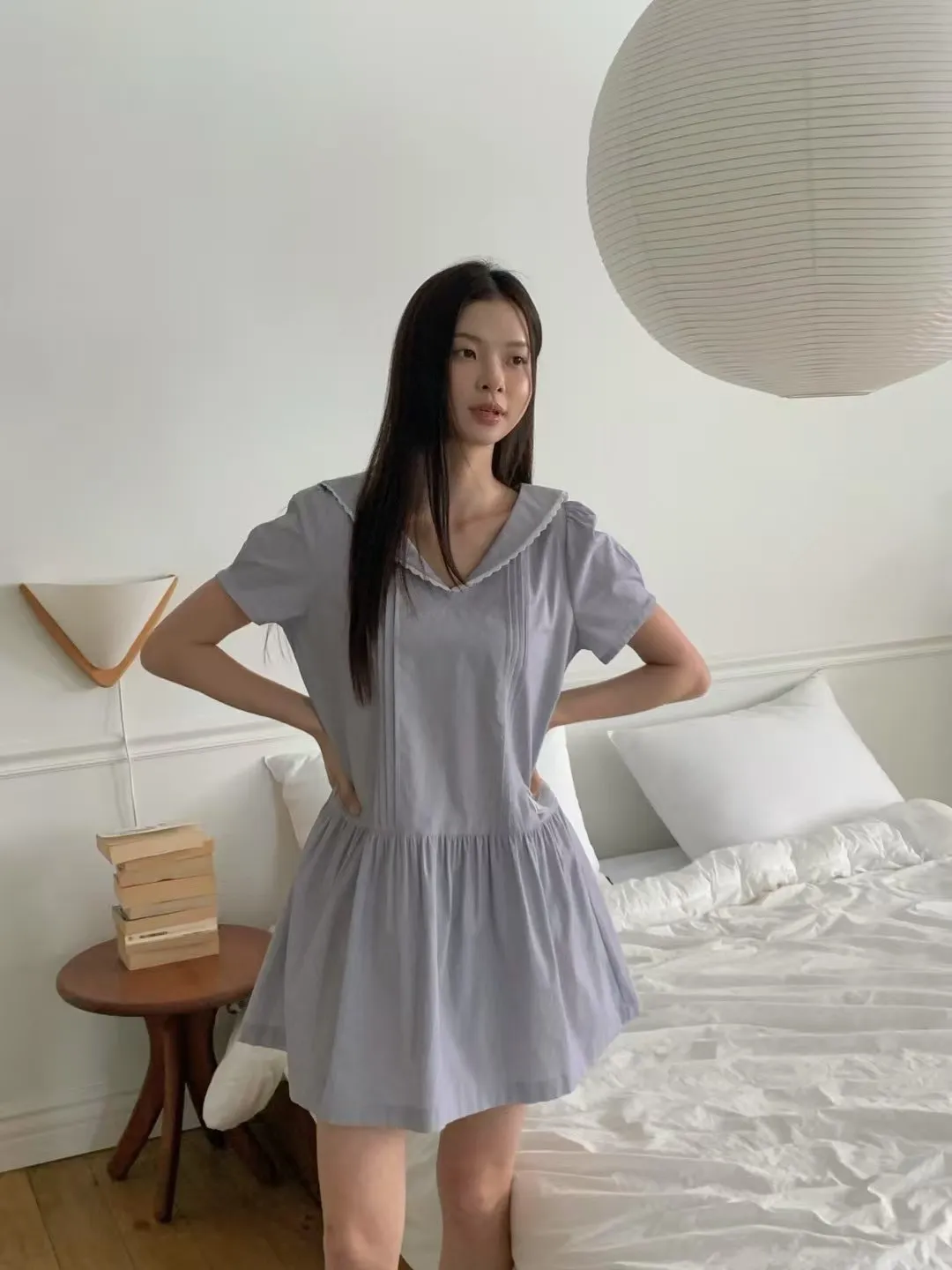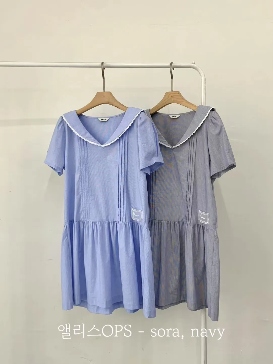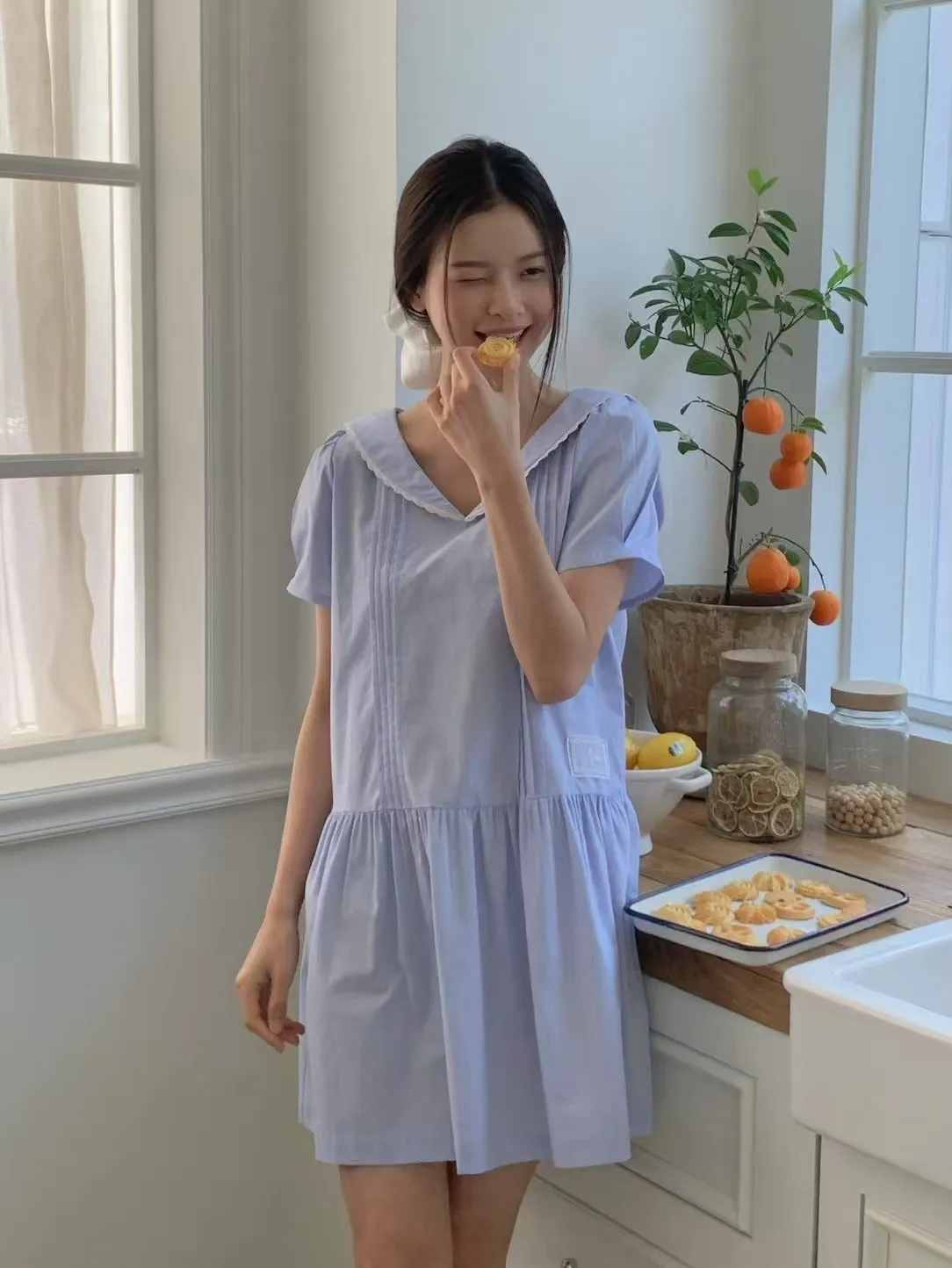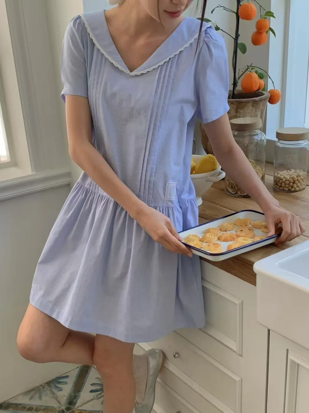 棉 薄款面料 直接穿脫 腰側刺繡小標 水手領口滾邊蕾絲 無內裡無口袋