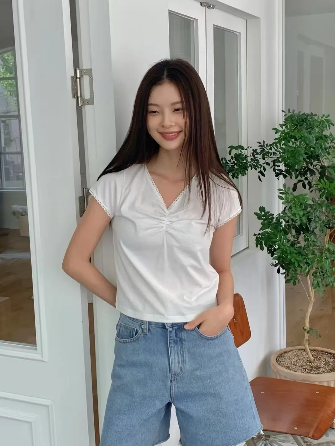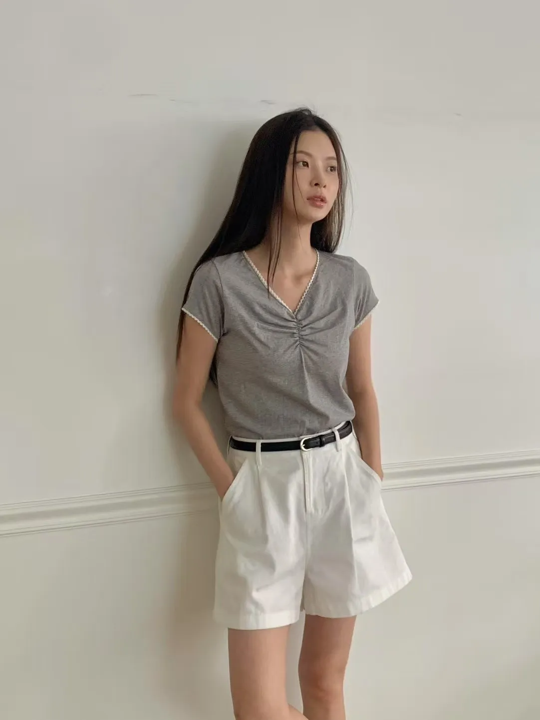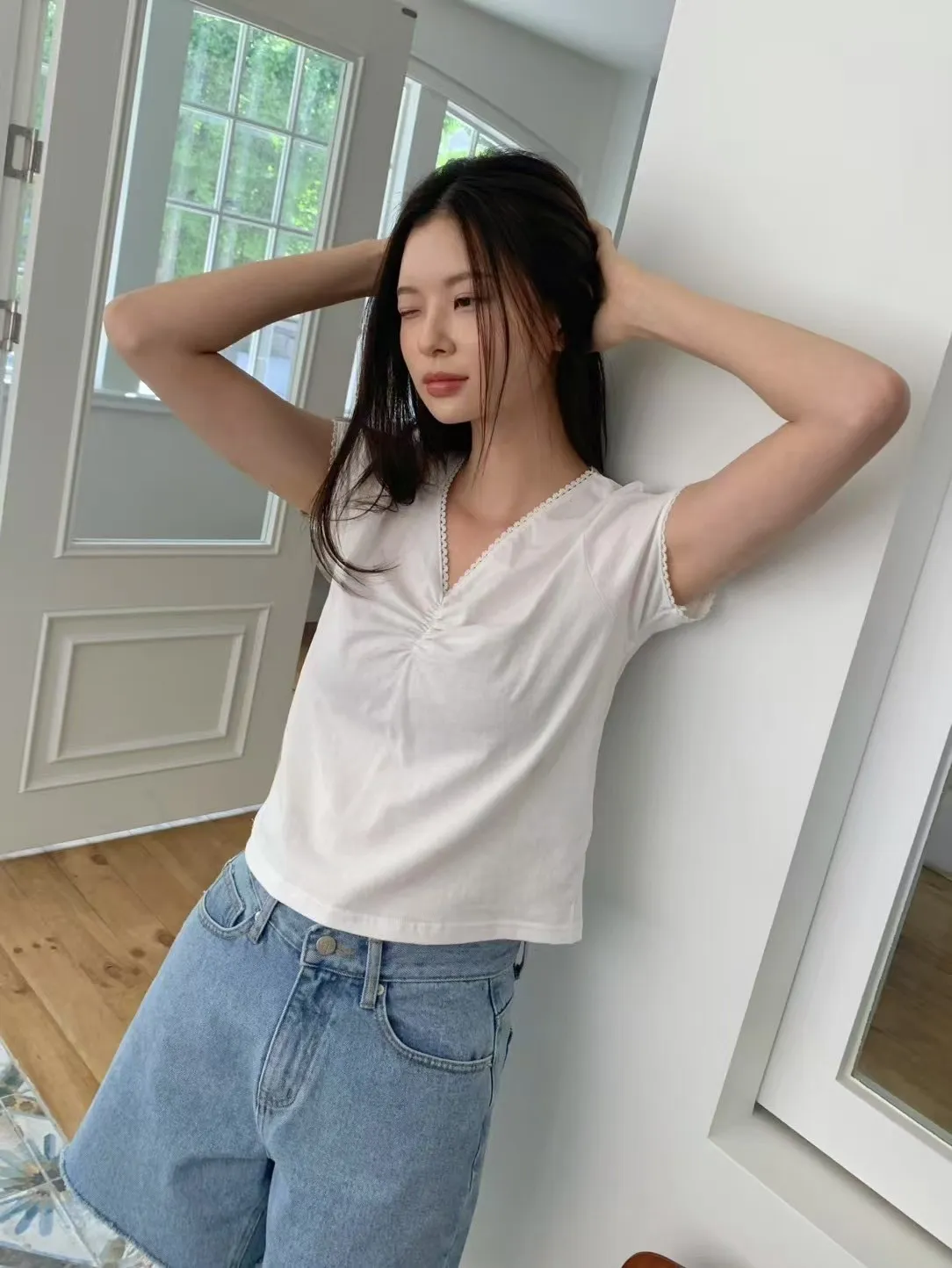 棉 舒適薄款 微彈性 胸前抓皺 V領顯瘦 領口袖口滾邊蕾絲