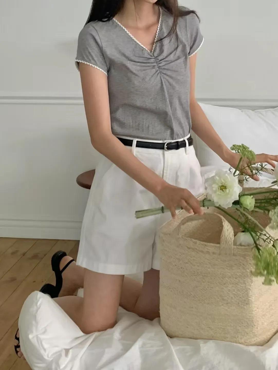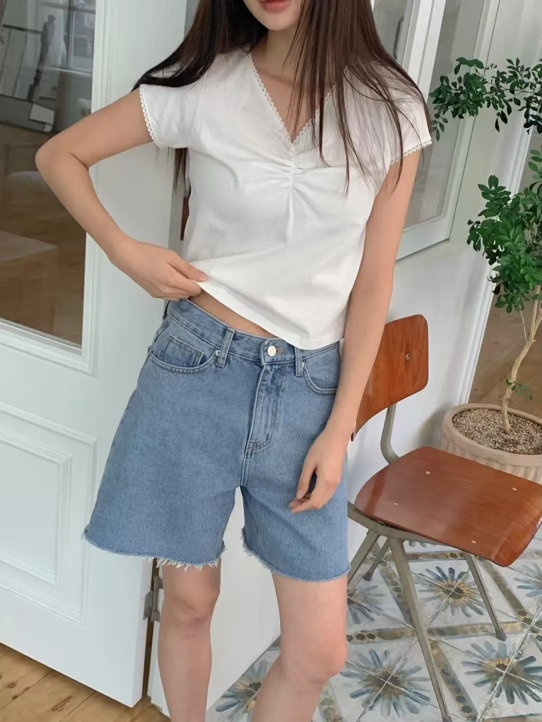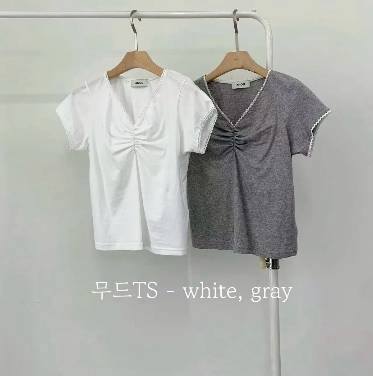 棉 舒適薄款 微彈性 胸前抓皺 V領顯瘦 領口袖口滾邊蕾絲