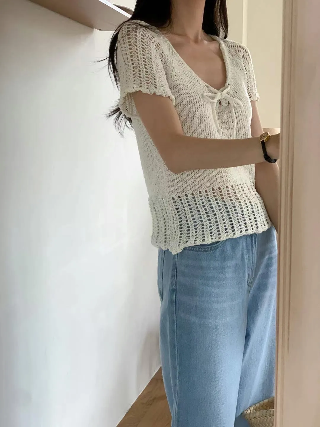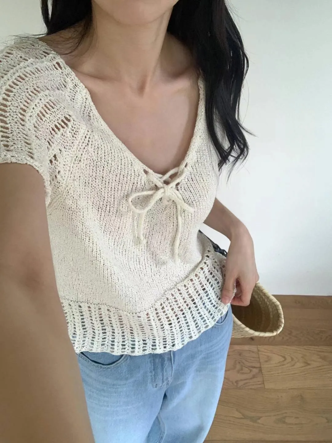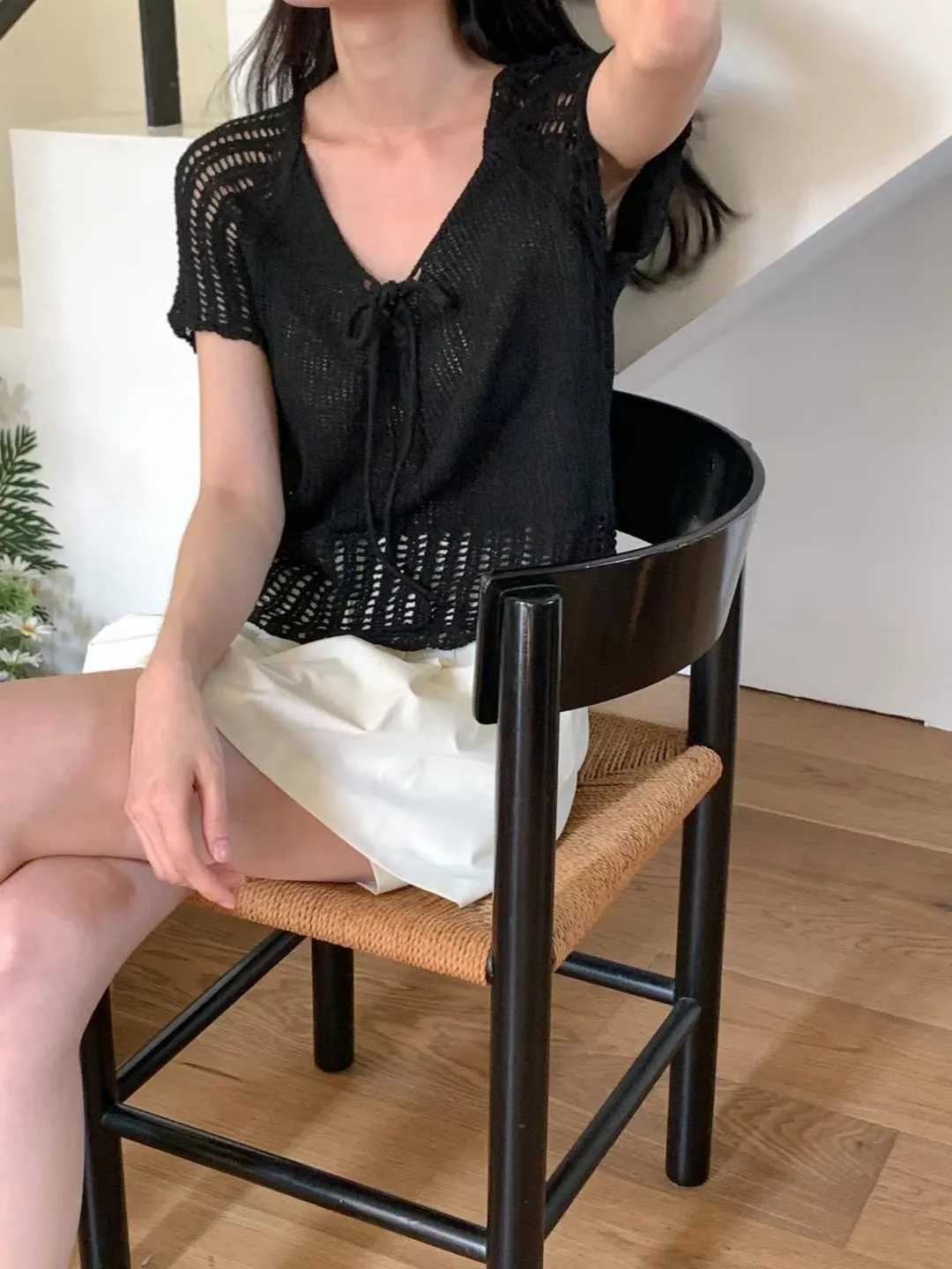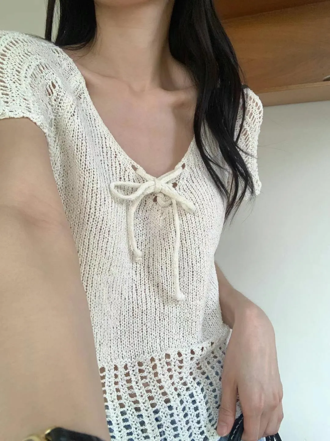 聚酯 有彈性 胸前蝴蝶結 透氣簍空針織