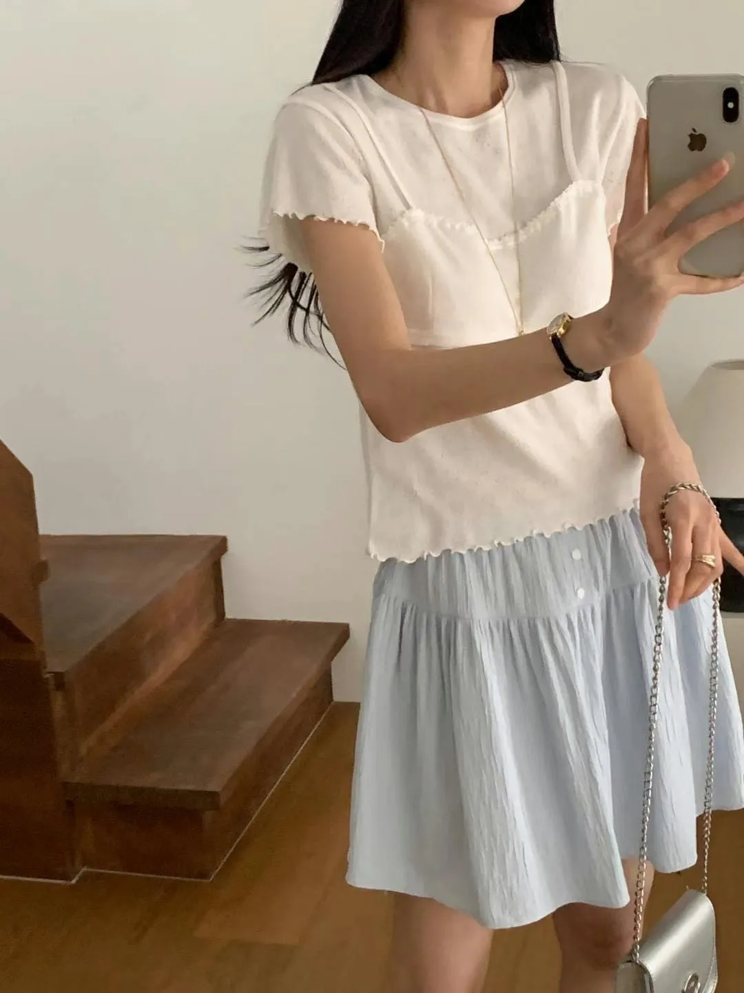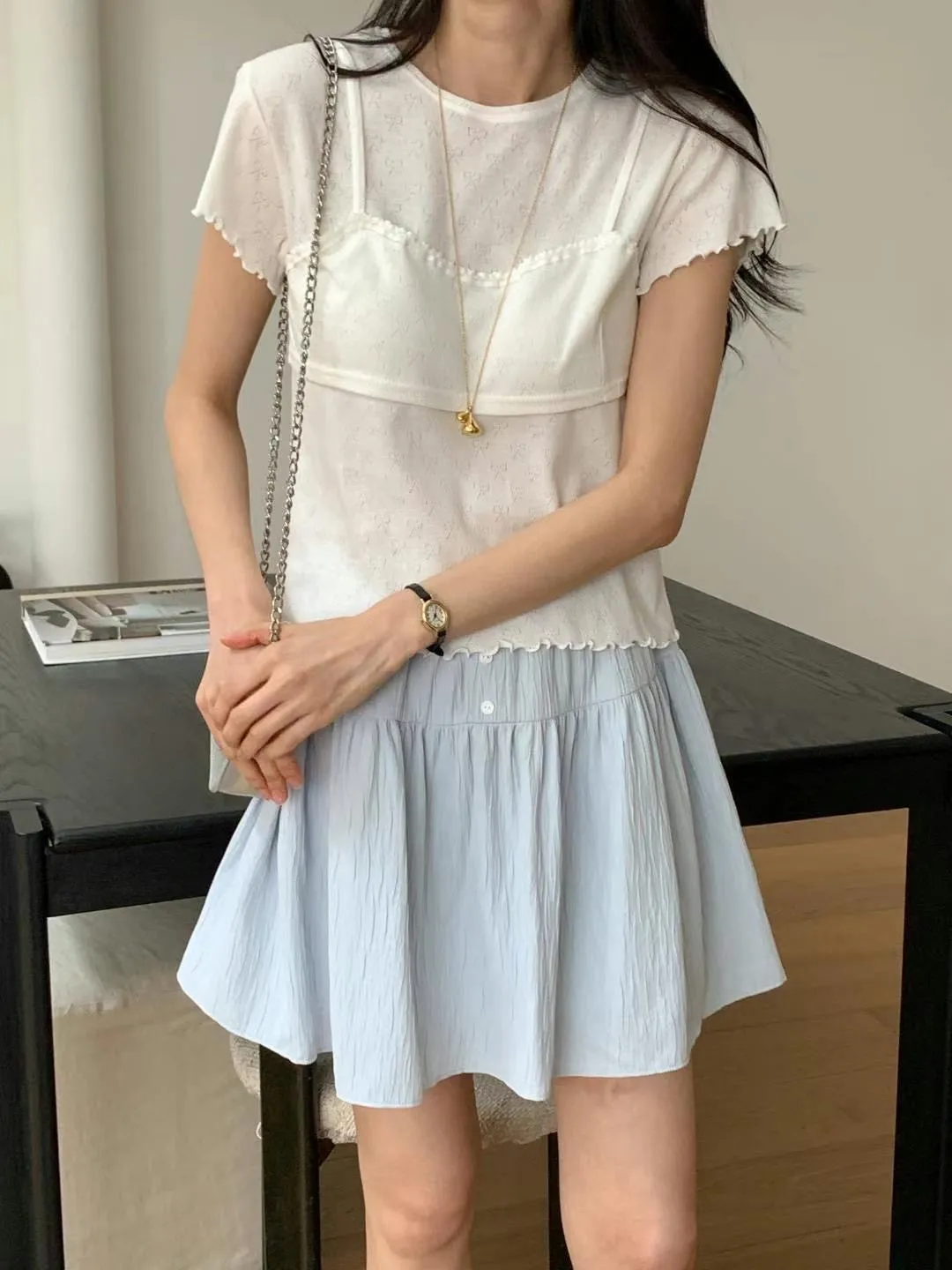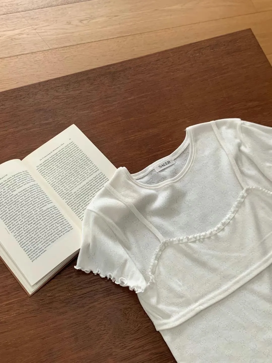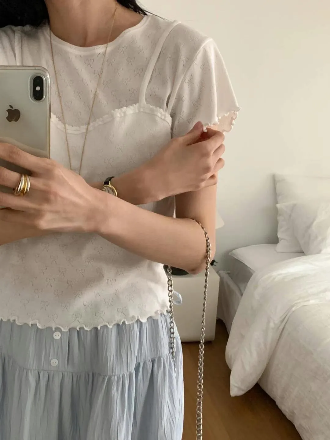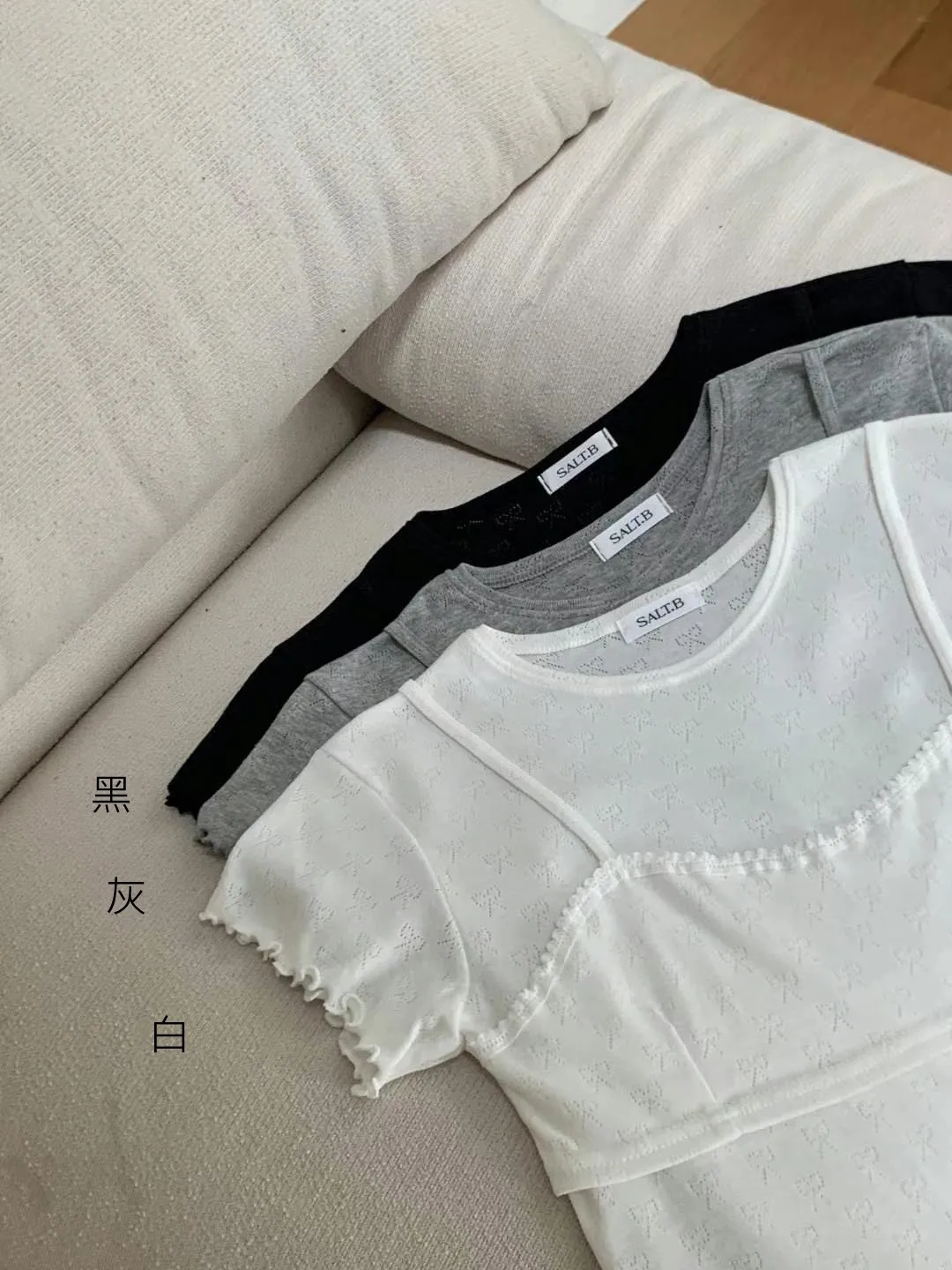 棉,假兩件,彈性很好 面料是細細的蝴蝶結簍空設計 穿到M號