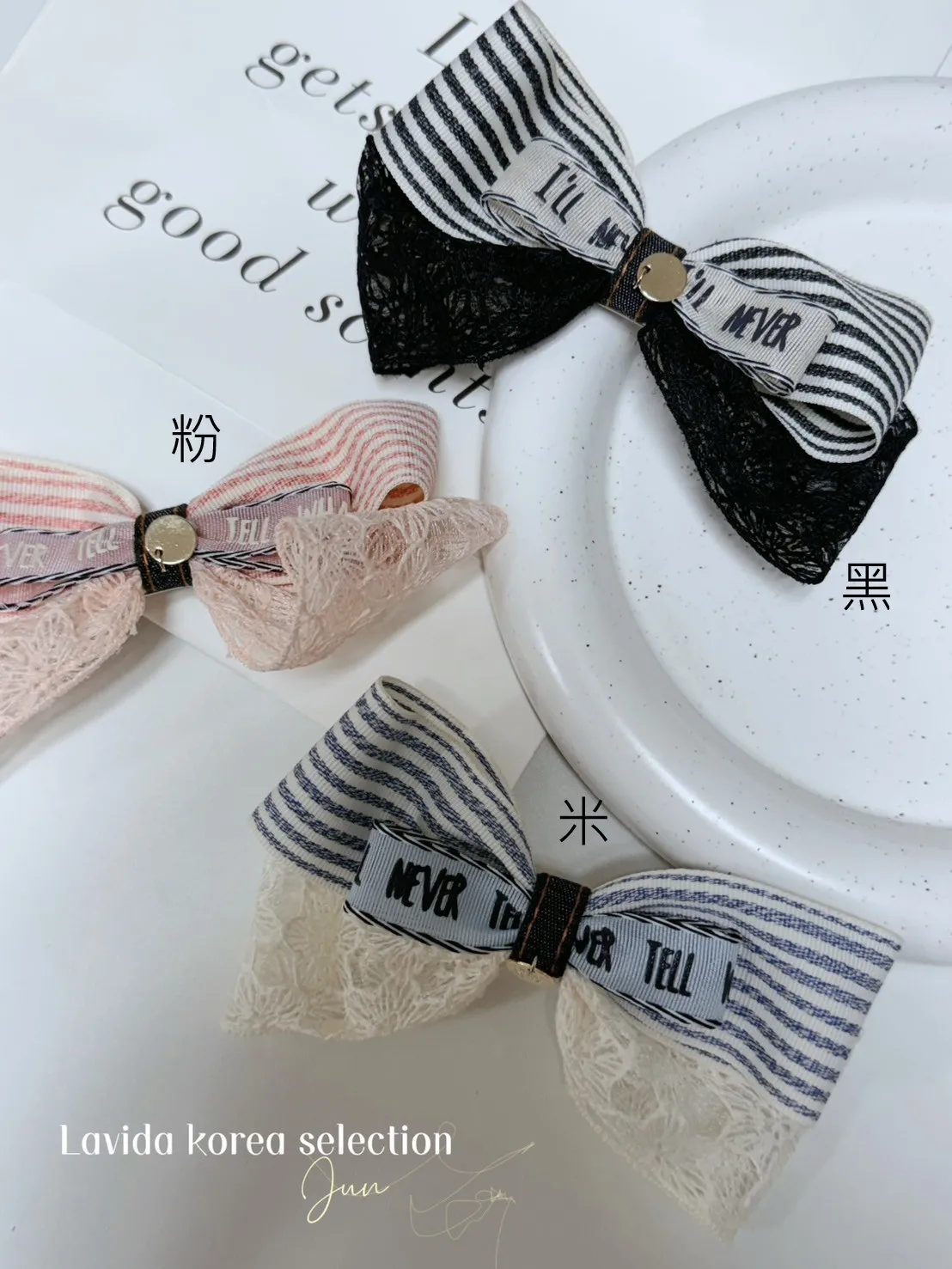 DF515條紋英文層次蕾絲髮夾 米 粉 黑 官網價$240 線上價$220