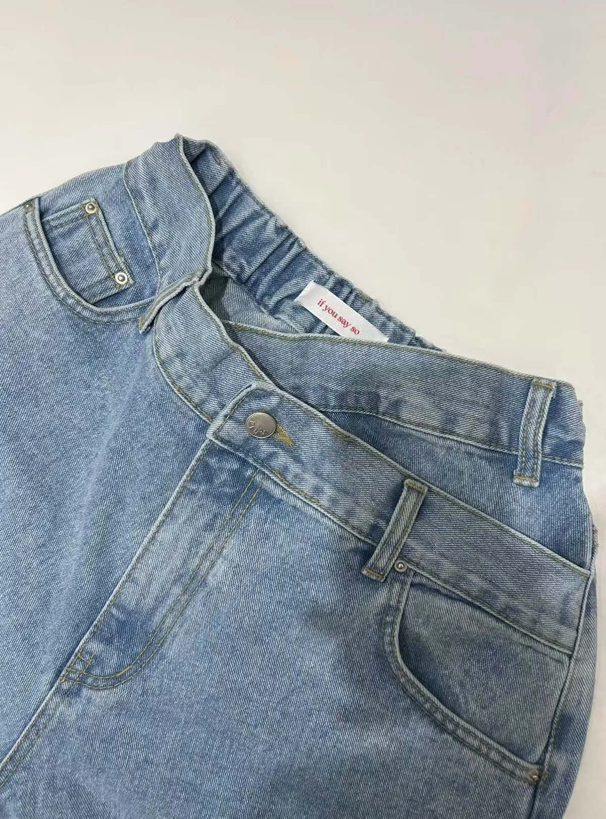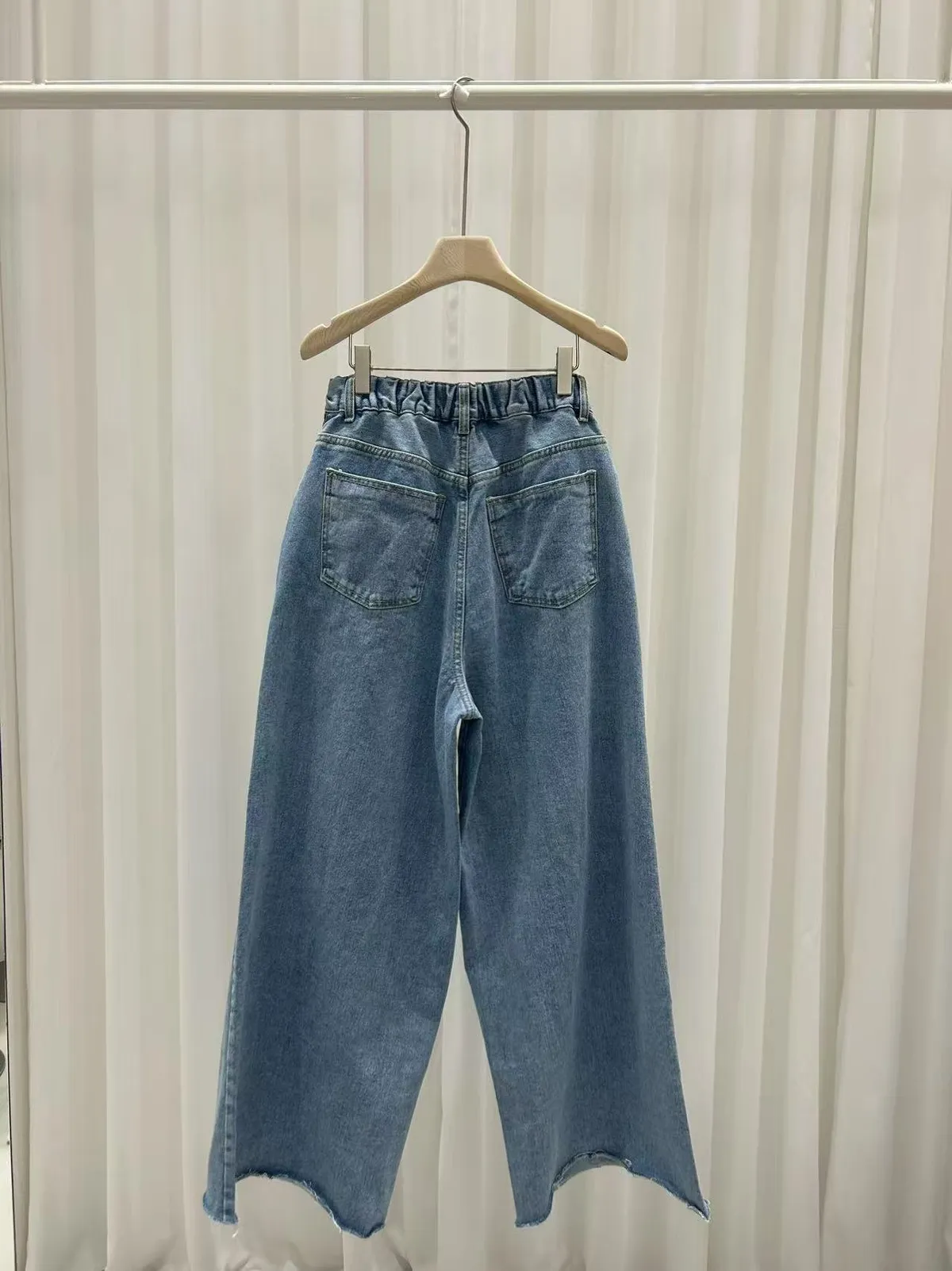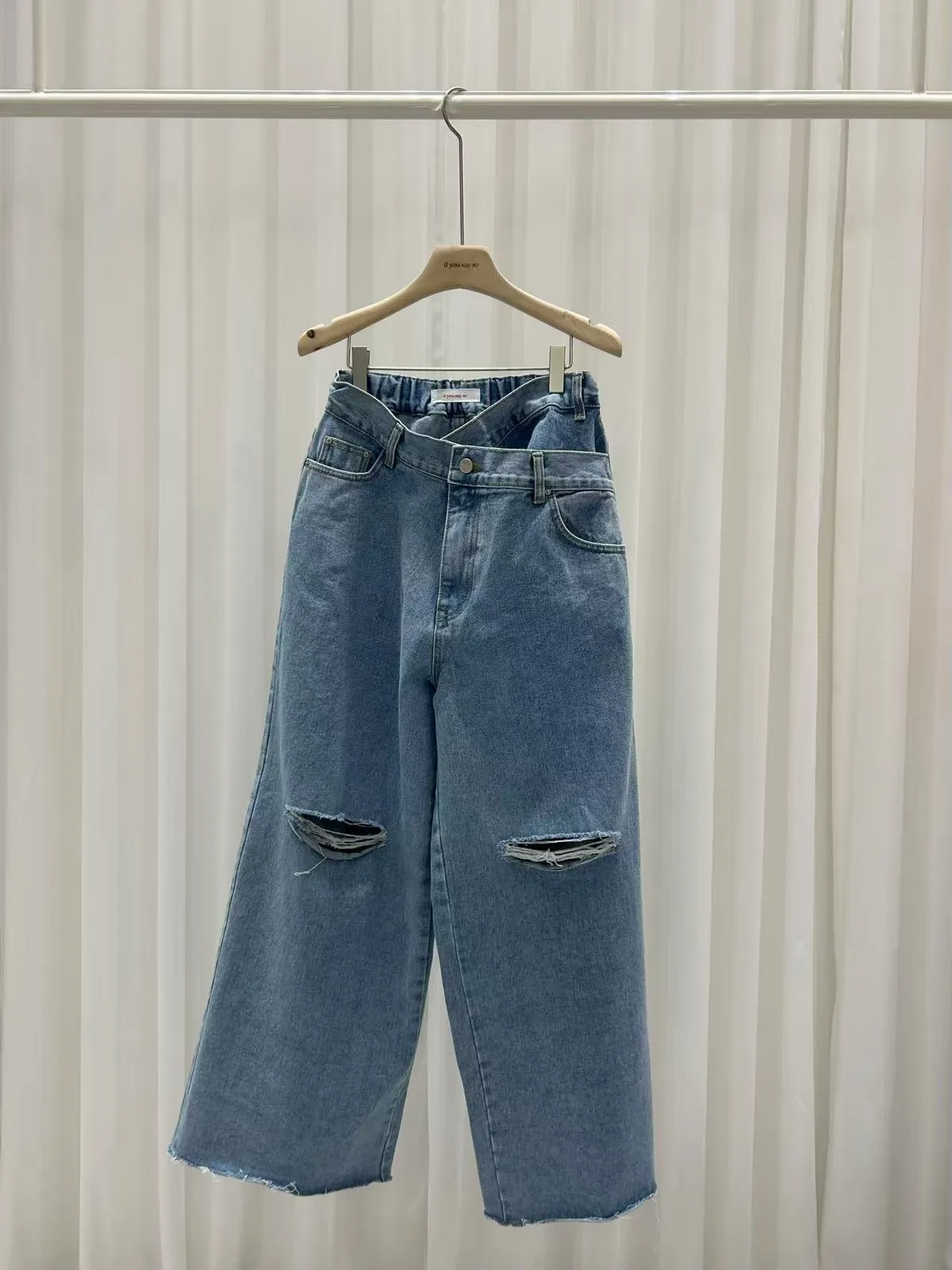 棉 雙層斜腰頭 視覺假兩層 膝蓋割破 褲管不收邊