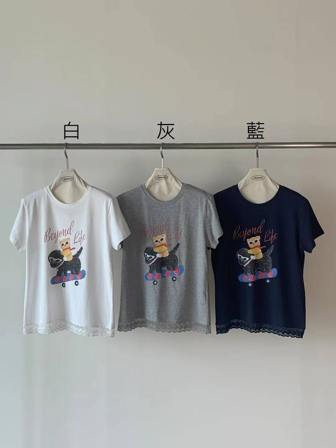 棉 柔軟舒適 插畫可愛熊狗滑板車 下擺精緻蕾絲 夏天舒適