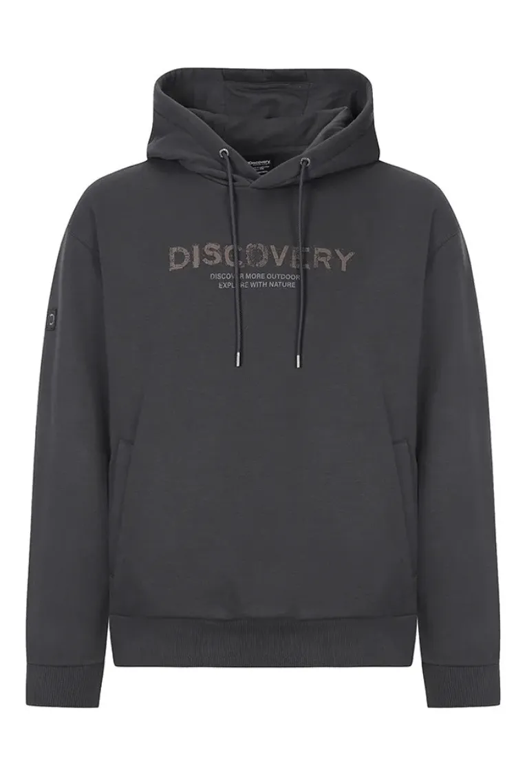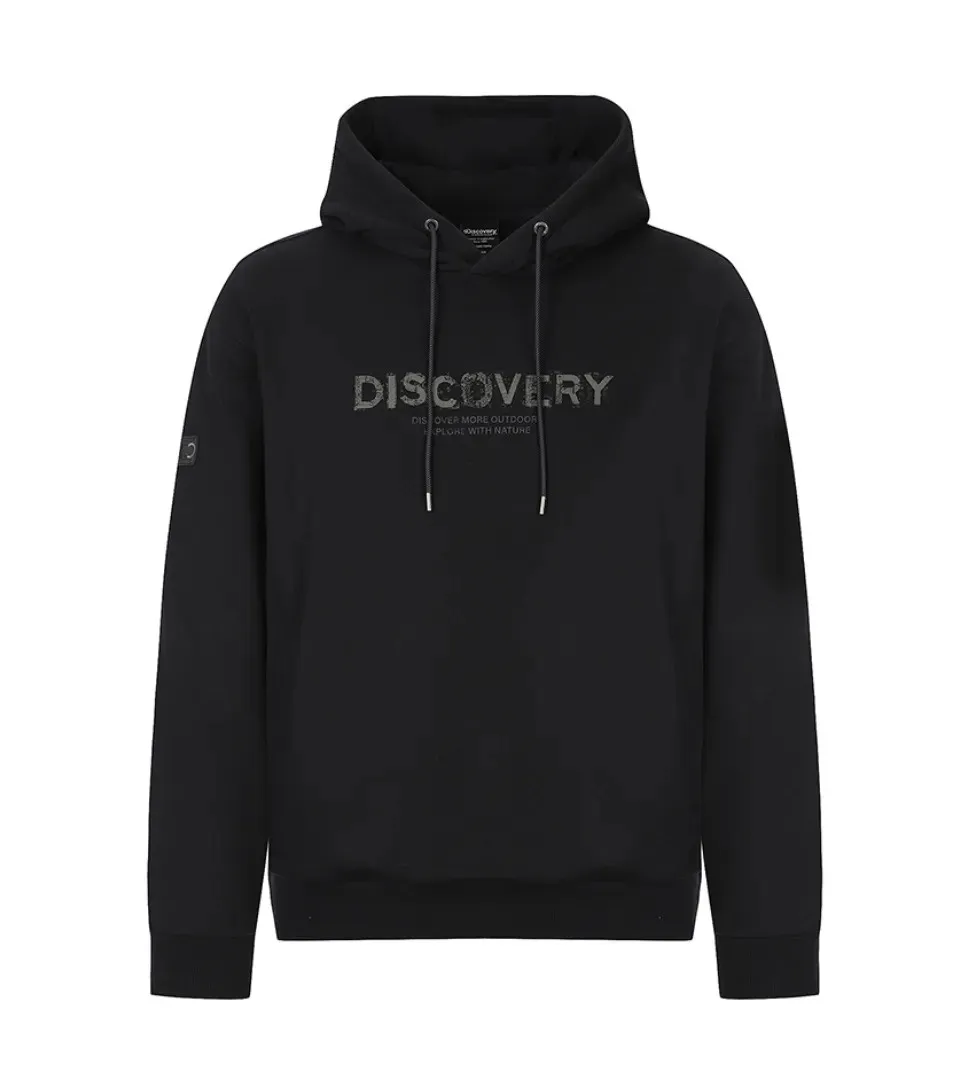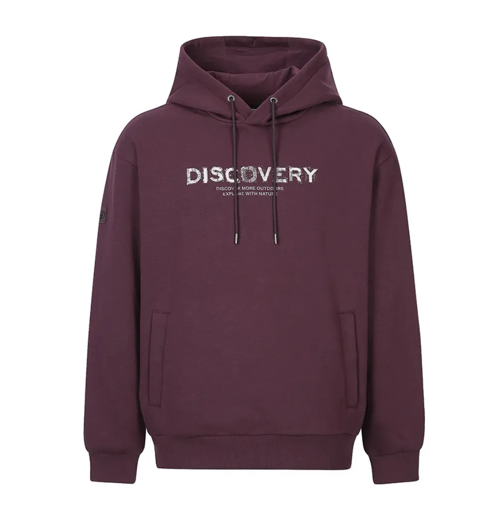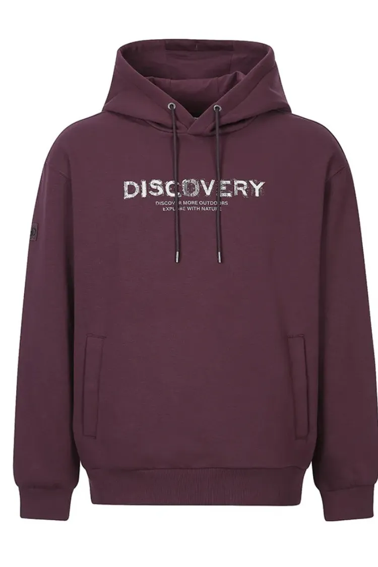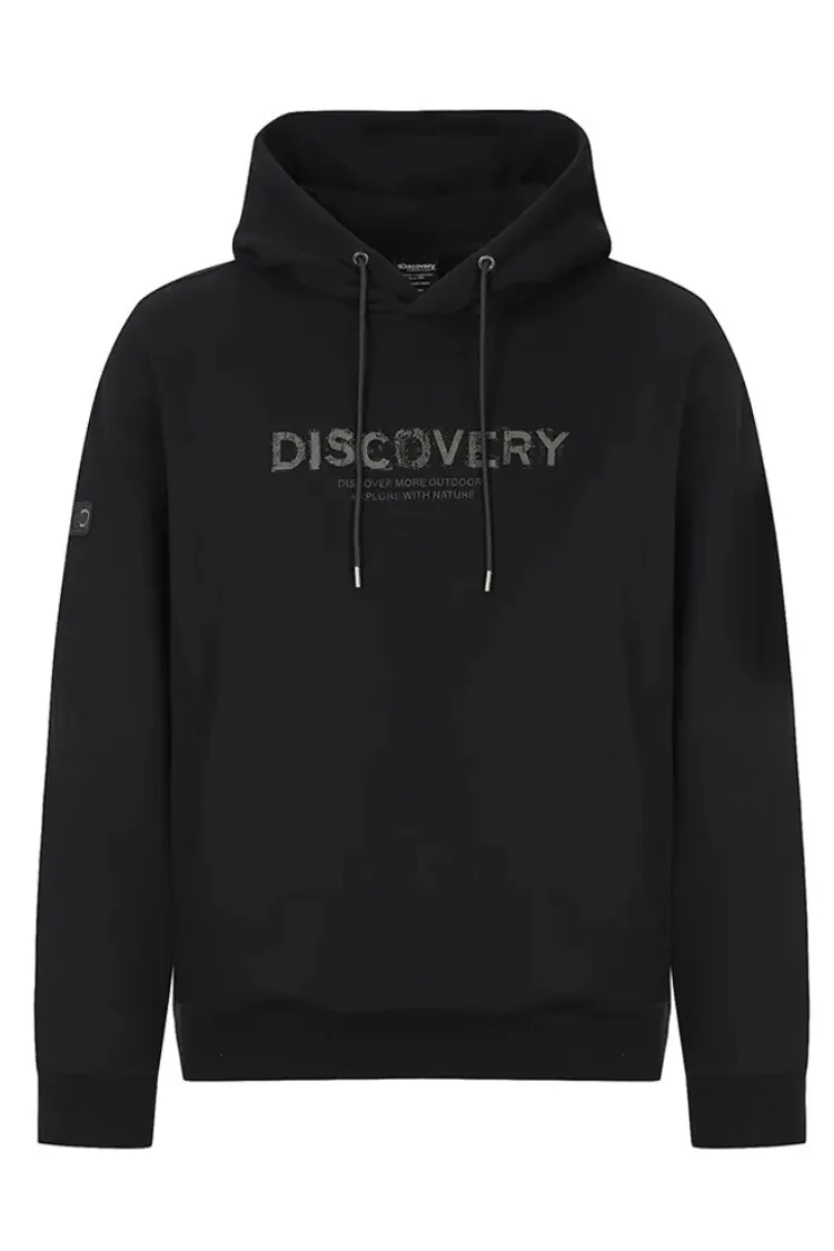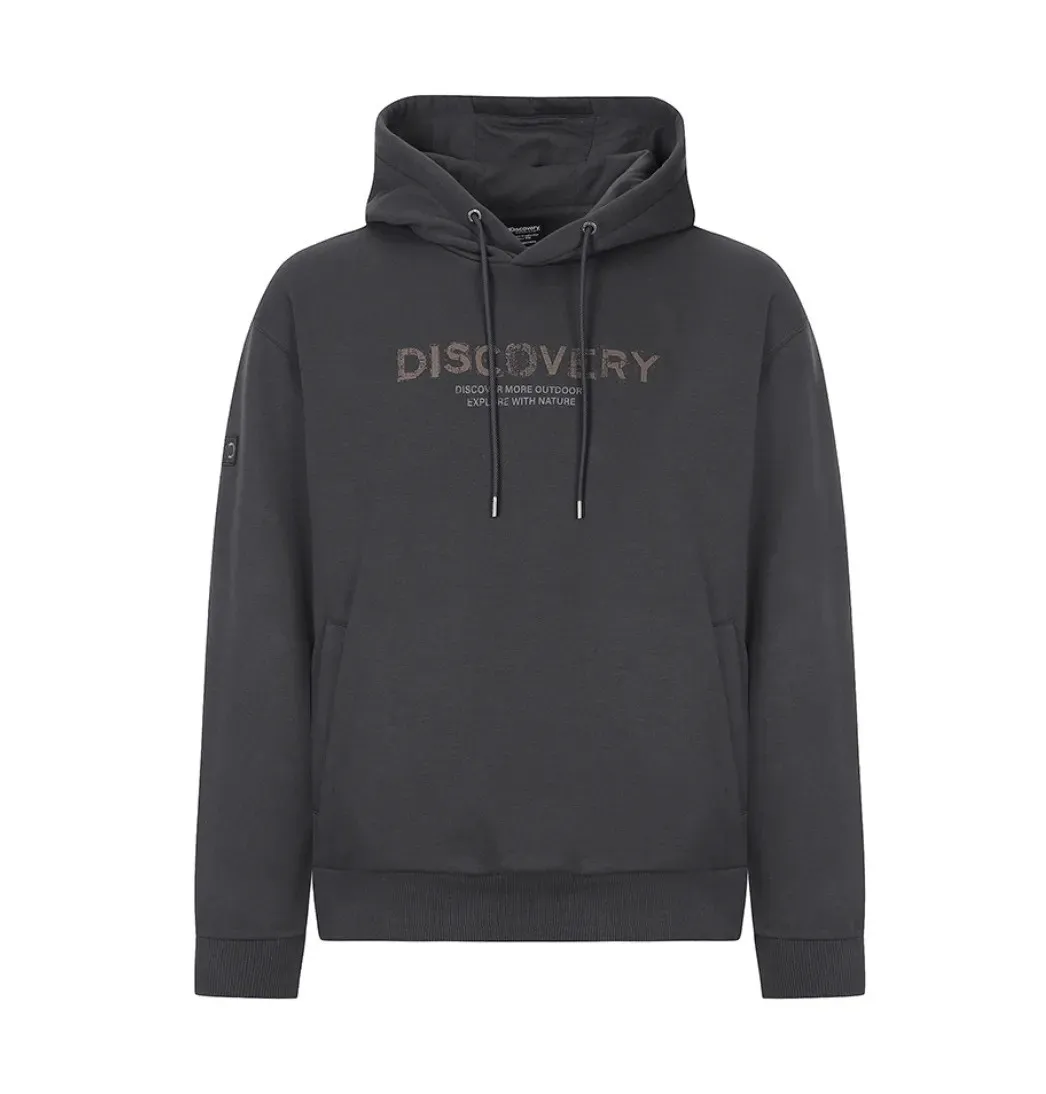 有刷毛正面印有Discovery標誌圖案。 外側口袋的設計既增添了休閒氣息,也兼具收納功能。透過在柔軟的抓絨布料中添加保暖功能性紗線,增強了布料的保暖性。