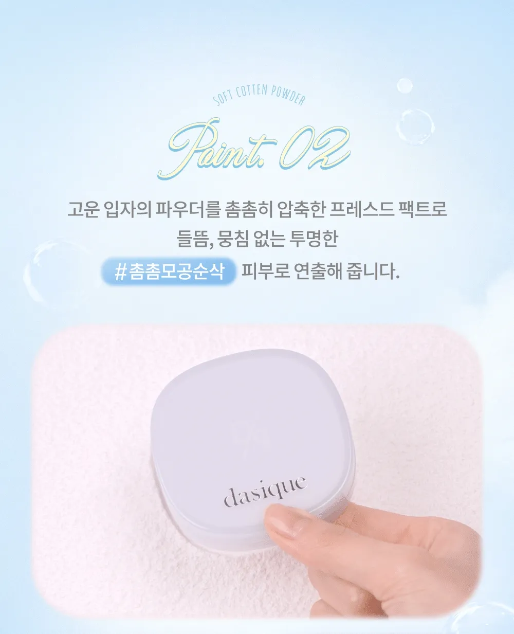 Dasique014美肌柔霧蜜粉餅(4g) 售價$520 柔軟的細粉粒子可去除不必要的油份,打造如棉花般乾爽光滑肌膚的定妝粉餅。 觸碰的瞬間柔軟棉棉細緻填充指紋間輕薄柔軟質地打造如絨毛般柔軟的嬰兒肌膚。 細緻壓縮秘密顆粒粉末的粉餅,打造不浮粉,不結塊的透明肌膚。 棉花和塔納卡樹皮提取物賦予肌膚保濕效果,長效不浮粉。內含鏡子和粉撲,可隨時隨地輕鬆打造如絨毛般乾爽的肌膚。