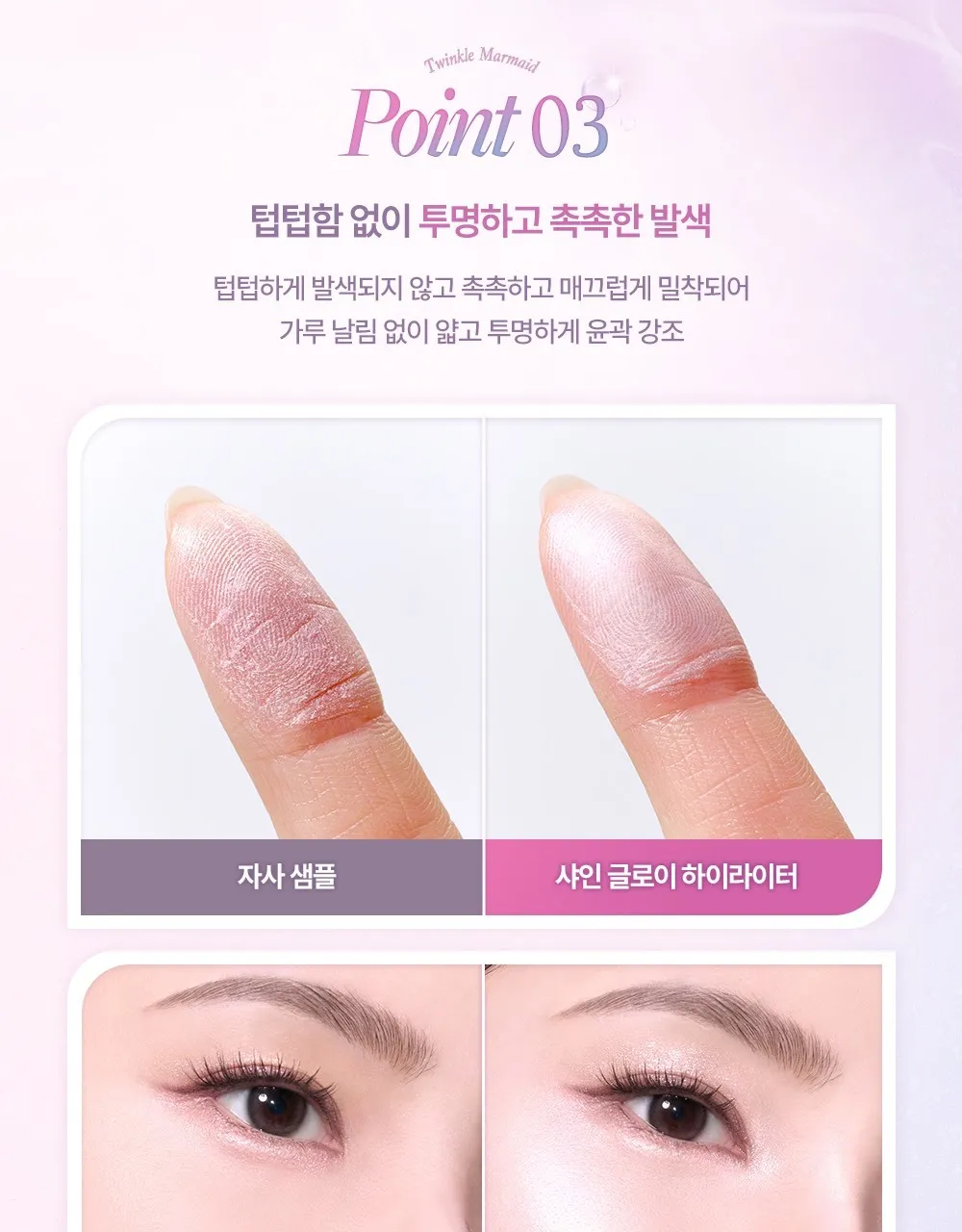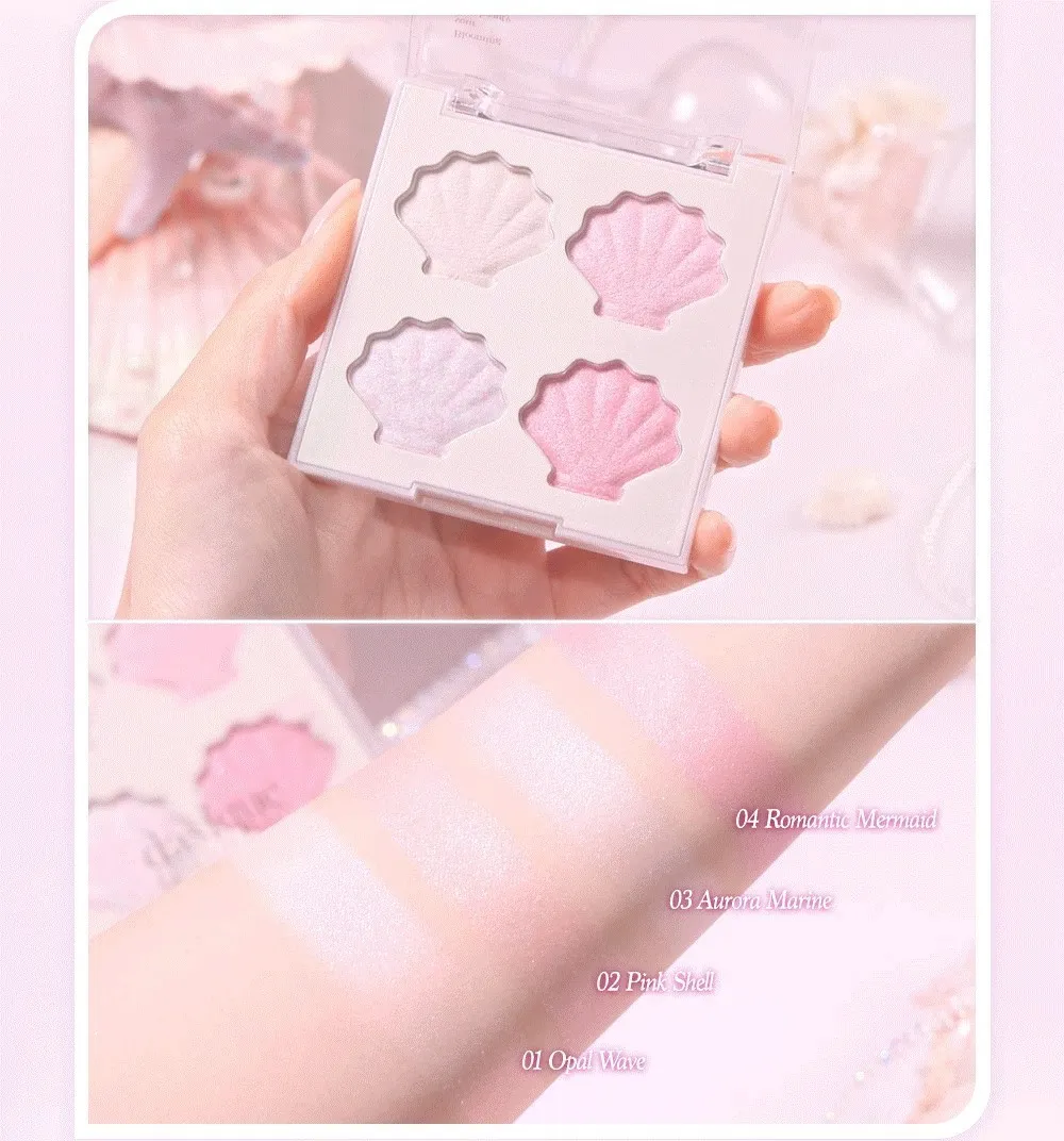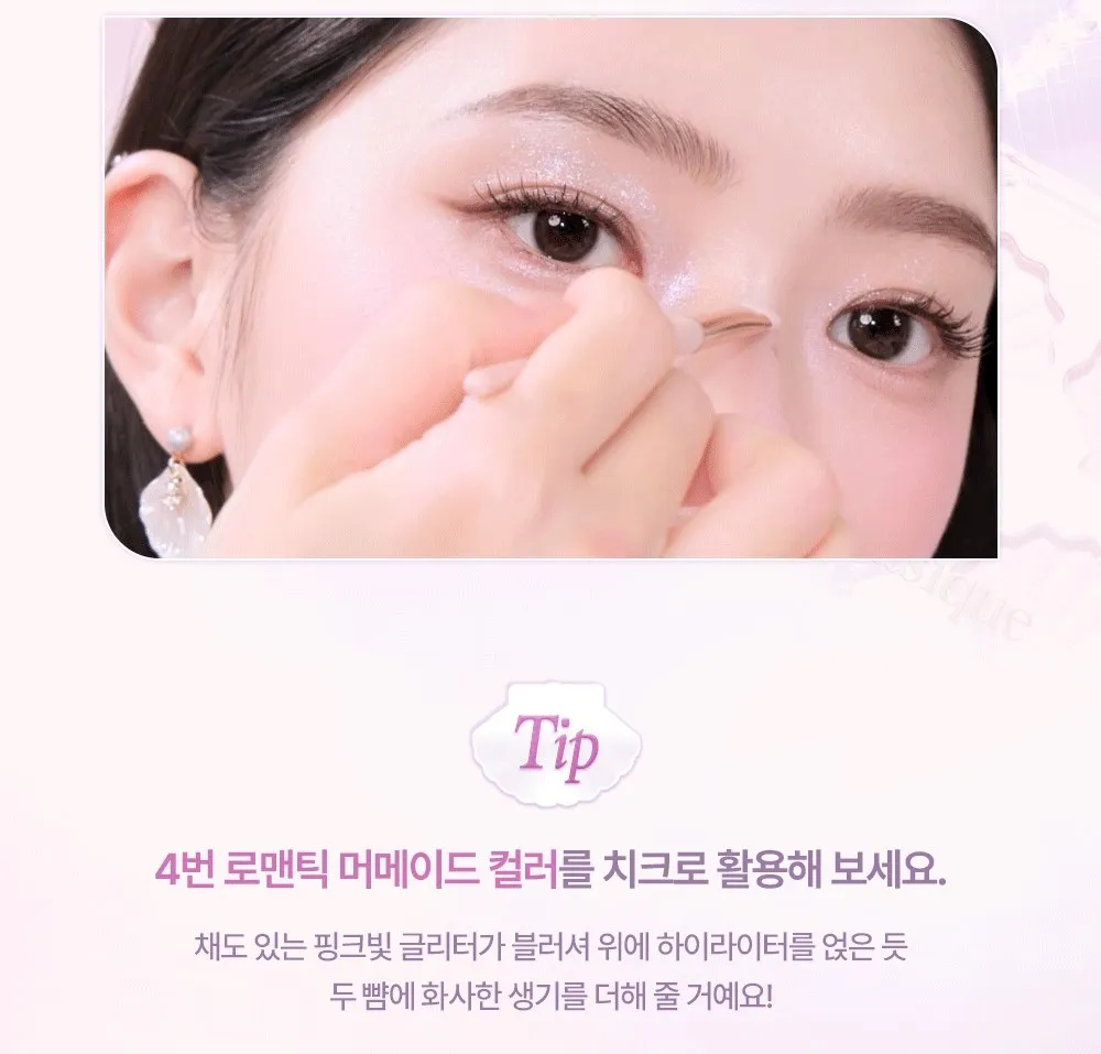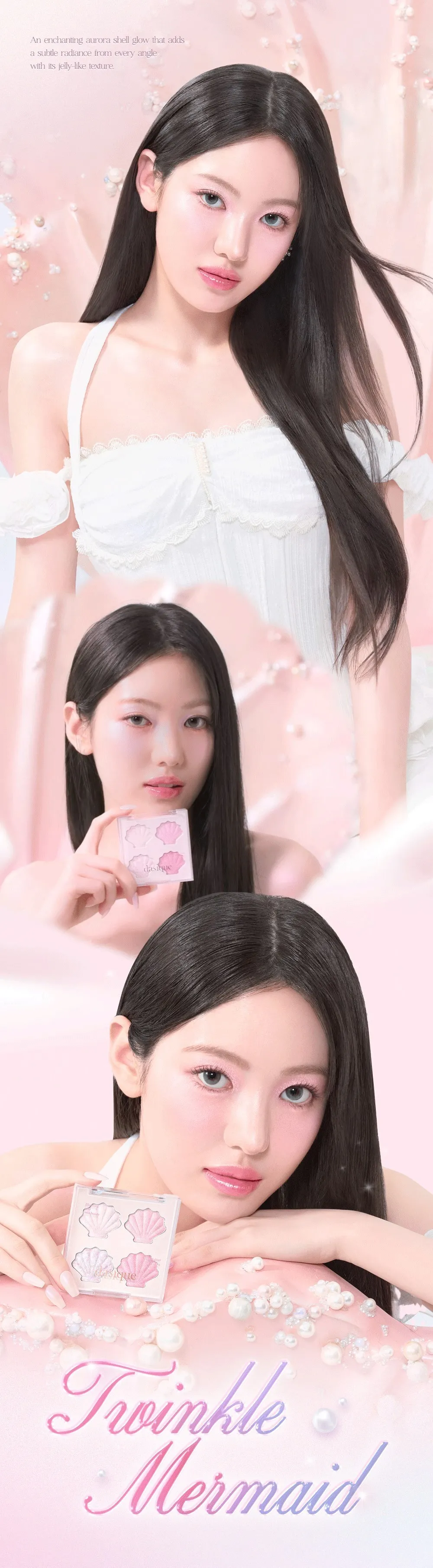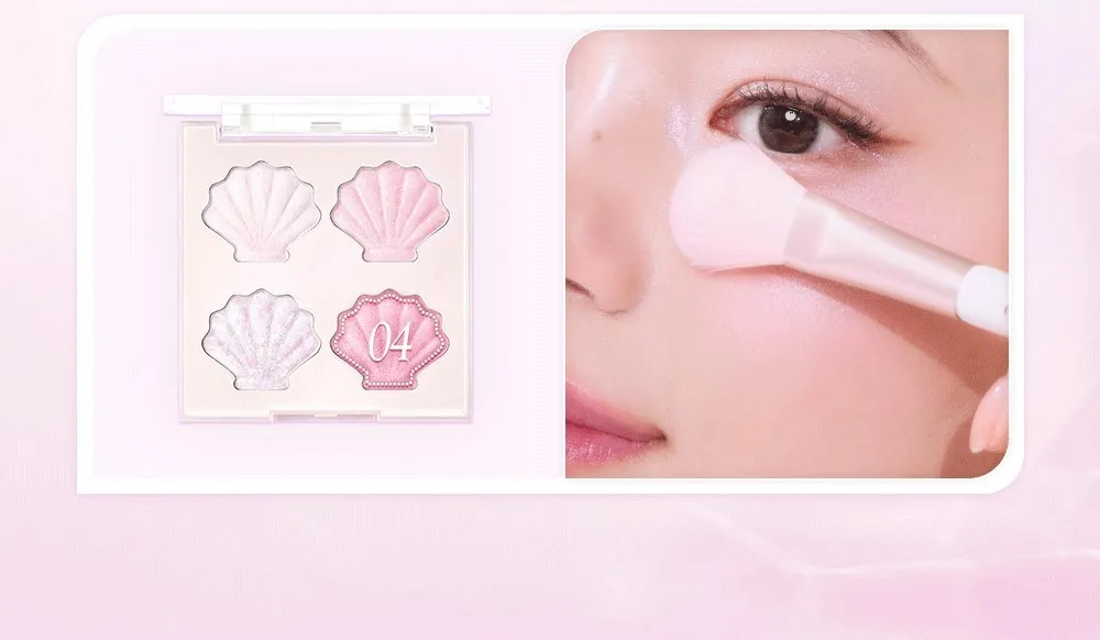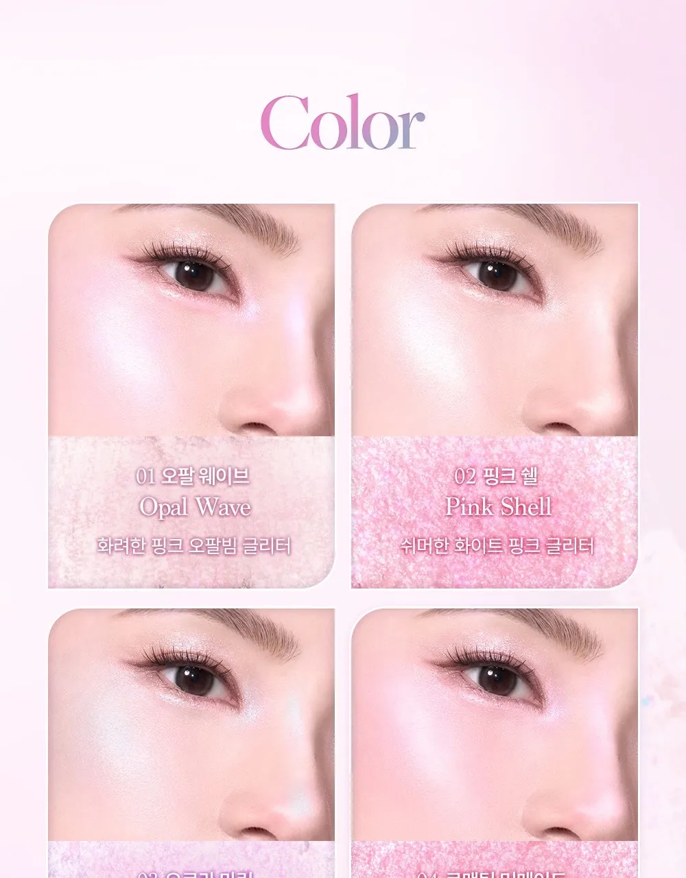 Dasique017人魚系列高光四色打亮盤(5.6g) 售價$620璀璨人魚光芒的果凍打亮盤 POINT1任何角度都能折射光彩的打亮盤由四種多彩珠光組成可依喜好自由疊擦的打亮盤 POINT2Q彈質地打造通透光澤肌膚薄塗不卡粉,均勻顯色 POINT3清透水潤顯色,無厚重感呈現水潤透亮妝效,自然貼合不飛粉輕鬆勾勒立體輪廓 取適量產品,可用手、粉撲或刷具輕輕塗抹在鼻樑、眼頭或唇峰等需要打亮的部位。 04 ROMANTIC MERMAID可作為腮紅使用飽和的粉色珠光可疊加在腮紅上就像打亮疊加效果,為雙頰增添明亮生機。