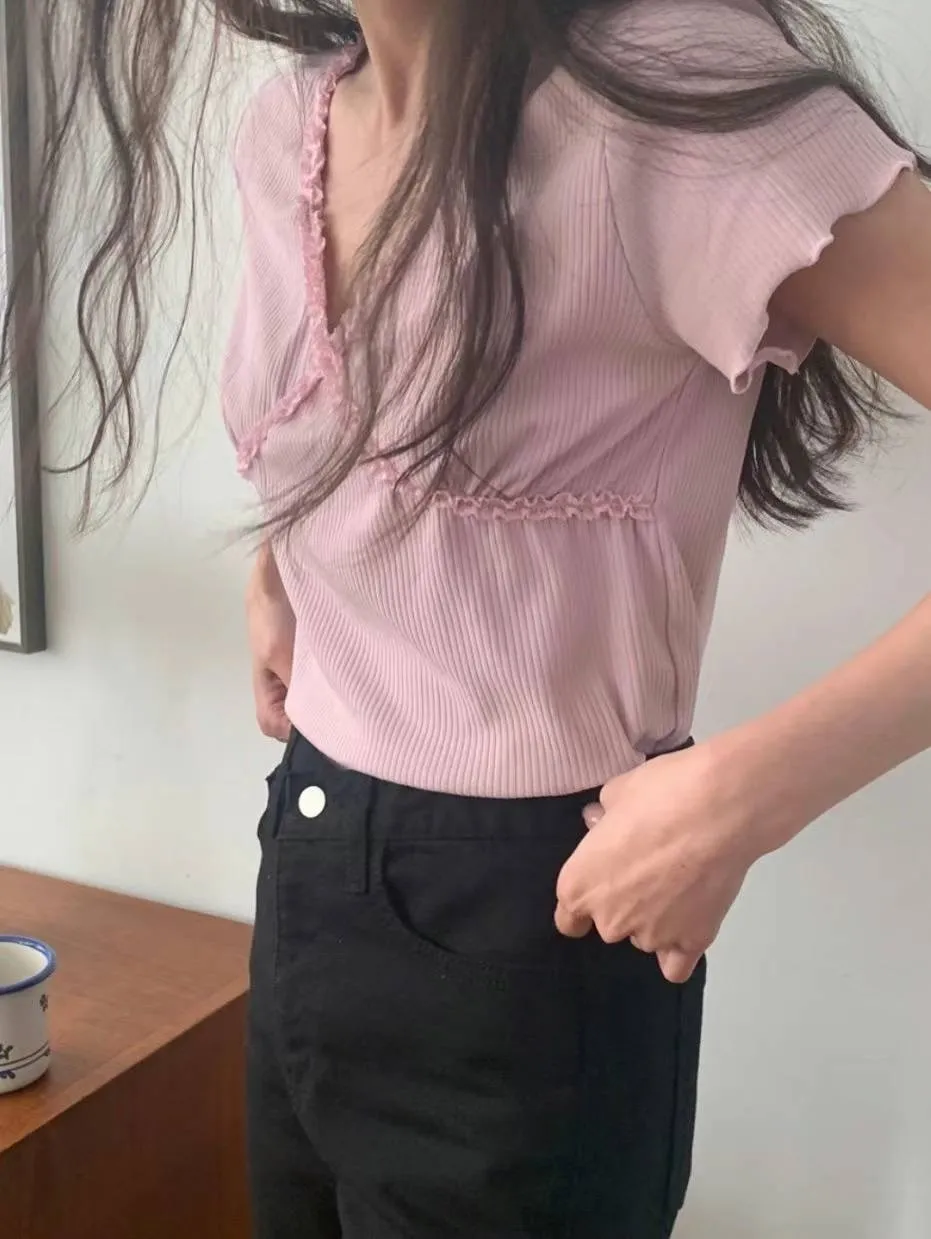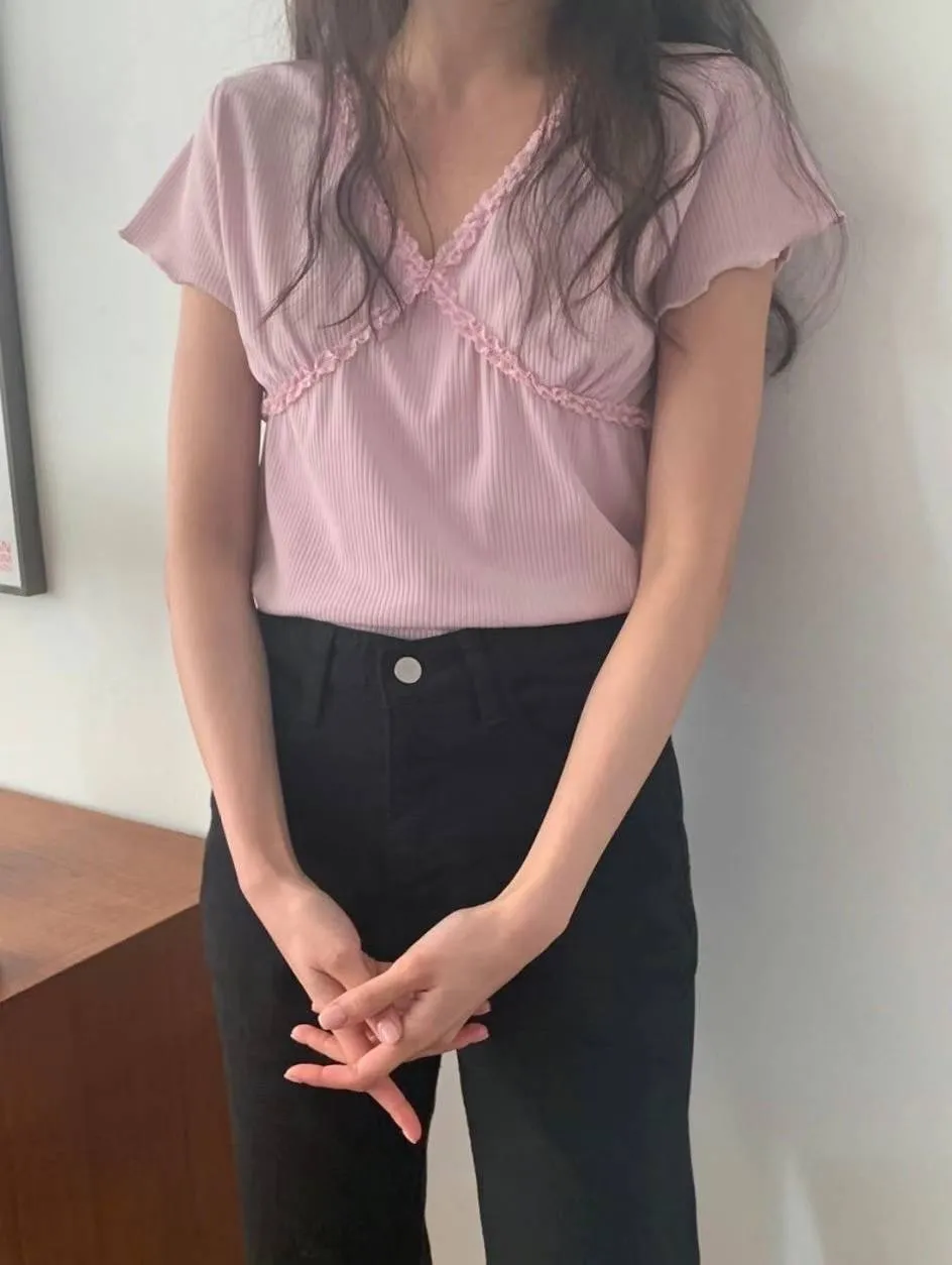 棉 薄款舒適 柔軟親膚 木耳滾邊 交叉蕾絲 視覺胸up