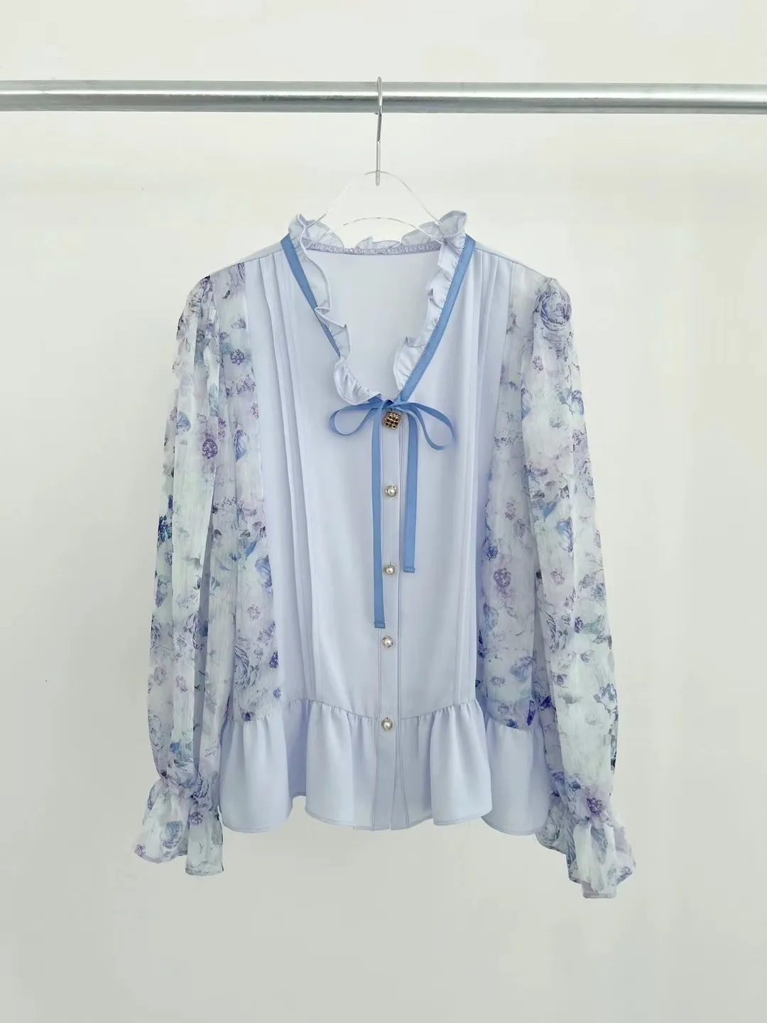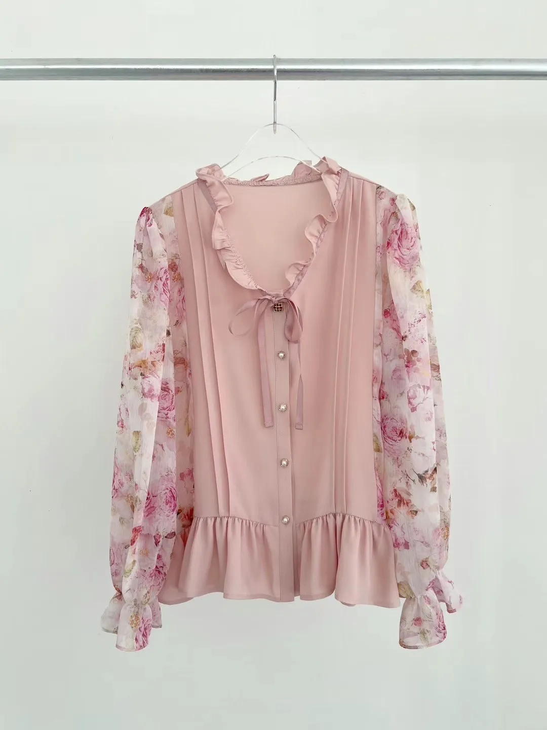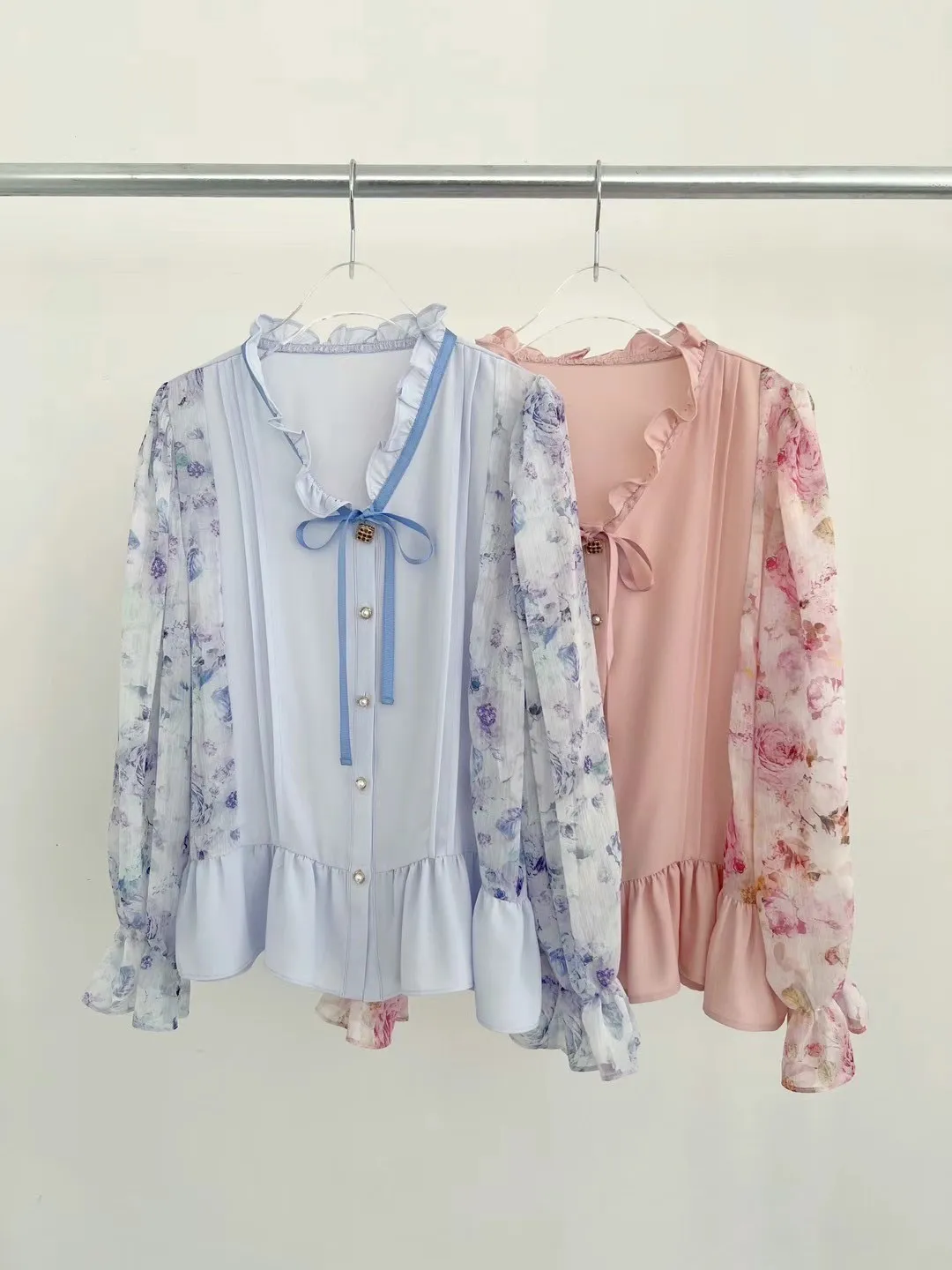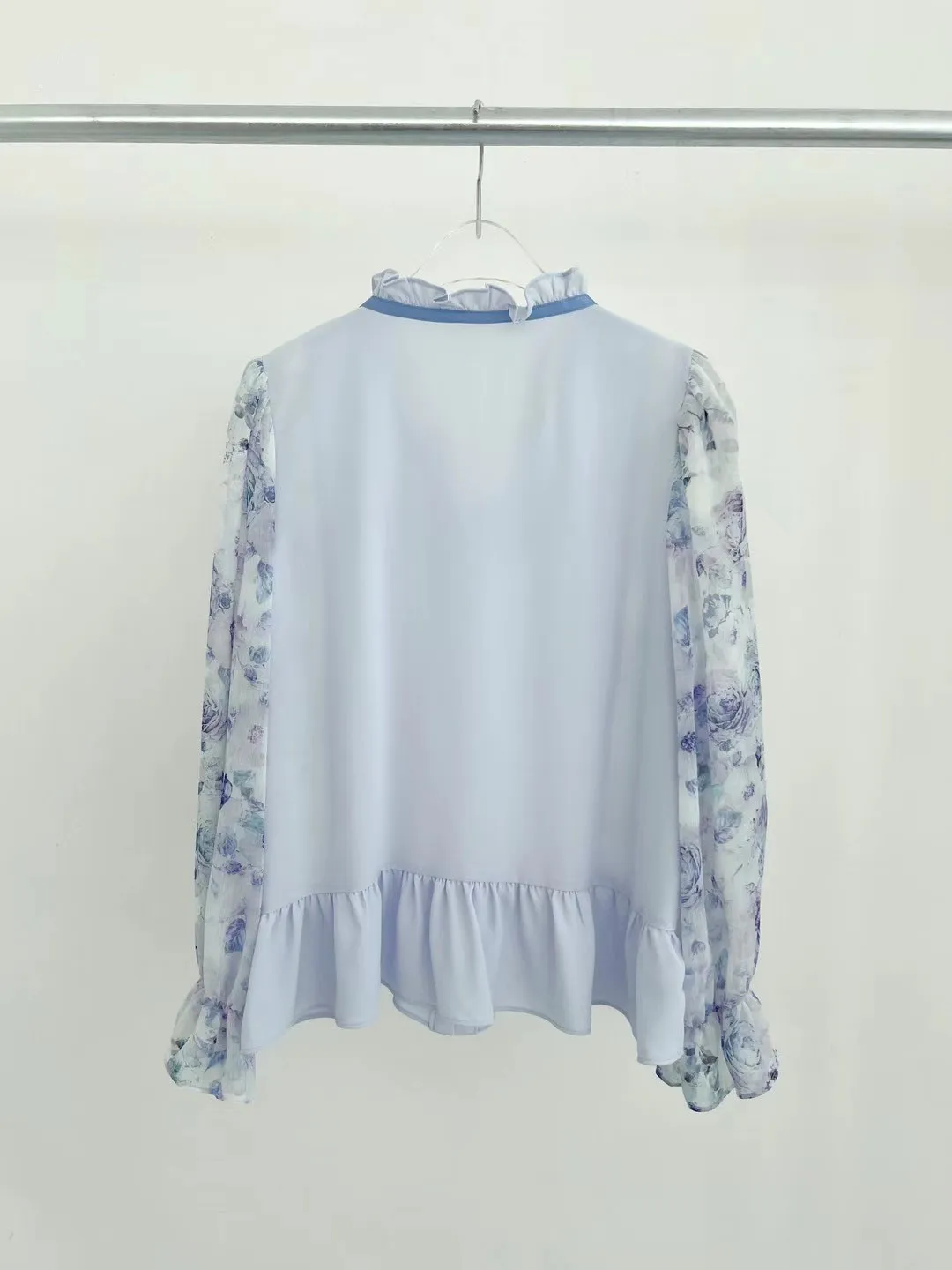 FA125高級雪紡玫瑰透光美袖上衣 粉 藍 官網價$1190 線上價$1160