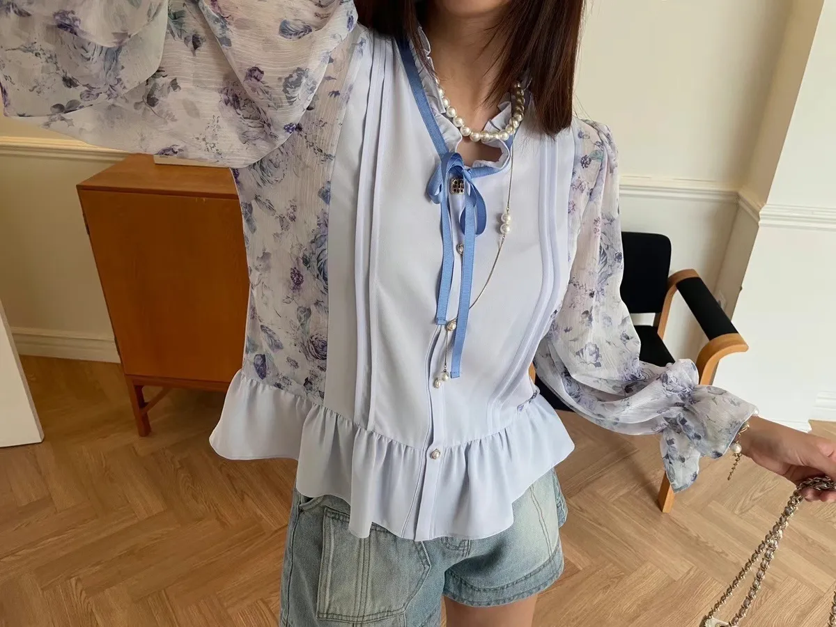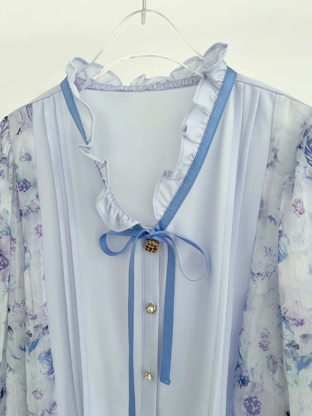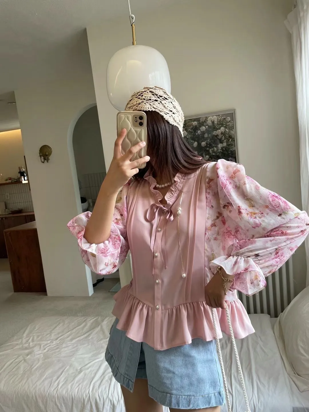 FA125高級雪紡玫瑰透光美袖上衣 粉 藍 官網價$1190 線上價$1160